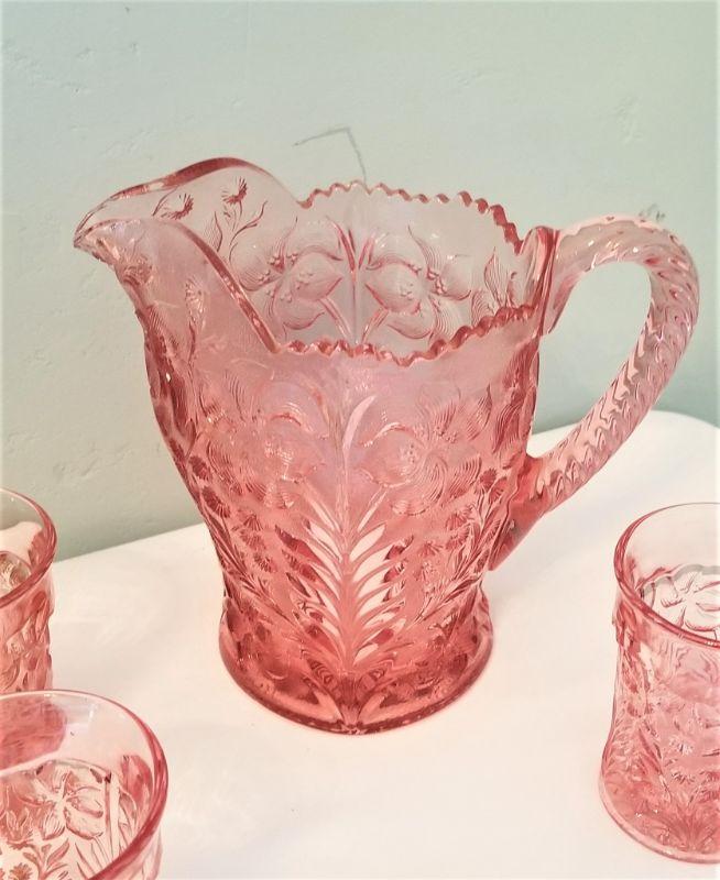 Lot #164  Contemporary Pink Glass Pitcher with 3 glasses