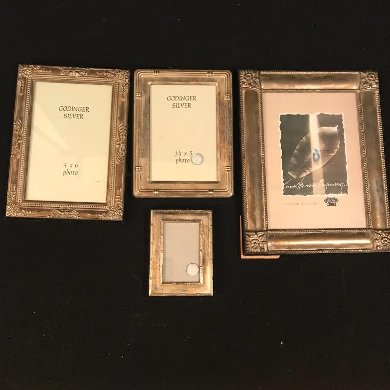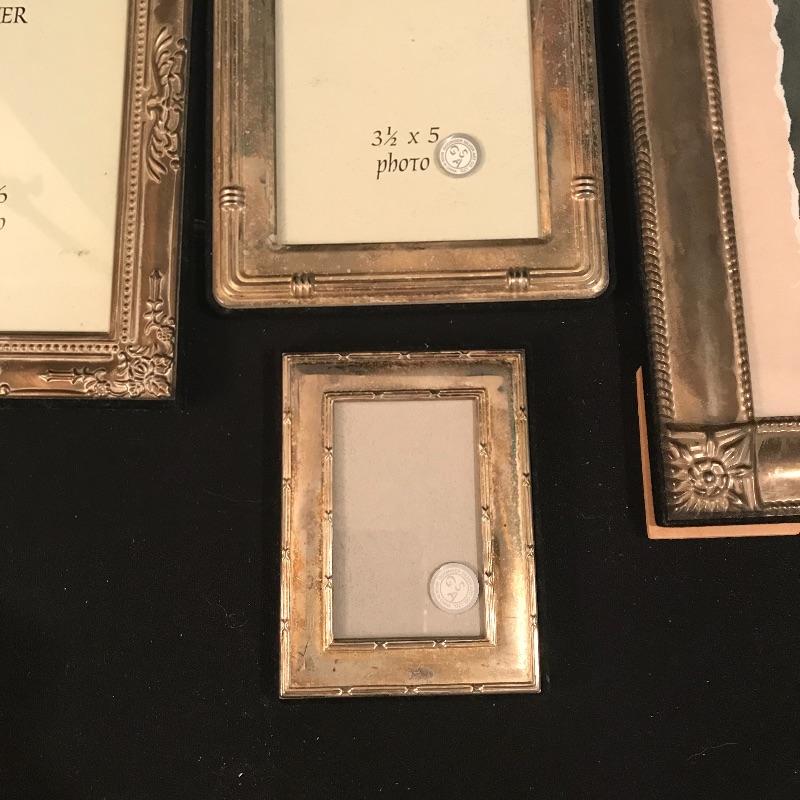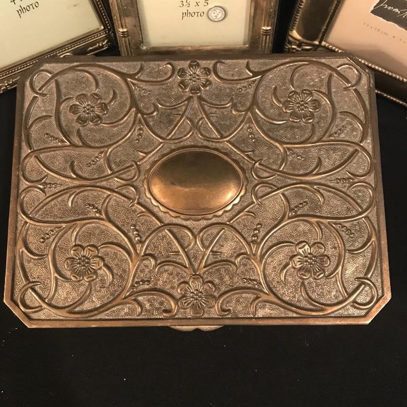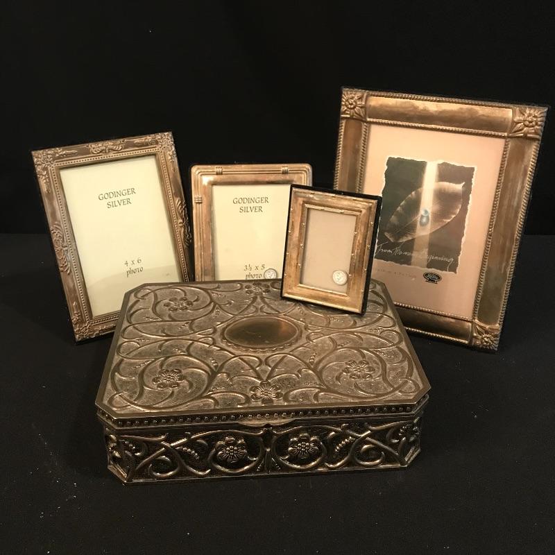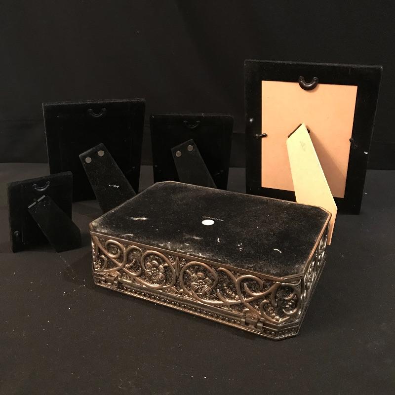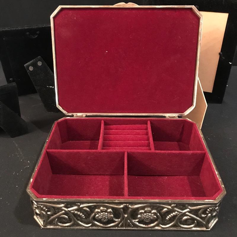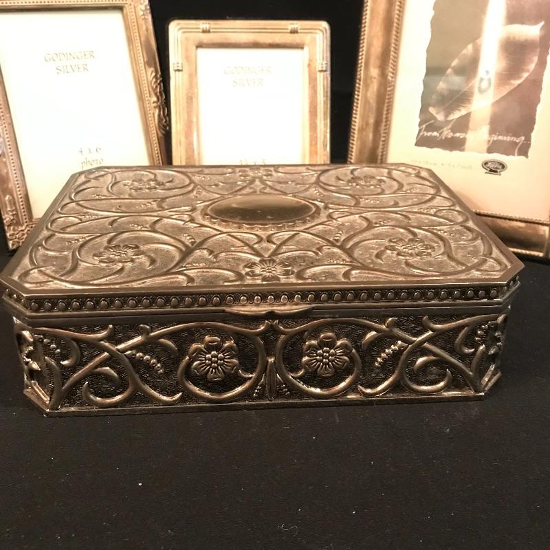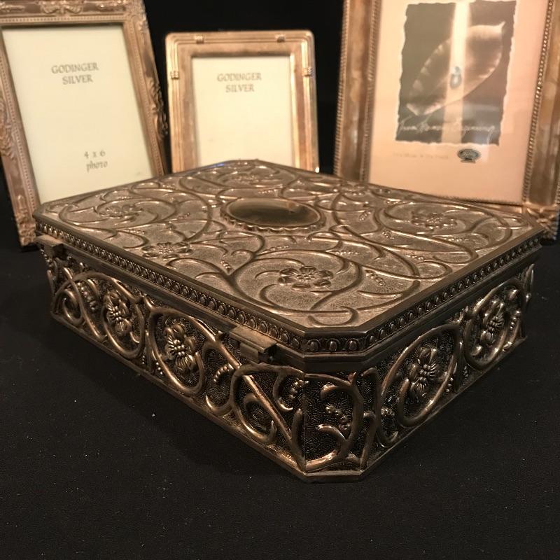 Stunning silver colored metal jewelry box with a bold red interior by Godinger. Box has intricate details throughout and even holds a spot for you or your loved one’s initials. Box measures 9.5” x 7” x 2.5”. Four silver colored frames accompany the jewelry box, they appear to all be Godingers as well, but we are unable to verify. Two of the glass panels have Godinger stickers which can be easily removed with the right chemicals. Frames come in each of the smaller traditional photo sizes. See photos. Shipping available.