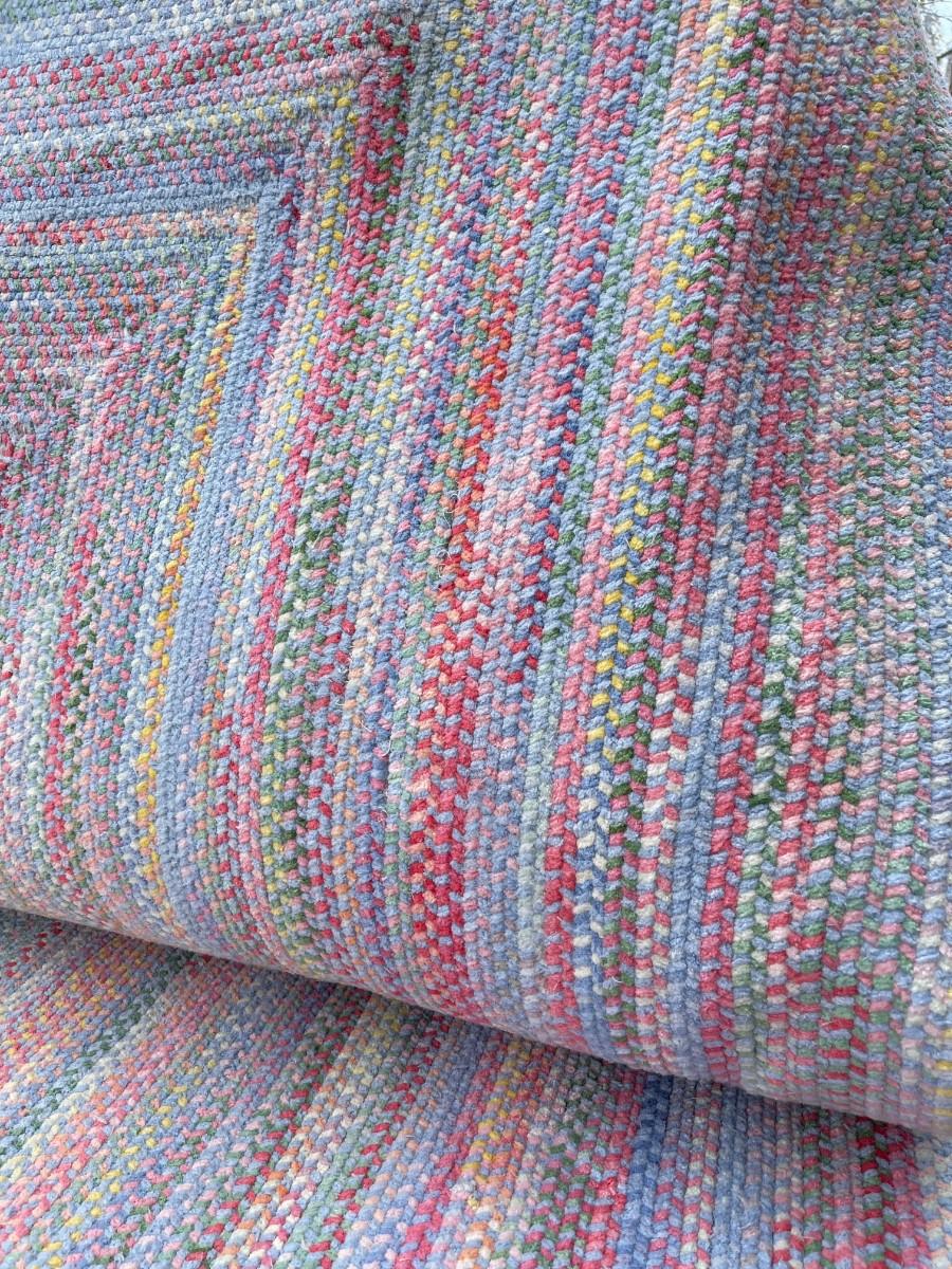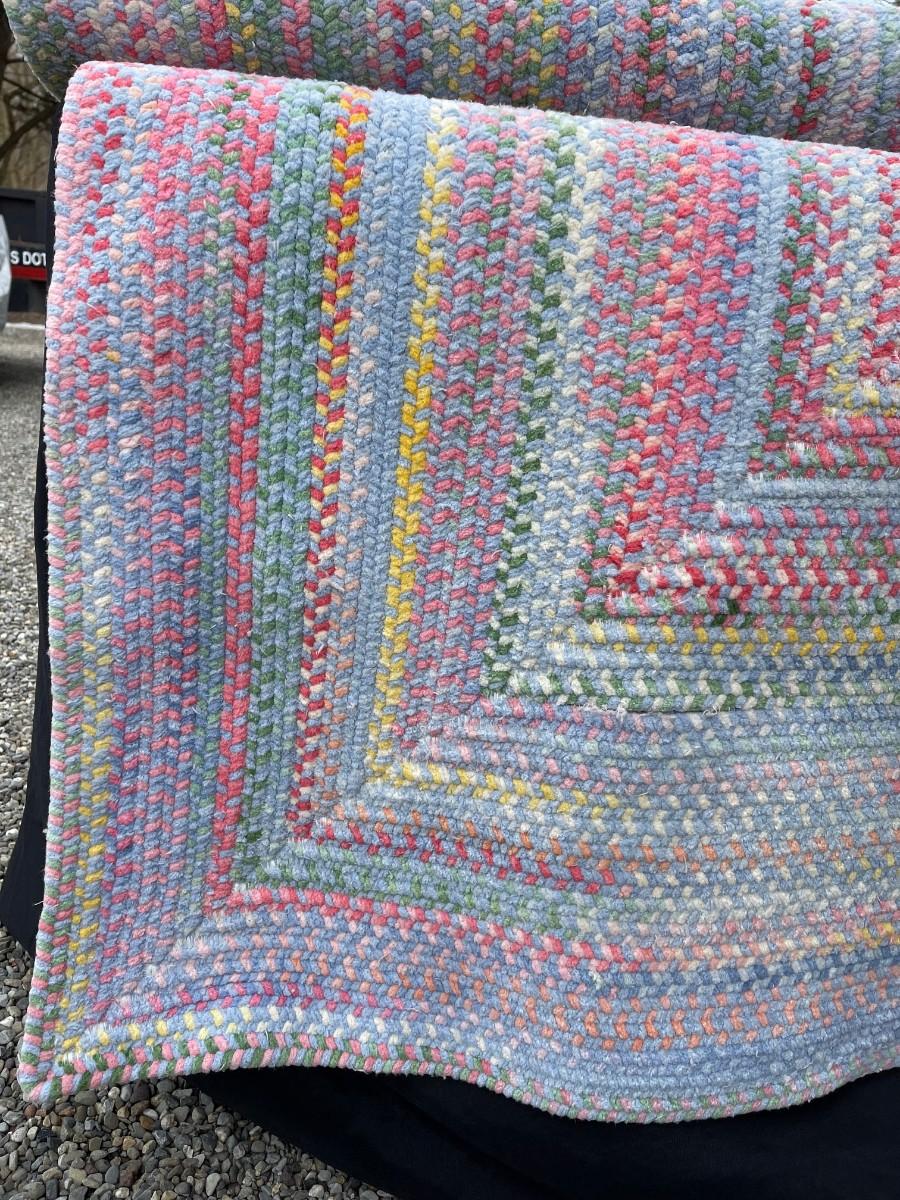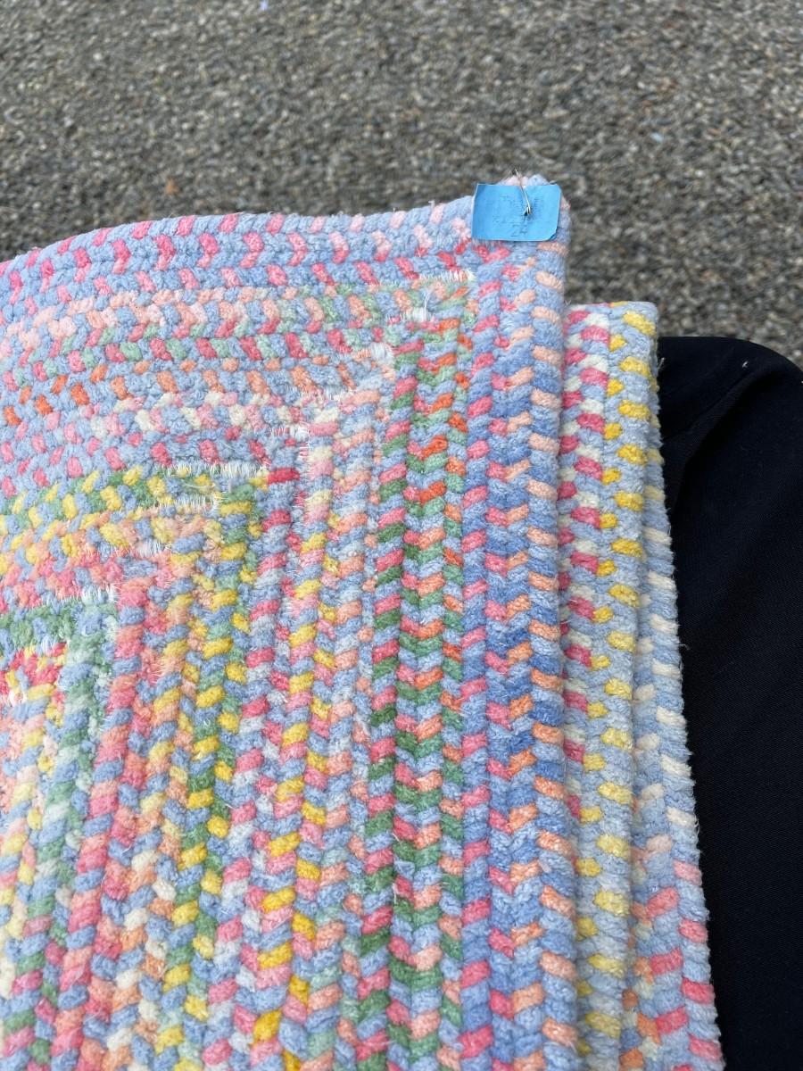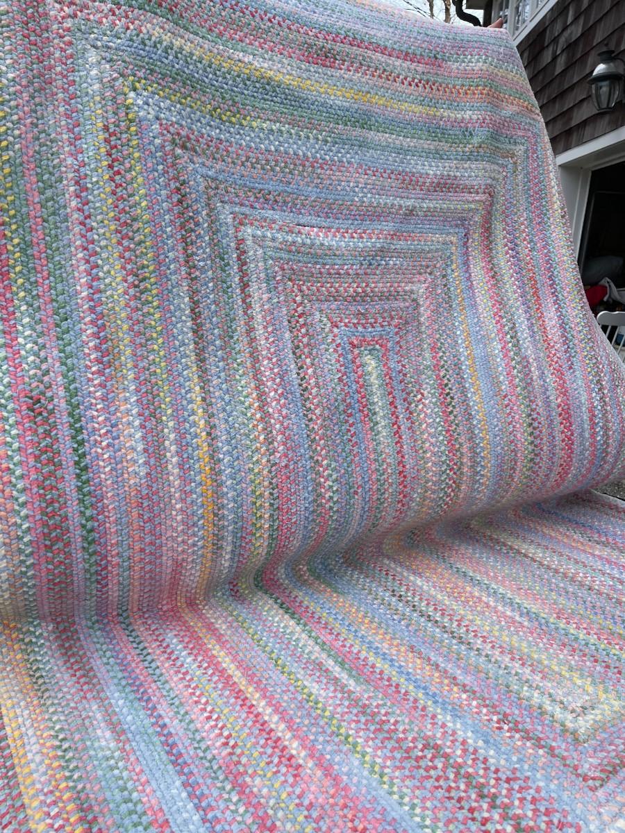 Hand braided rug, recently professionally cleaned, needs a little repair on 2 seams from being folded (small hand stitching), lovely colors.