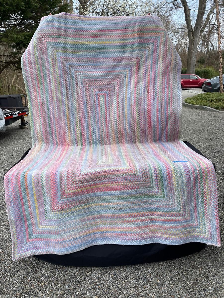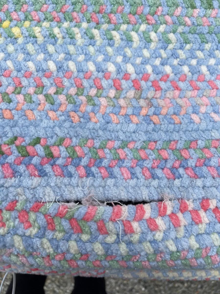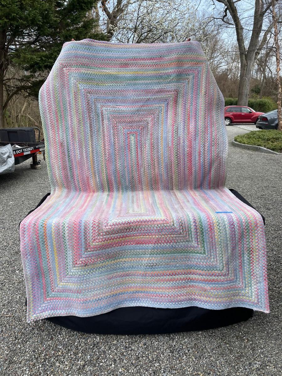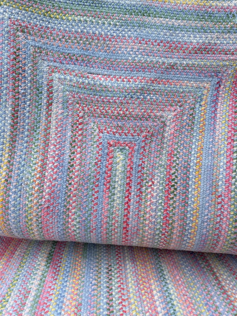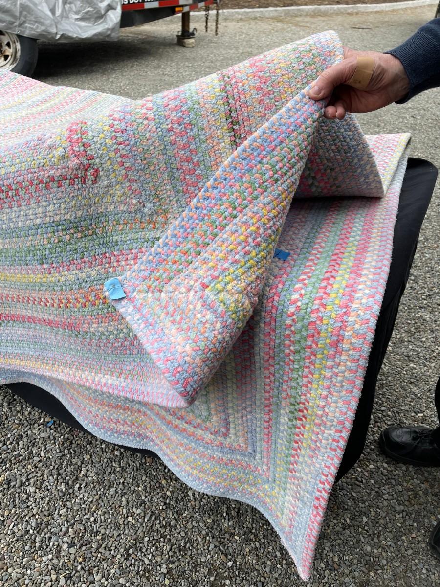 Hand braided rug, recently professionally cleaned, needs a little repair on 2 seams from being folded (small hand stitching), lovely colors.