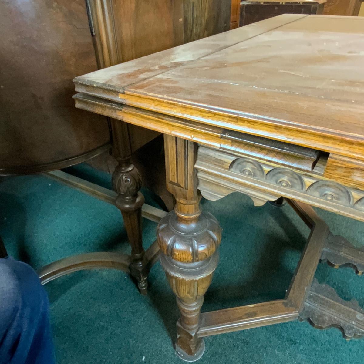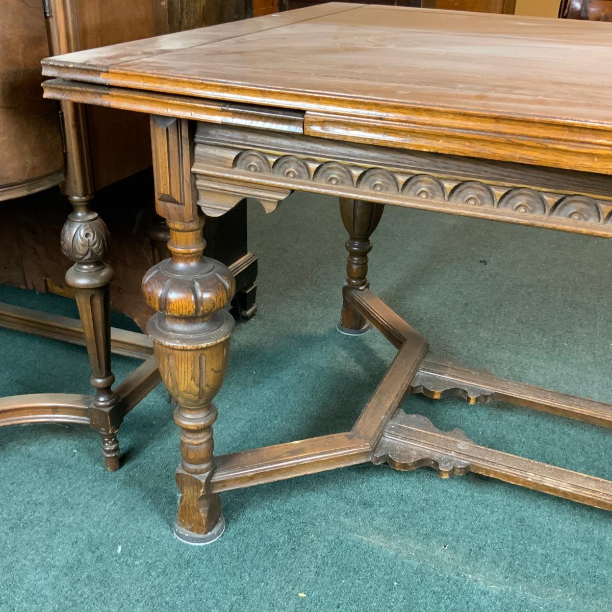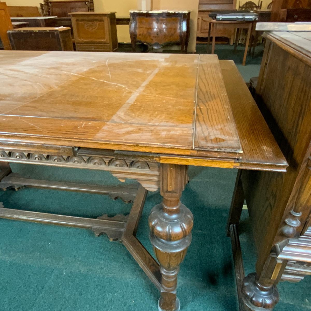 Impressive Tudor Dining Table. Has a great feature on the sides rather than using leaves to add more space. Adds an additional 14 inches on either side. Solid and well-Made. //::\\ Please see photos for details and condition. No attempt has been made to hide any imperfections. All items listed in this auction are warehouse items, and need to be cleaned. A majority of the items need restoration as well. All items are sold AS IS and WITHOUT GUARANTEE. If you are uncertain about an item, DO NOT BID. Due to the nature of this online auction in-person inspection is HIGHLY recommended. All Sales are FINAL. Pick Up Times are FIRM. Please confirm with your own schedule that you can pick up in the scheduled times listed in the Terms and Conditions. Any questions please message the auctioneer. DO NOT Contact The Harp Gallery.