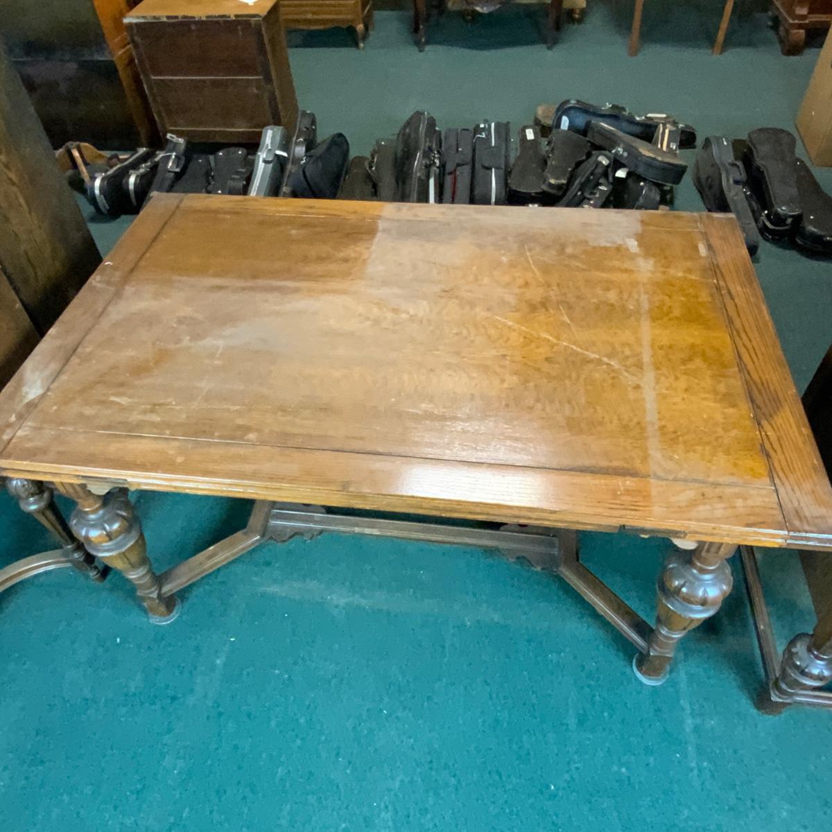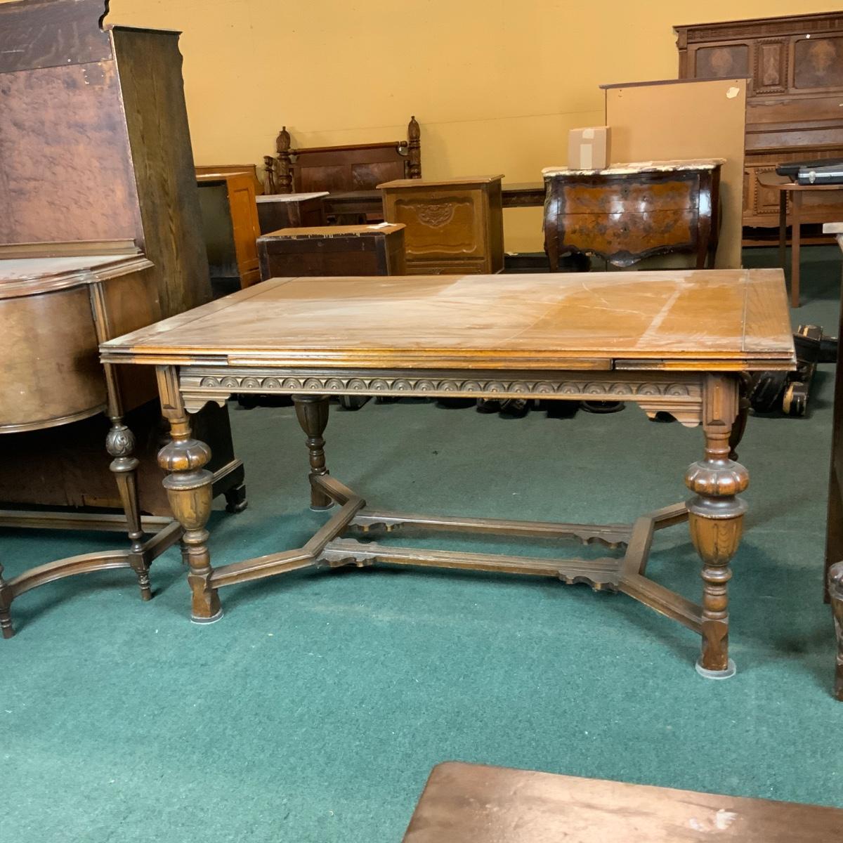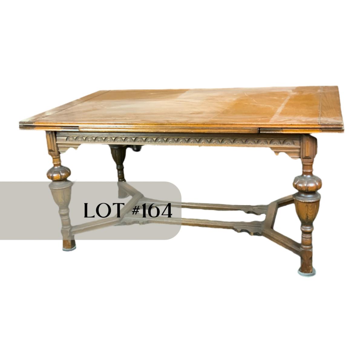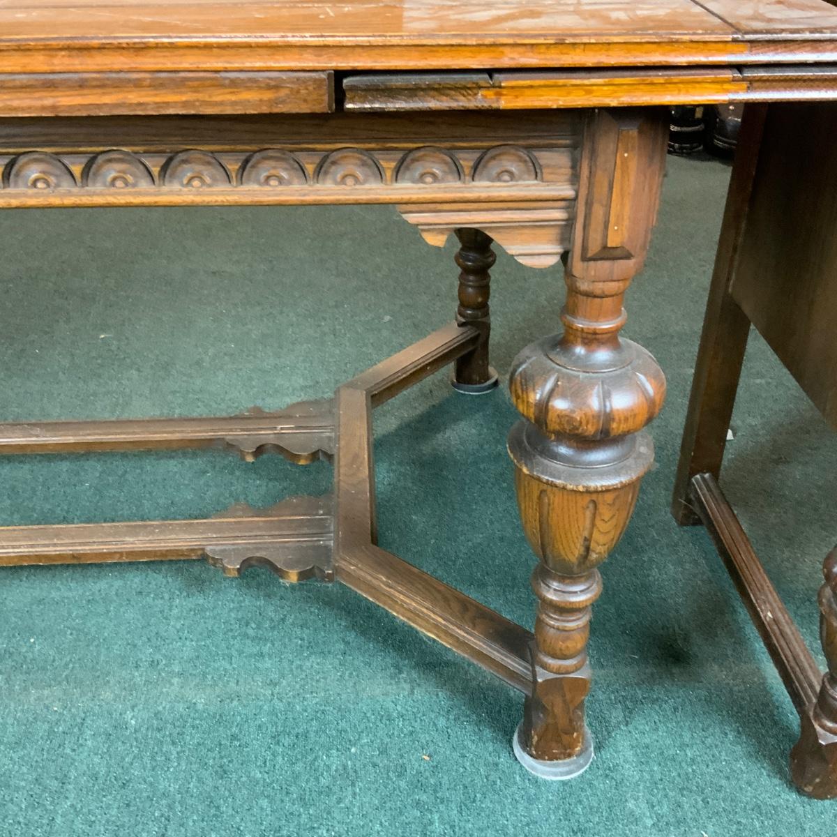 Impressive Tudor Dining Table. Has a great feature on the sides rather than using leaves to add more space. Adds an additional 14 inches on either side. Solid and well-Made. //::\\ Please see photos for details and condition. No attempt has been made to hide any imperfections. All items listed in this auction are warehouse items, and need to be cleaned. A majority of the items need restoration as well. All items are sold AS IS and WITHOUT GUARANTEE. If you are uncertain about an item, DO NOT BID. Due to the nature of this online auction in-person inspection is HIGHLY recommended. All Sales are FINAL. Pick Up Times are FIRM. Please confirm with your own schedule that you can pick up in the scheduled times listed in the Terms and Conditions. Any questions please message the auctioneer. DO NOT Contact The Harp Gallery.