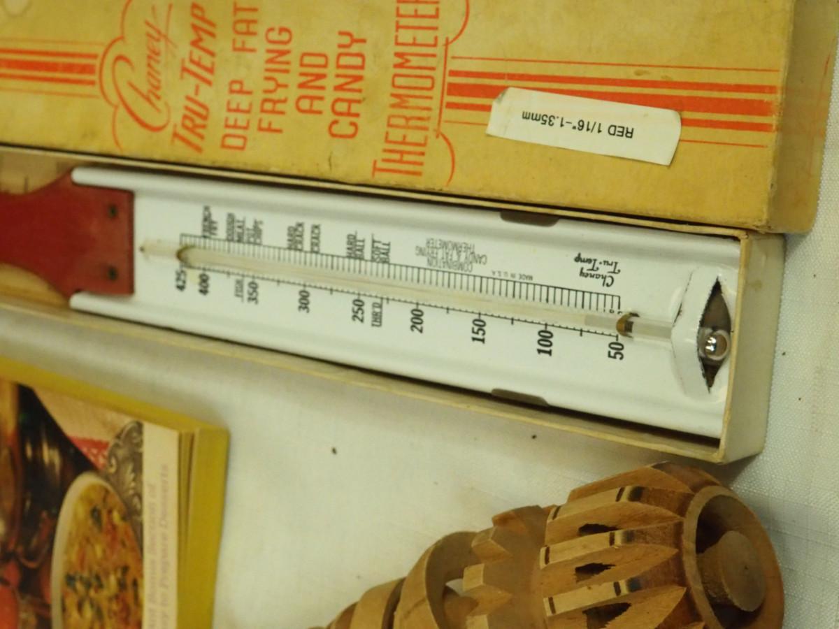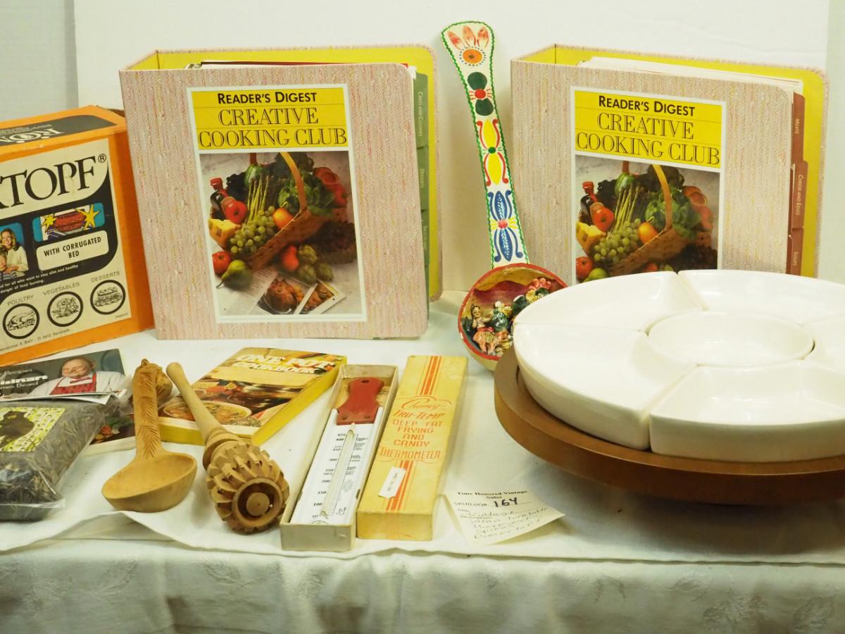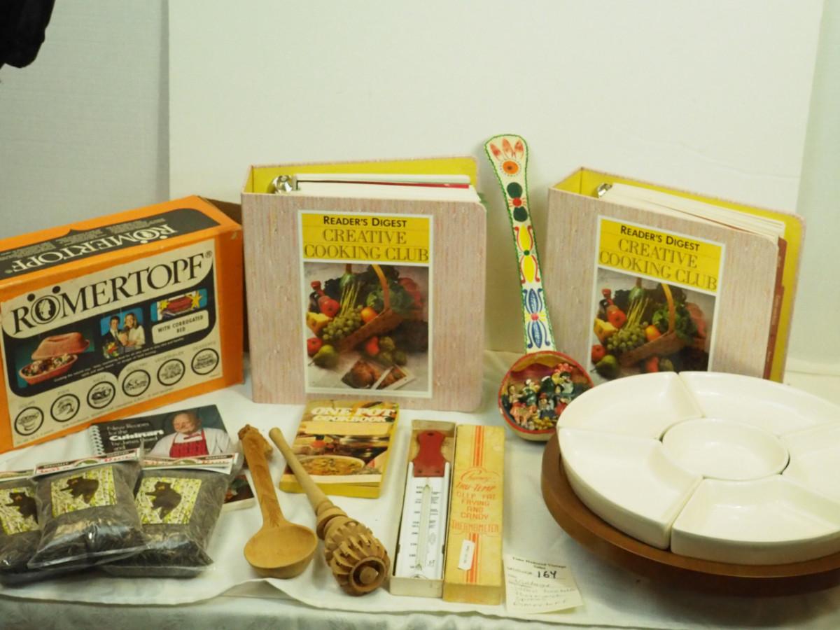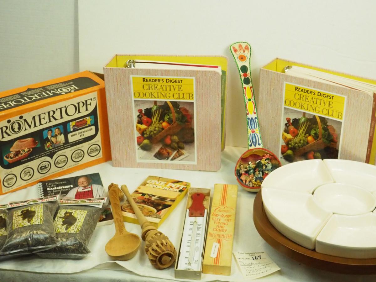 Lot 164- Kitchen collectibles Romertopf ceramic baker, new old stock, Japanese turn table with white china dishes, Full unused recipe binders, Wild Rice from Minnesota. Vintage candy thermometer.