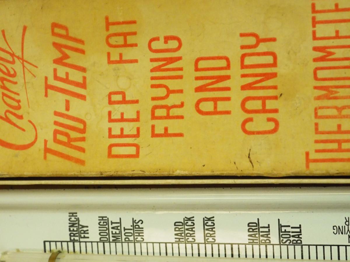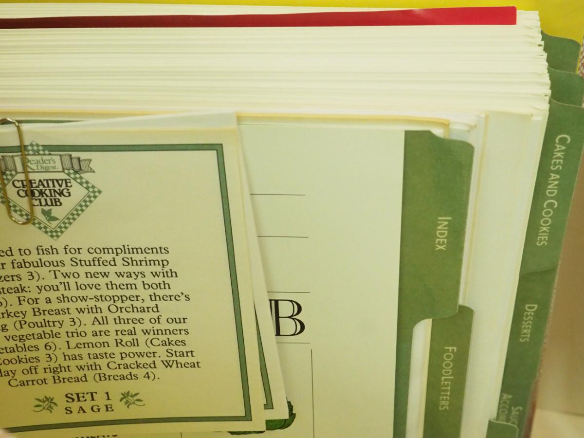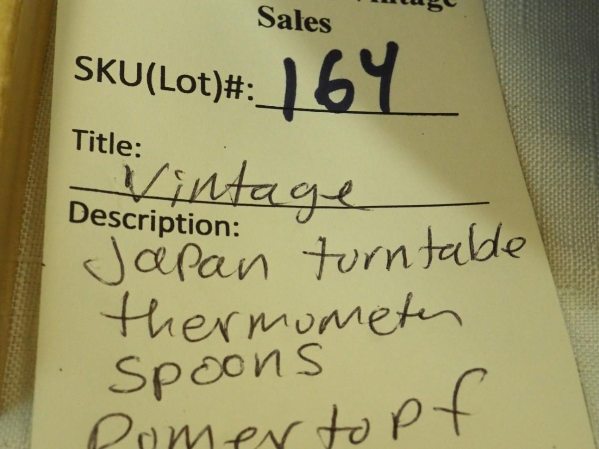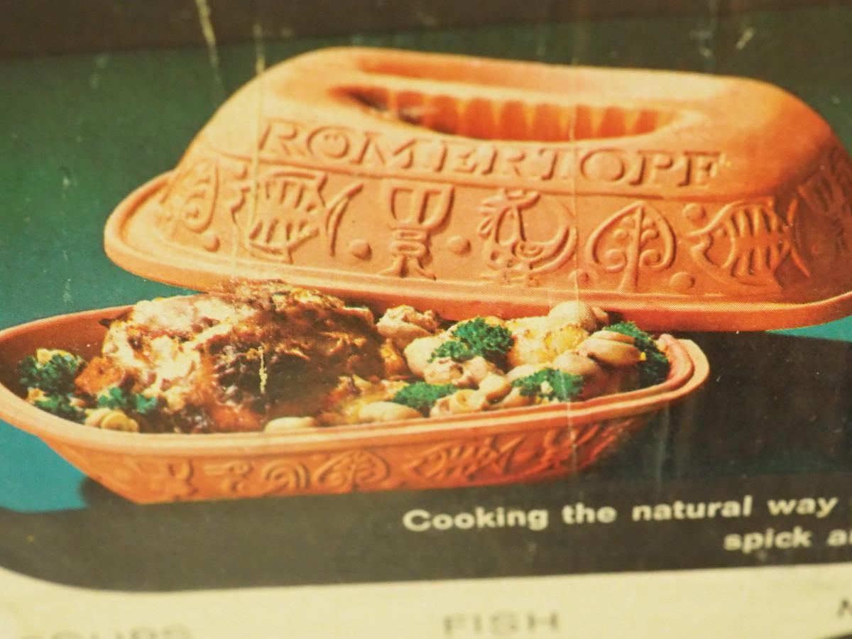 Lot 164- Kitchen collectibles Romertopf ceramic baker, new old stock, Japanese turn table with white china dishes, Full unused recipe binders, Wild Rice from Minnesota. Vintage candy thermometer.