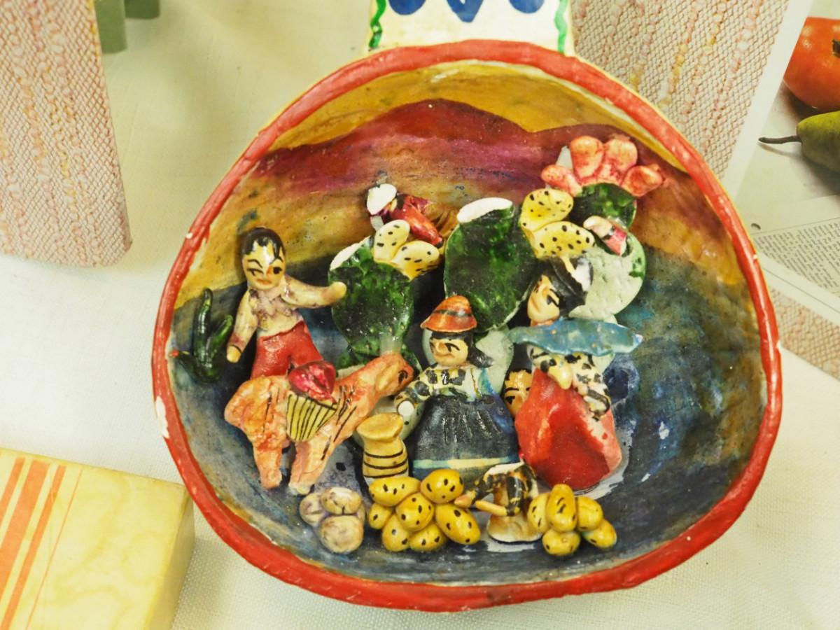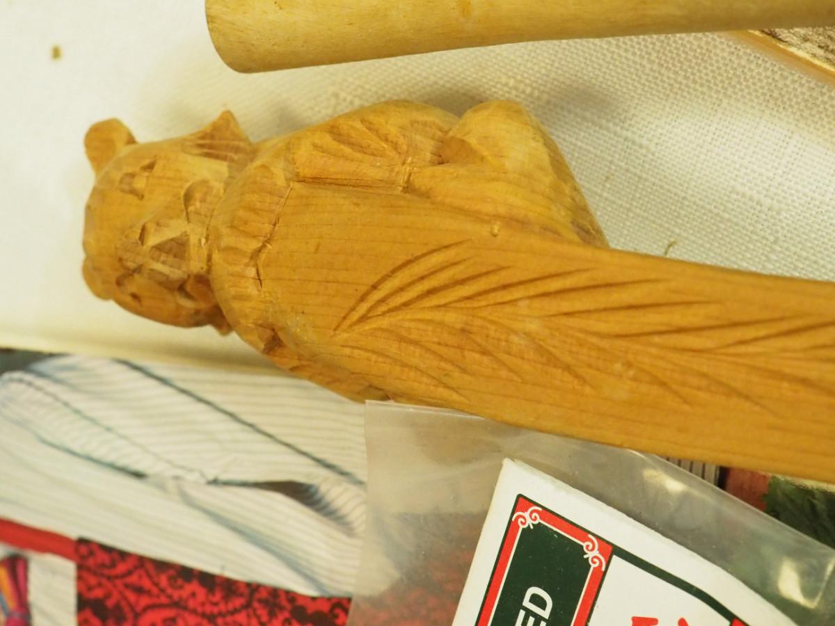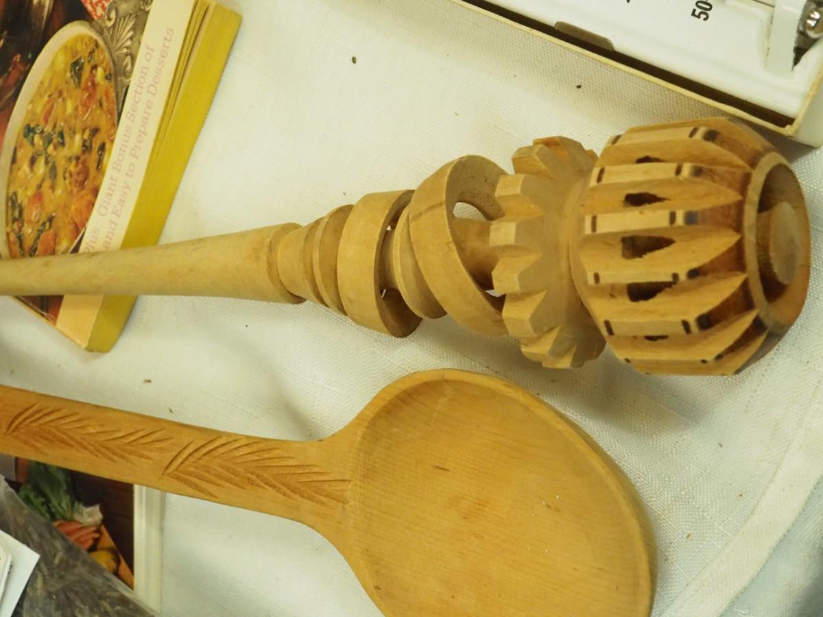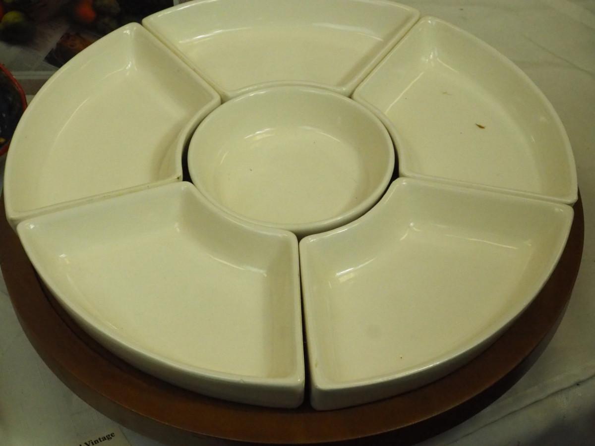 Lot 164- Kitchen collectibles Romertopf ceramic baker, new old stock, Japanese turn table with white china dishes, Full unused recipe binders, Wild Rice from Minnesota. Vintage candy thermometer.