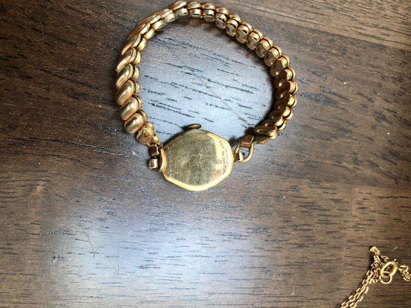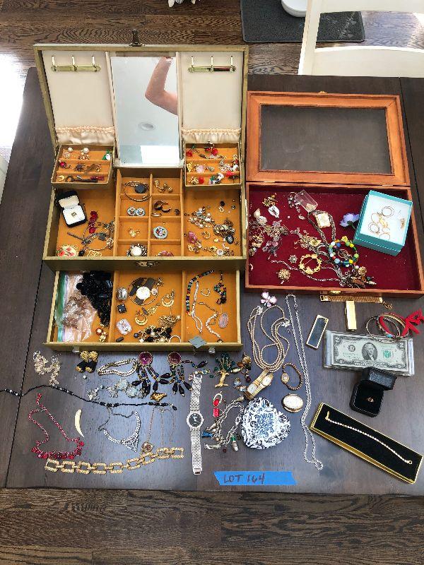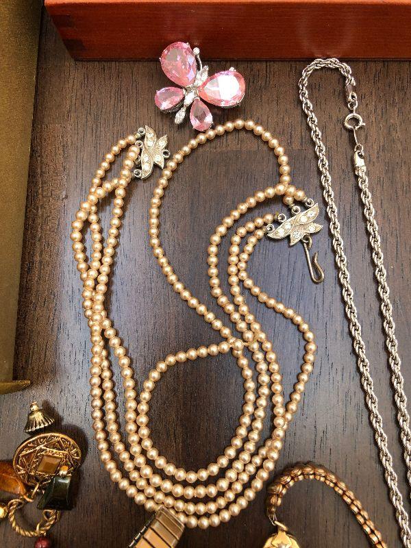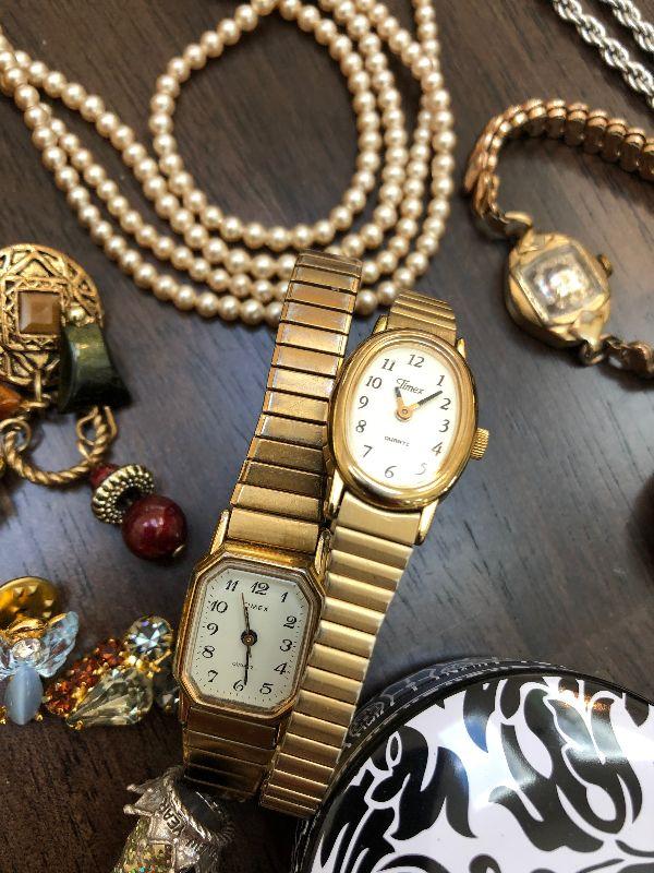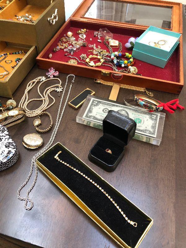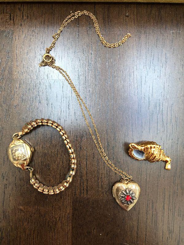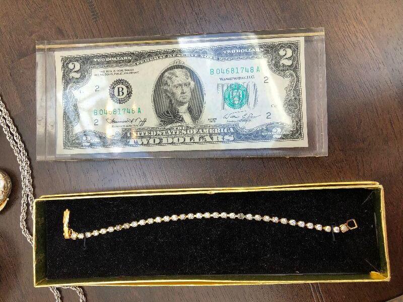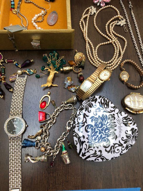 2 jewelry boxes, Brighton charm bracelet, 10K Bulova gold plated vintage watch (Serial # 670191) sealed $2 bill and various other pieces as shown in pictures.