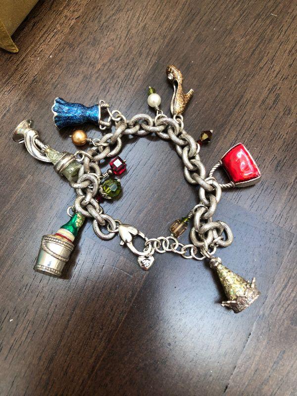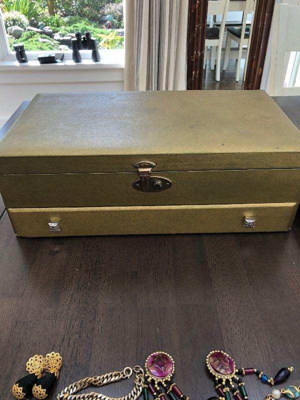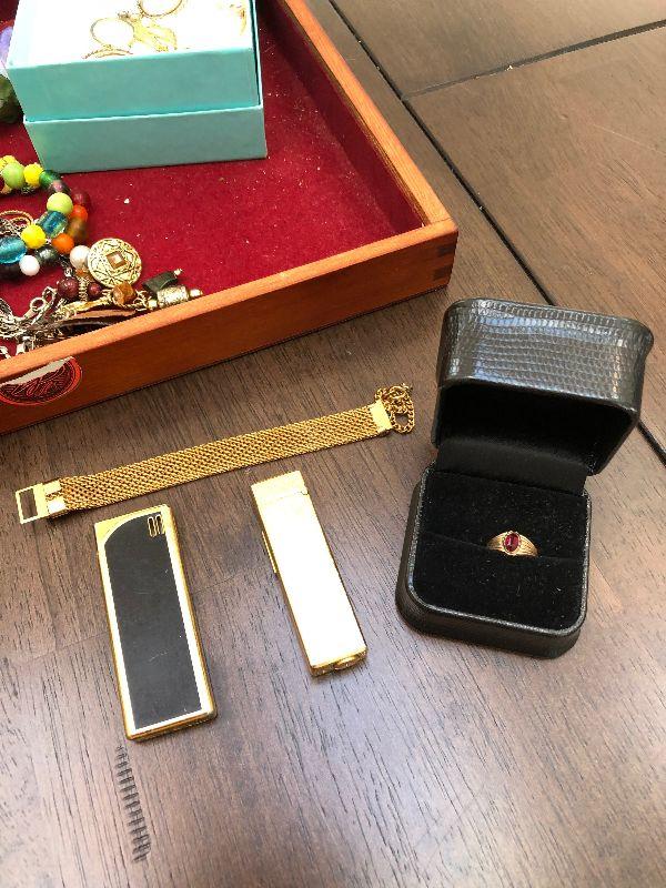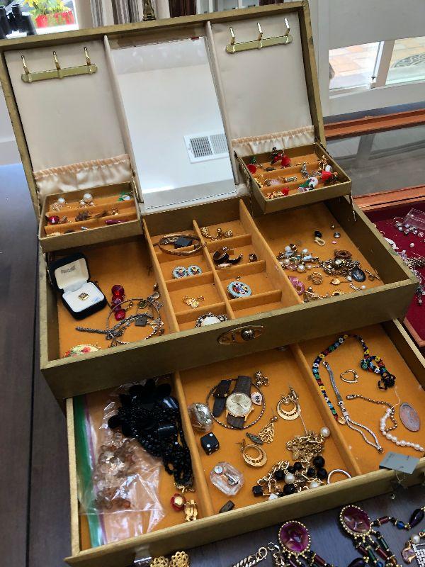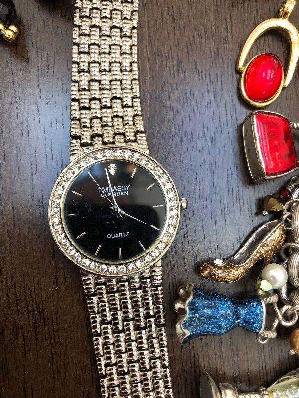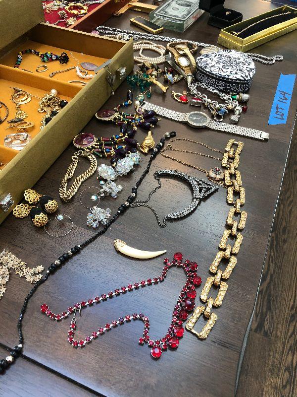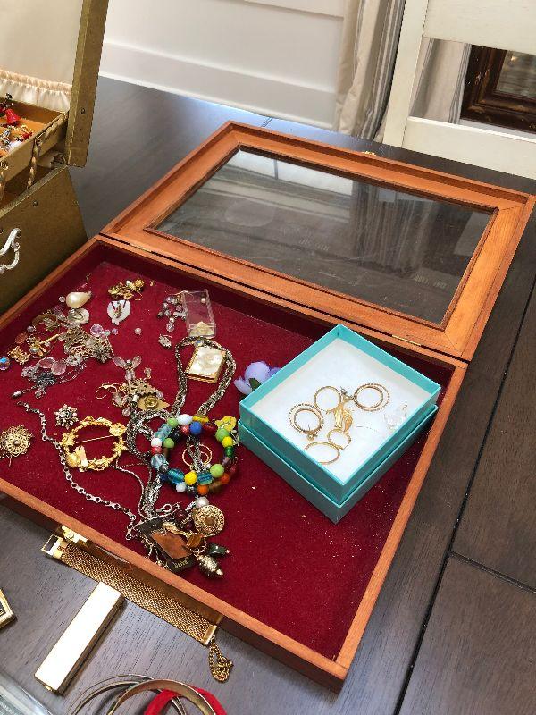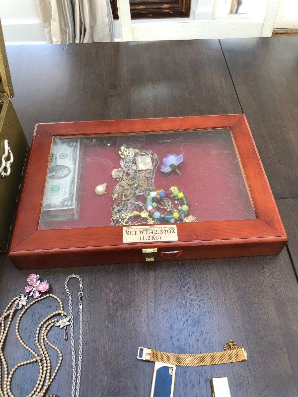 2 jewelry boxes, Brighton charm bracelet, 10K Bulova gold plated vintage watch (Serial # 670191) sealed $2 bill and various other pieces as shown in pictures.