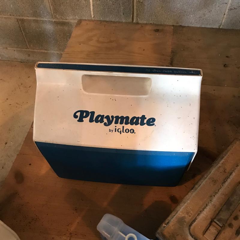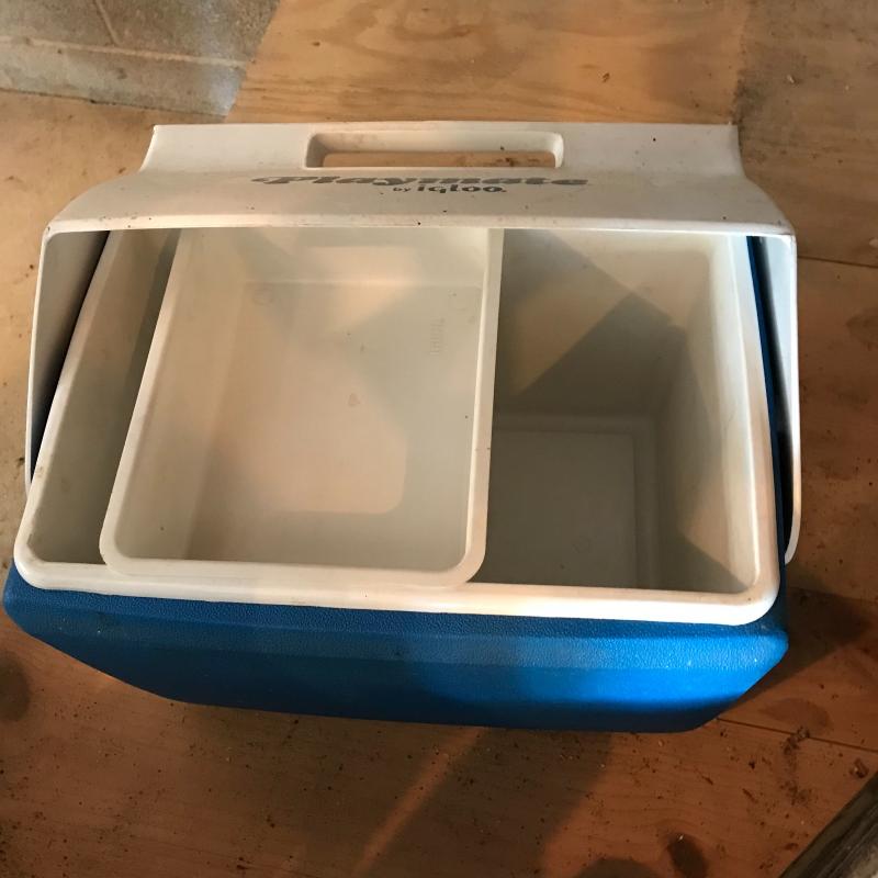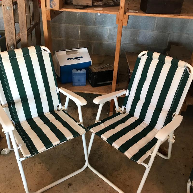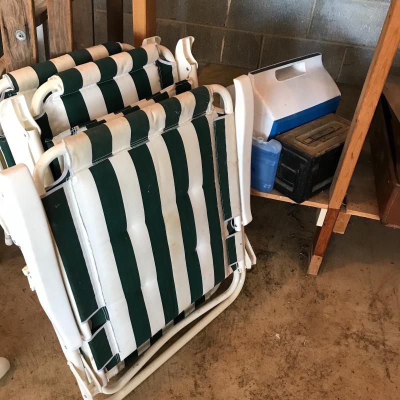 Playmate cooler in like-new condition, black strong box and three green and white striped lawn chairs. One is a recliner lounger and two are chairs. This lot is available for local pick up in Flat Rock, NC only.