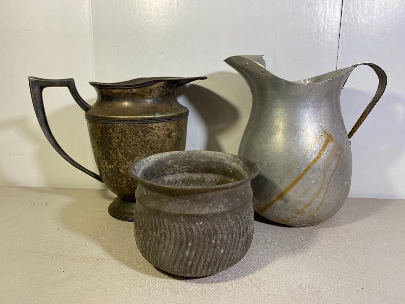Lot# 164 Metal Pitcher Pot Lot Midsilcraft Pitcher Silver Plate Aluminum stamped Brass Pot