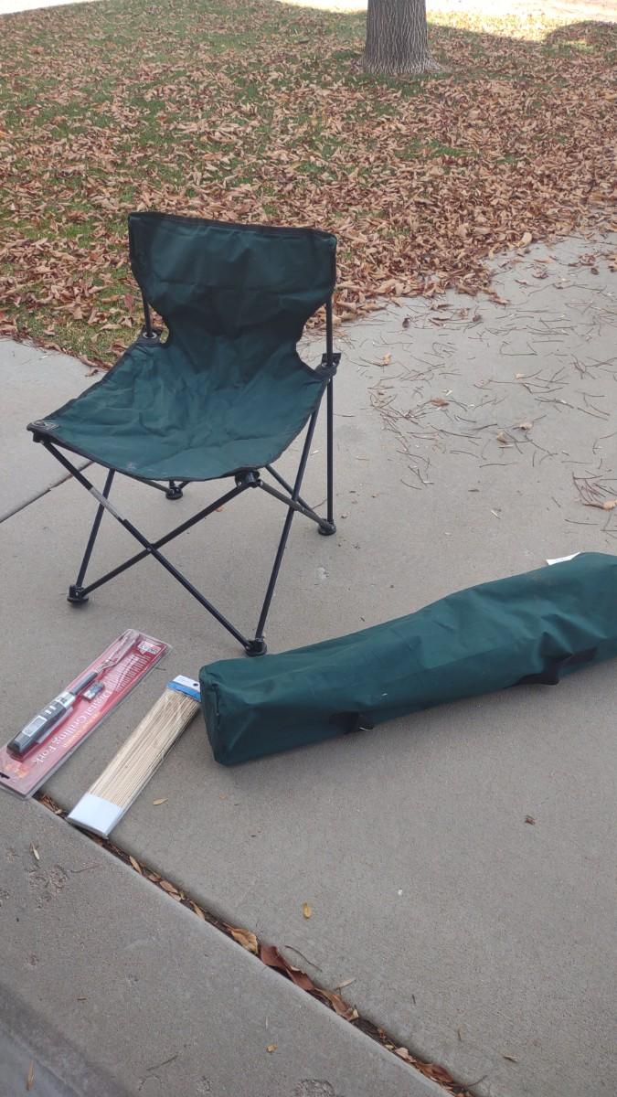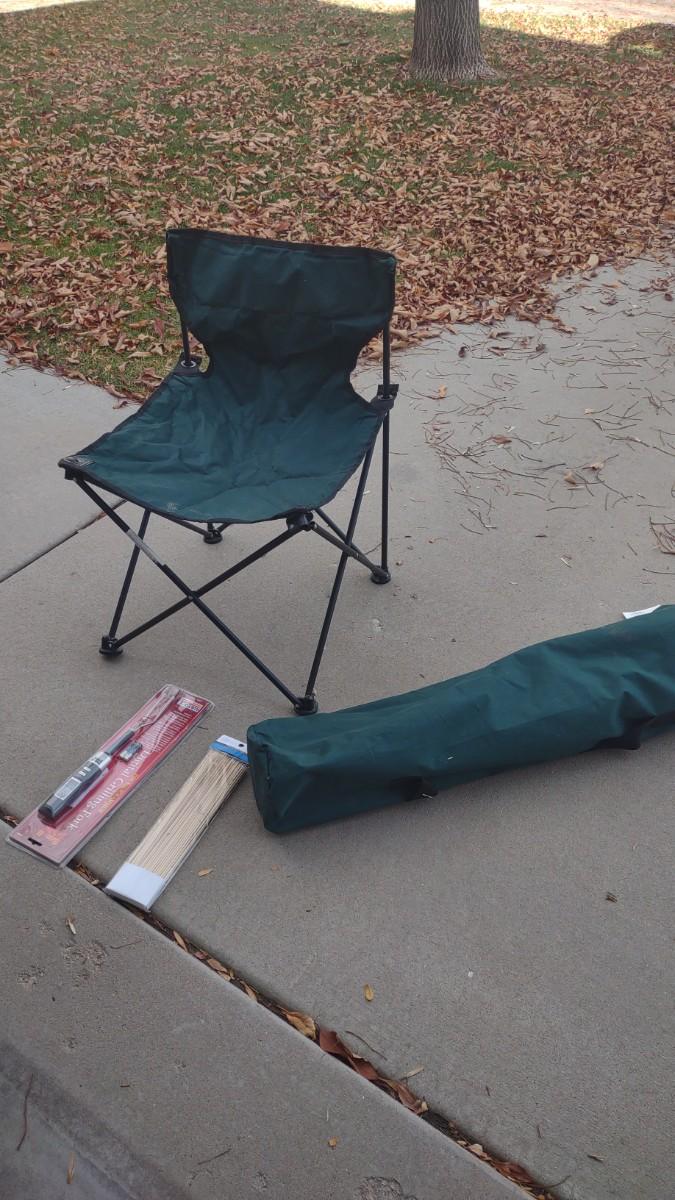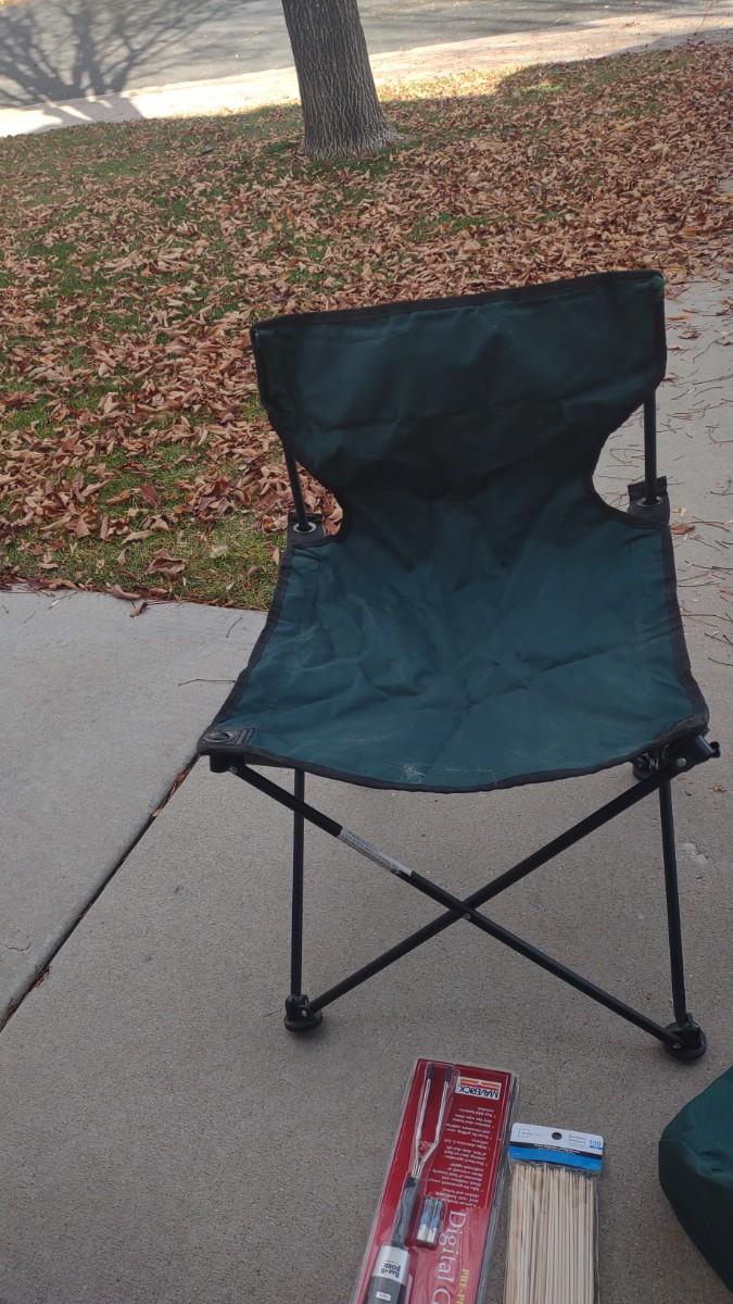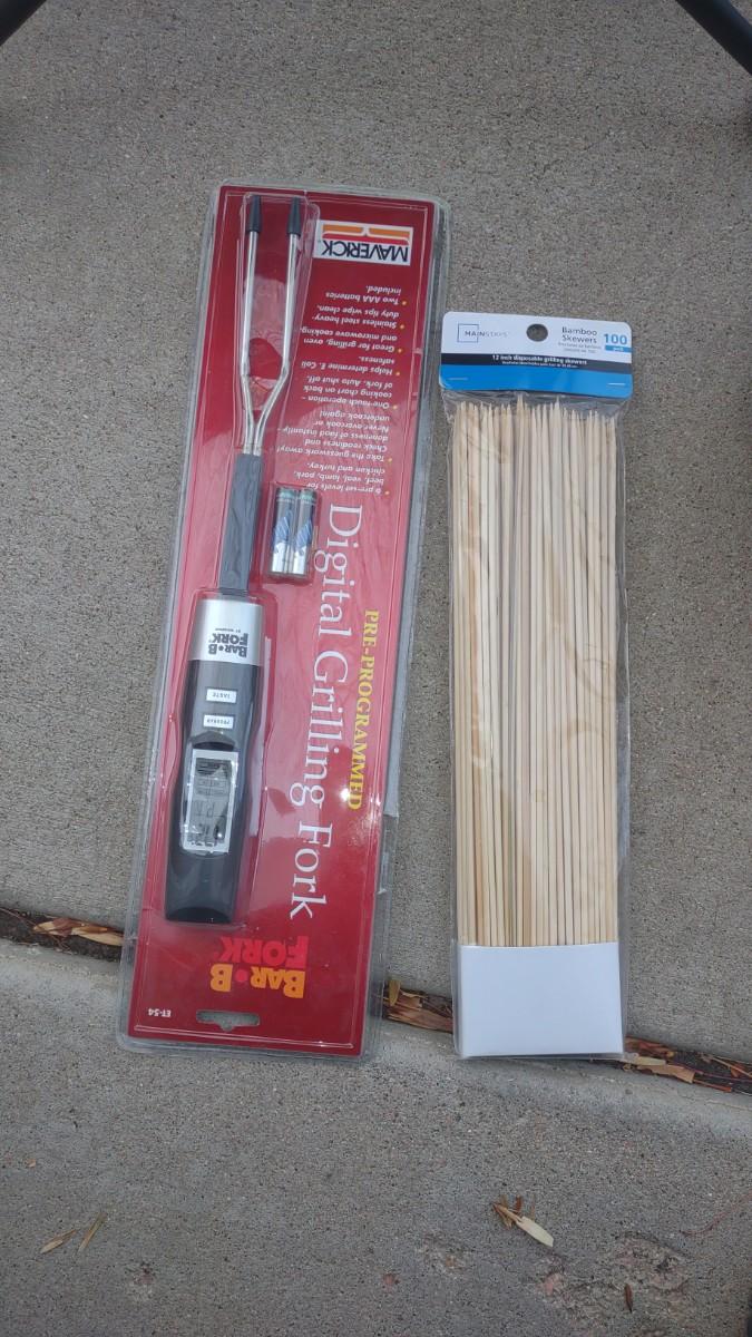 TWO MEDIUM SIZE AND 2 LARGE SIZE FOLDING CHAIRS, DIGITAL GRILLING FORK AND BAMBOO SKEWERS