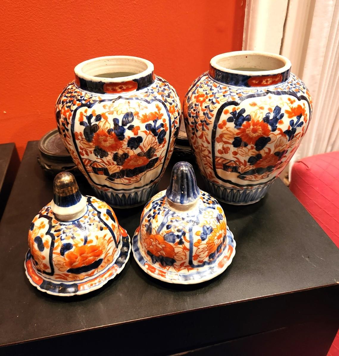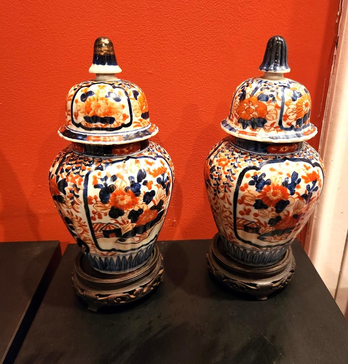 Lovely, classic pair of antique Chinese Imari vases on wooden stands - 1 lid has a slight chip to rim - 10" tall with stand, 9"' tall without. Good antique condition - vibrant colors. Early 20th century.