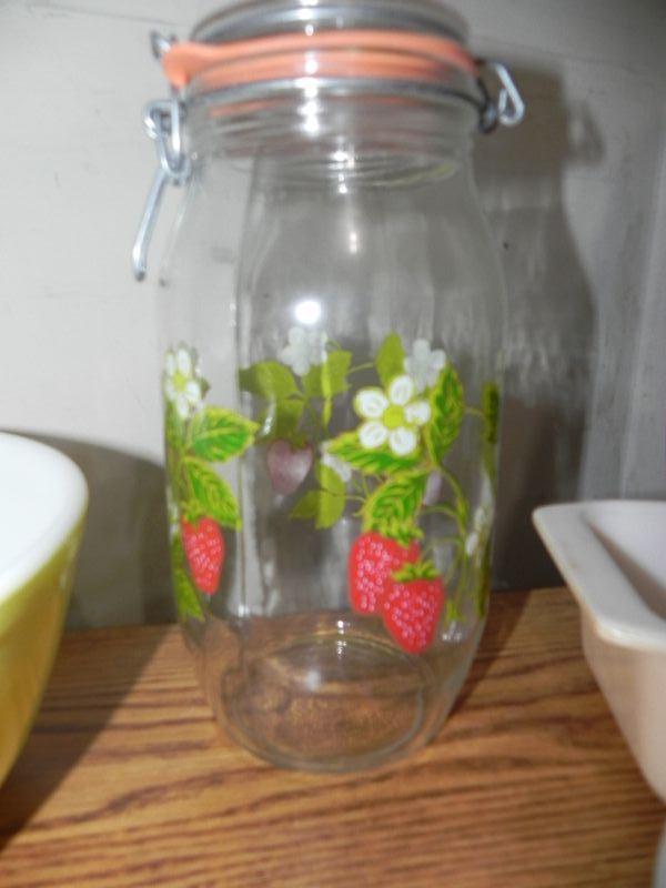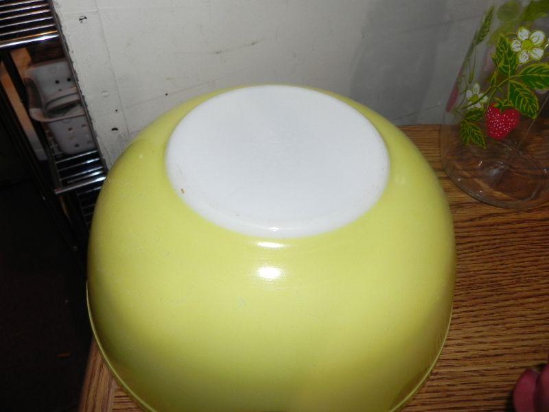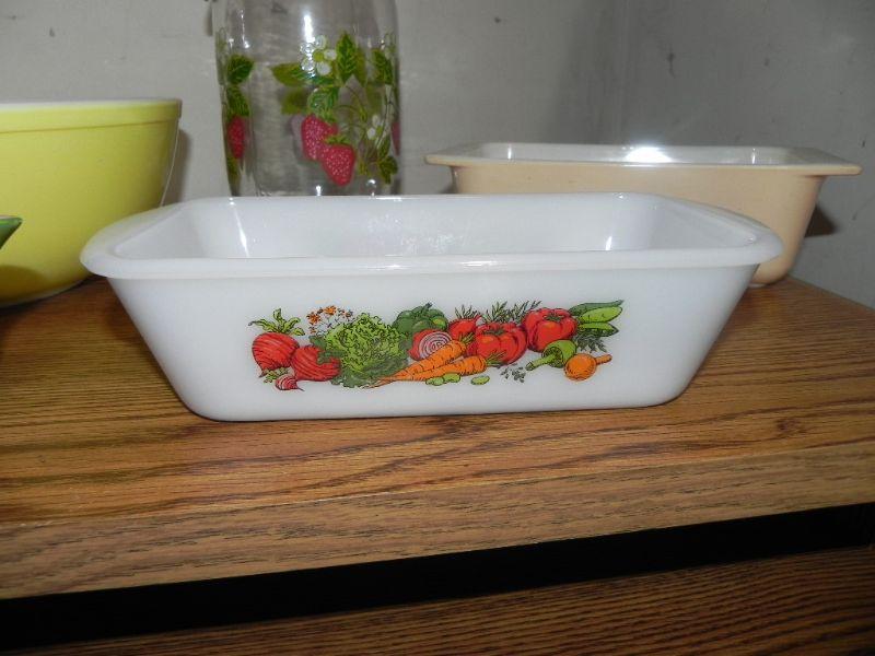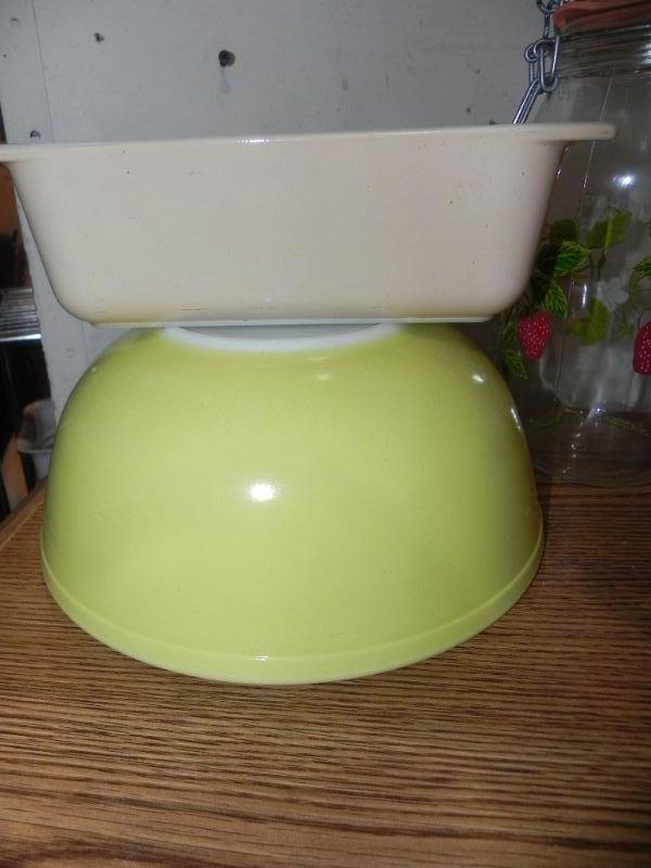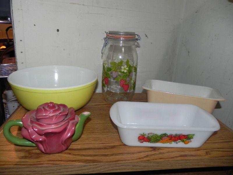 PYREX MIXING BOWL, 2 BAKING DISHES , CABBAGE TEA KETTLE, GLASS STORAGE JAR
