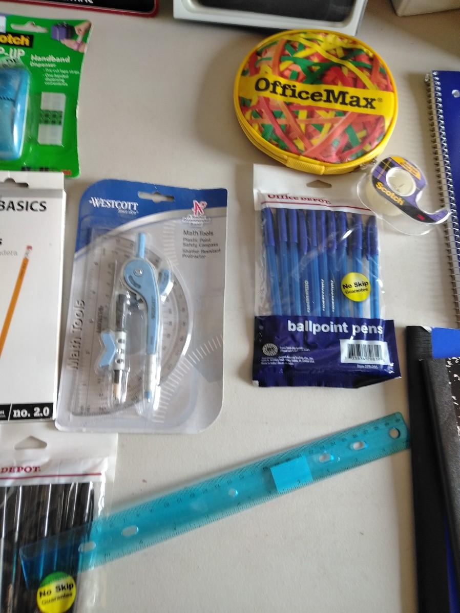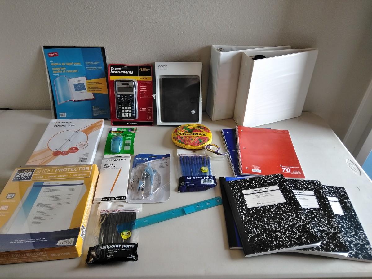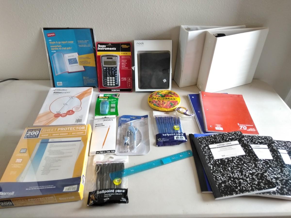 PACKAGE OF 200 SHEET PROTECTORS, TWO LARGE THREE RING NOTEBOOKS, SPIRAL NOTEBOOKS, RULER, PENS, FILLER PAPER, PROTRACTOR, AND MORE