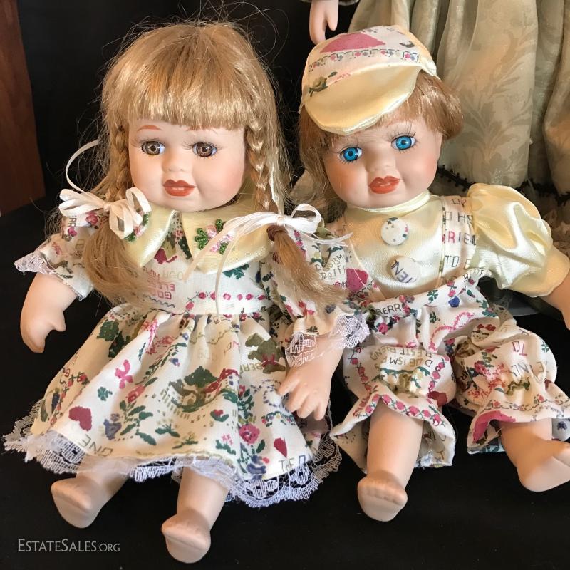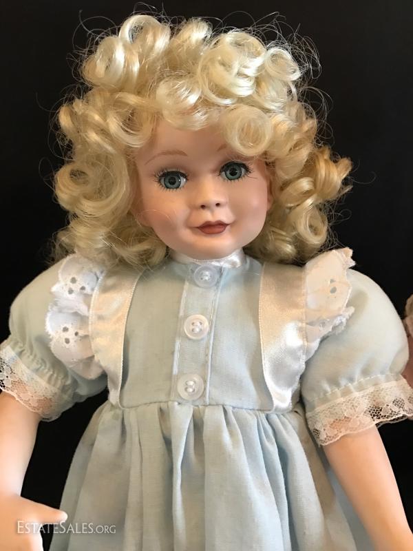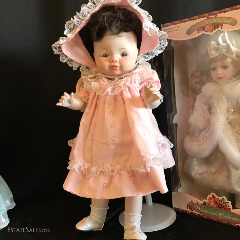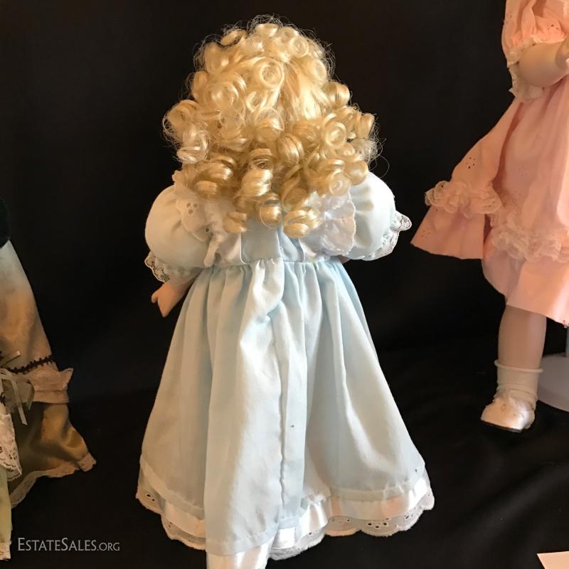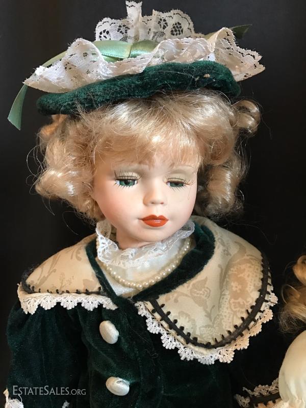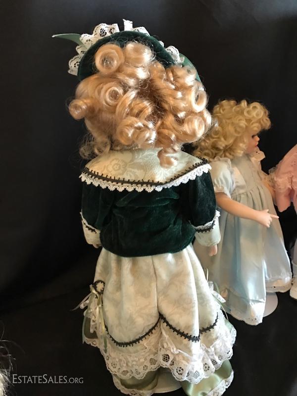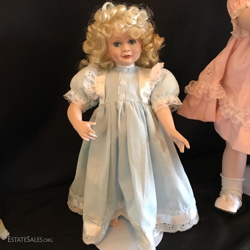 Brother and sister Ashley Belle porcelain dolls are approx 10” tall. Lot also includes one 17” tall Ashley Belle porcelain doll in green velvet and silk dress with doll stand. One 13” porcelain doll in light blue dress with metal stand . See photo for signature. And one 17” doll in pink eyelet dress. She does not have any signatures. No boxes or COA with any of the above dolls. One limited Edition porcelain doll new in box by Melissa June. Approx 16” tall. Includes COA and wood stand. See photos for details. Doll ships from Columbus, North Carolina or local pick up.
