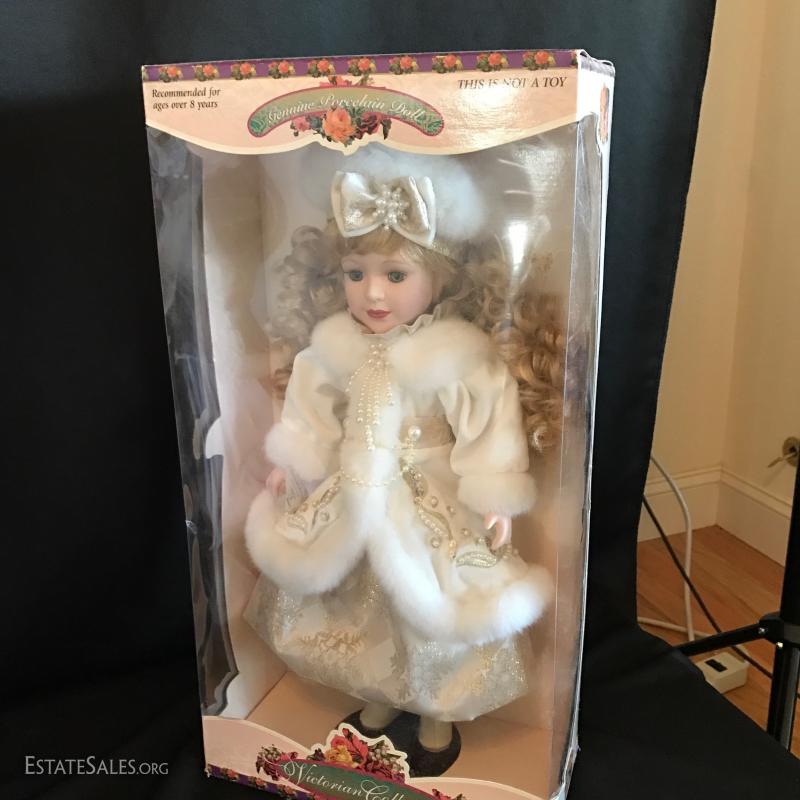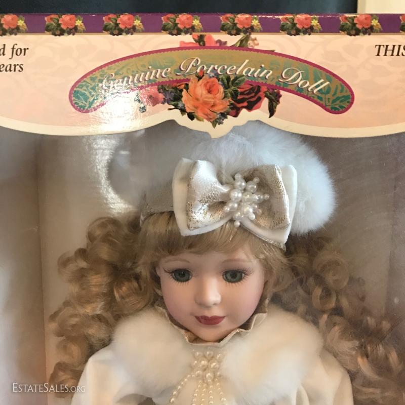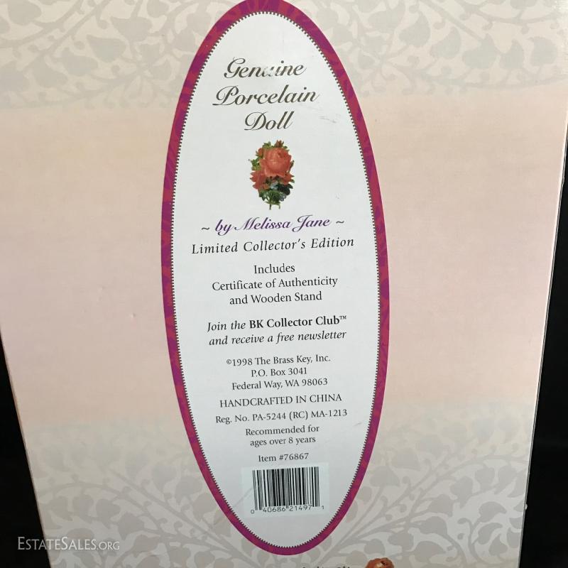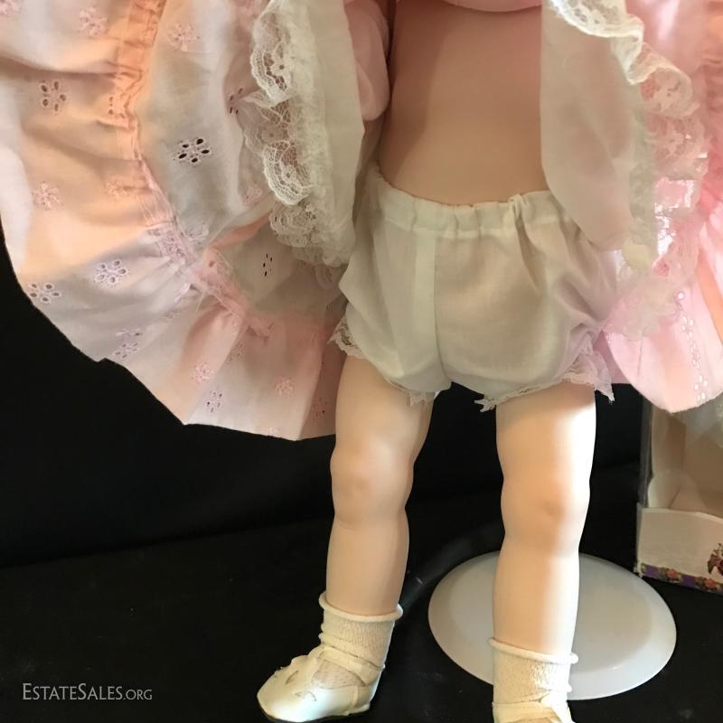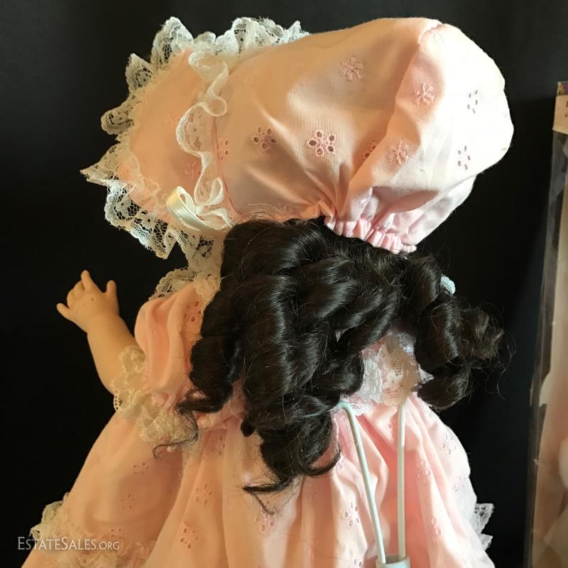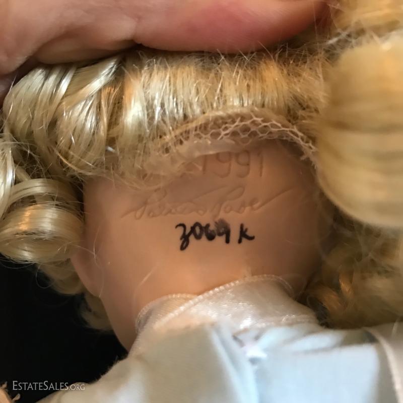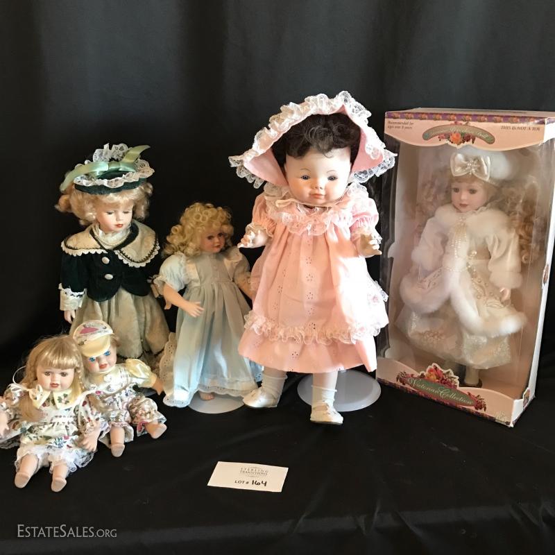 Brother and sister Ashley Belle porcelain dolls are approx 10” tall. Lot also includes one 17” tall Ashley Belle porcelain doll in green velvet and silk dress with doll stand. One 13” porcelain doll in light blue dress with metal stand . See photo for signature. And one 17” doll in pink eyelet dress. She does not have any signatures. No boxes or COA with any of the above dolls. One limited Edition porcelain doll new in box by Melissa June. Approx 16” tall. Includes COA and wood stand. See photos for details. Doll ships from Columbus, North Carolina or local pick up.