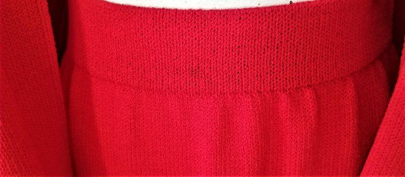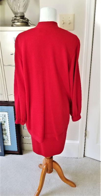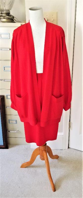 I can wear this St. John Knits cardigan easily and I am a size 12. The skirt look like a 4 of 6. I don't see anything wrong with the cardigan. The skirt has a very small stain on the waistband. We have not tried to launder or clean these garments.