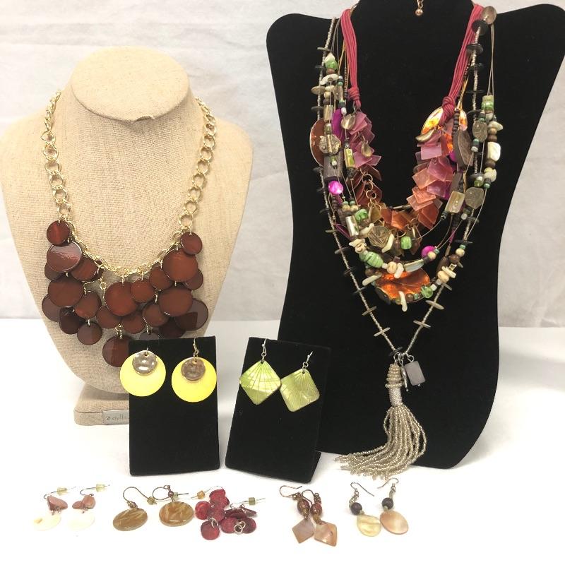 Large assortment of necklaces and earrings many of which are a matching set or lots of options to mix and match. Necklaces include Chico’s, Talbots and more.