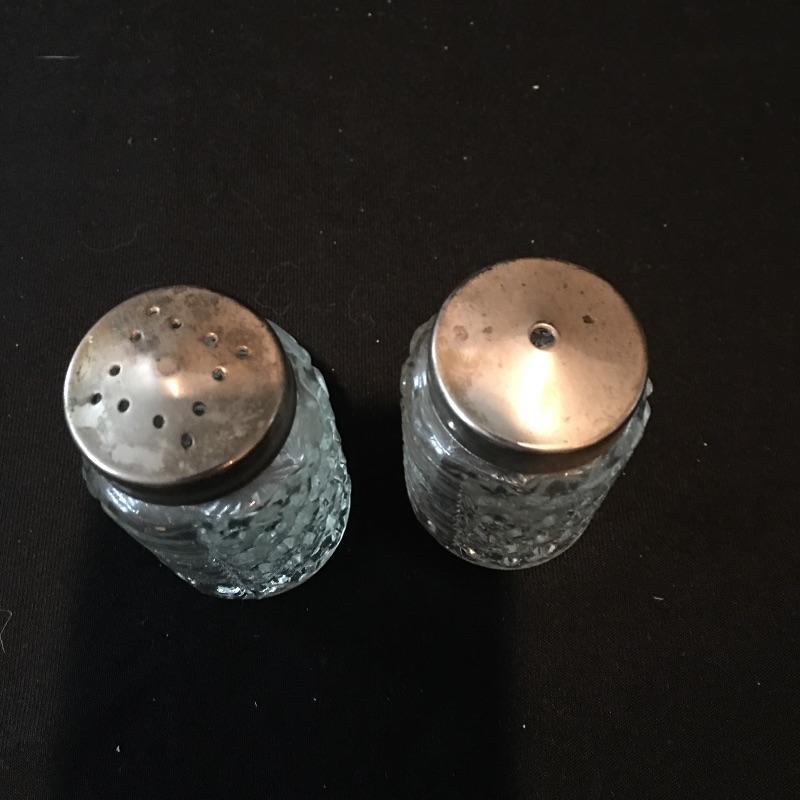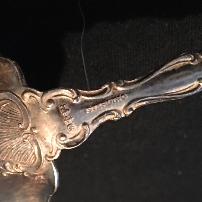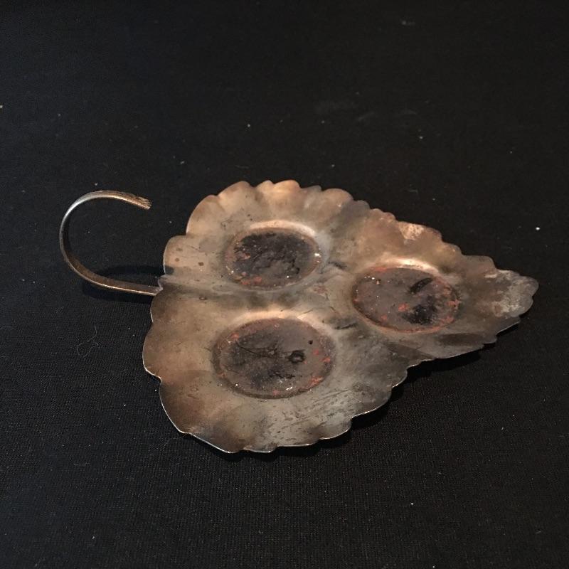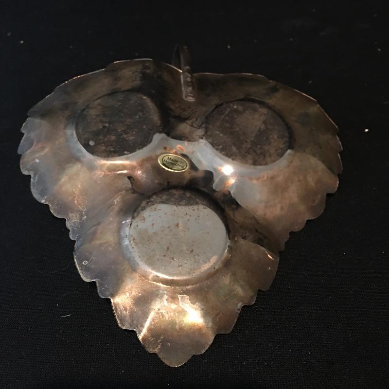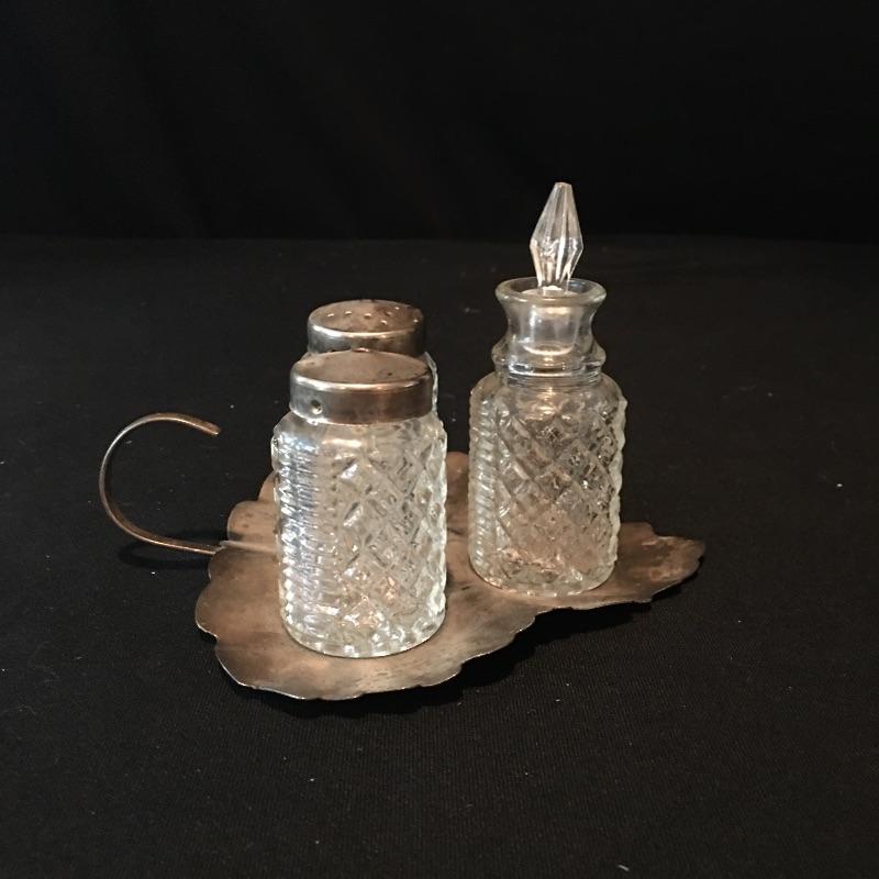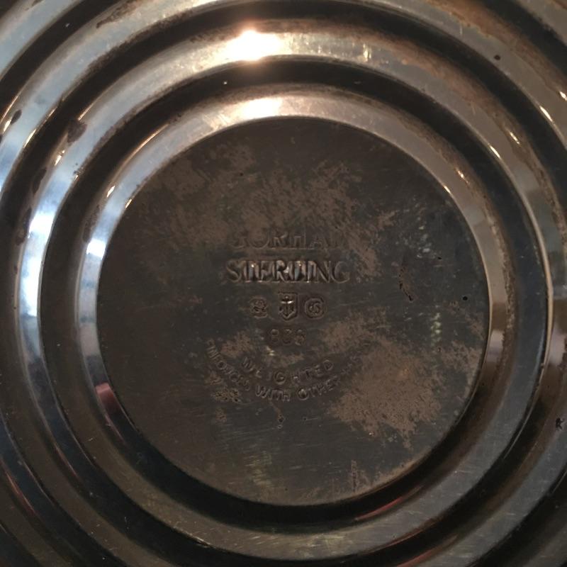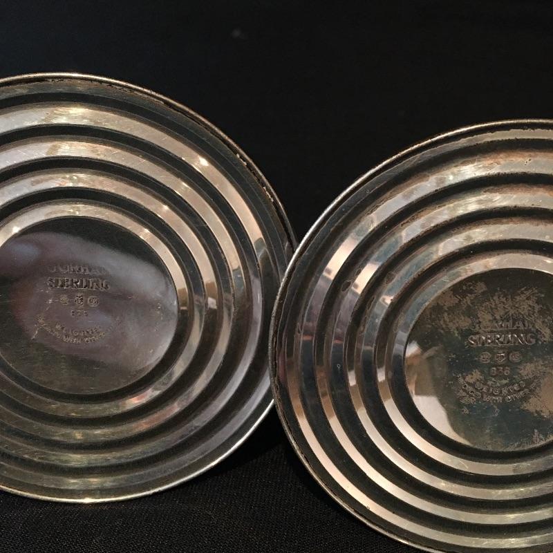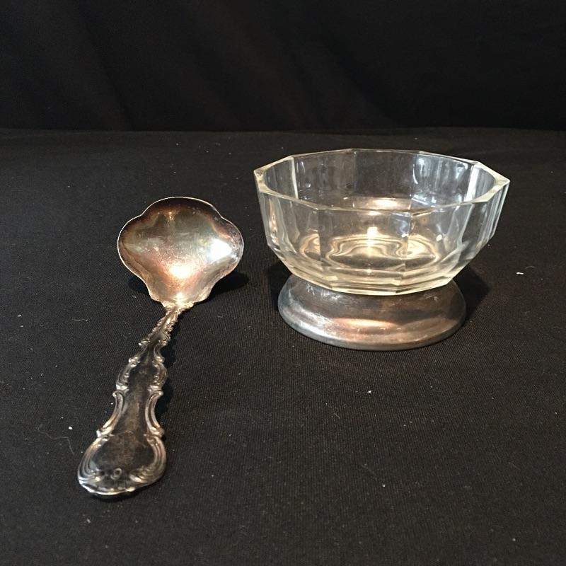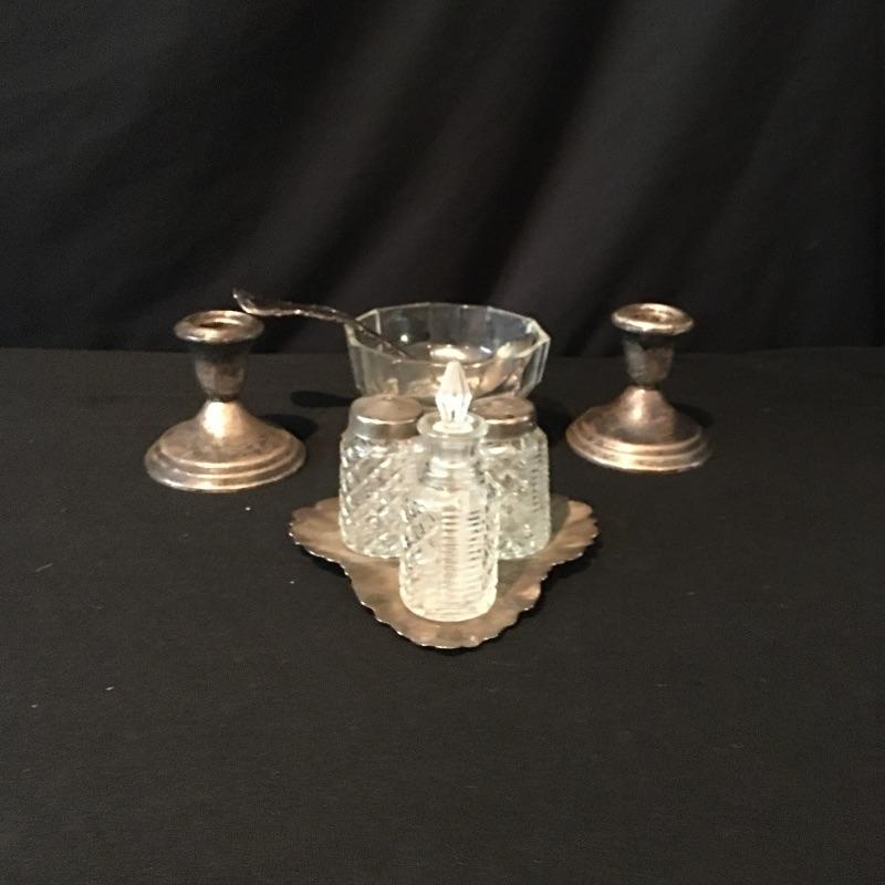 Pair of Gorham Sterling candleholders and Sterling spoon. There is also a small glass and silver bowl (with small crack) and a small silver leaf shaped tray with salt and pepper shakers with small bottle with stopper. - neither of which are sterling. Candleholders each measure 3.25”D x 3.25” tall.