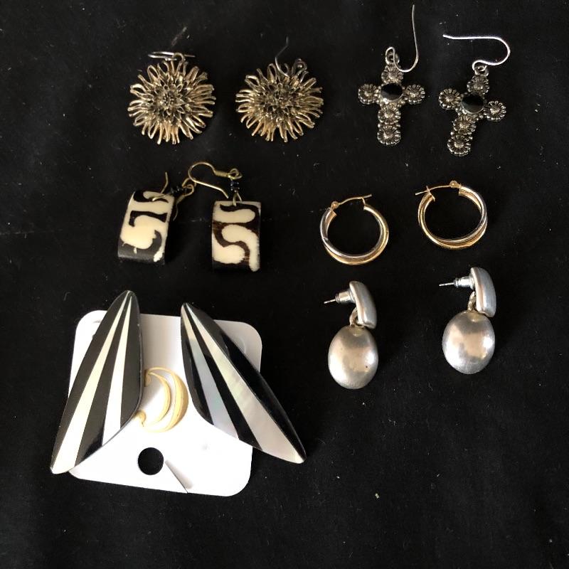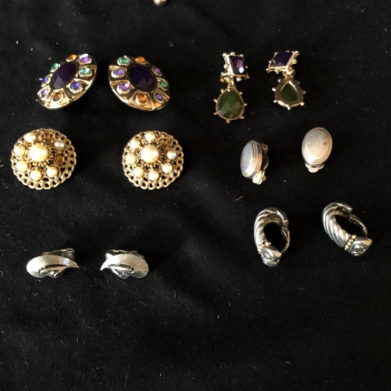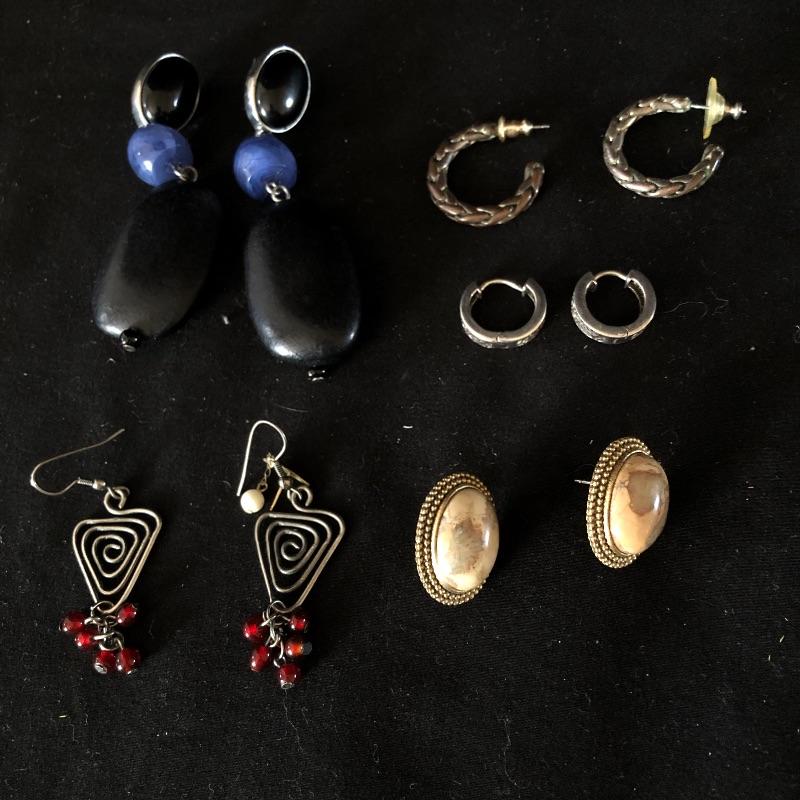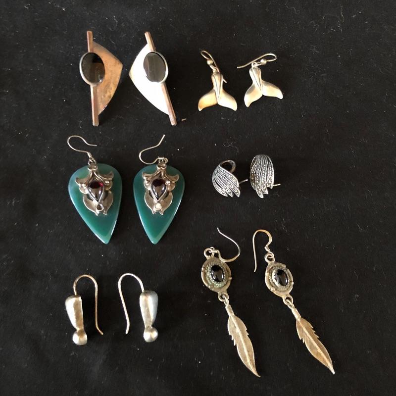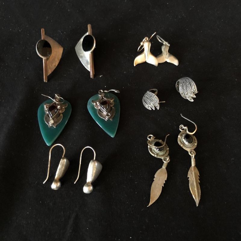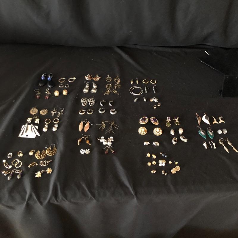 A large collection of earrings in a variety of styles and materials. Lot includes two pair of earrings marked sterling, four pairs of earrings marked 925, six pair of clip on earrings and a great selection of over forty more pairs of earrings.