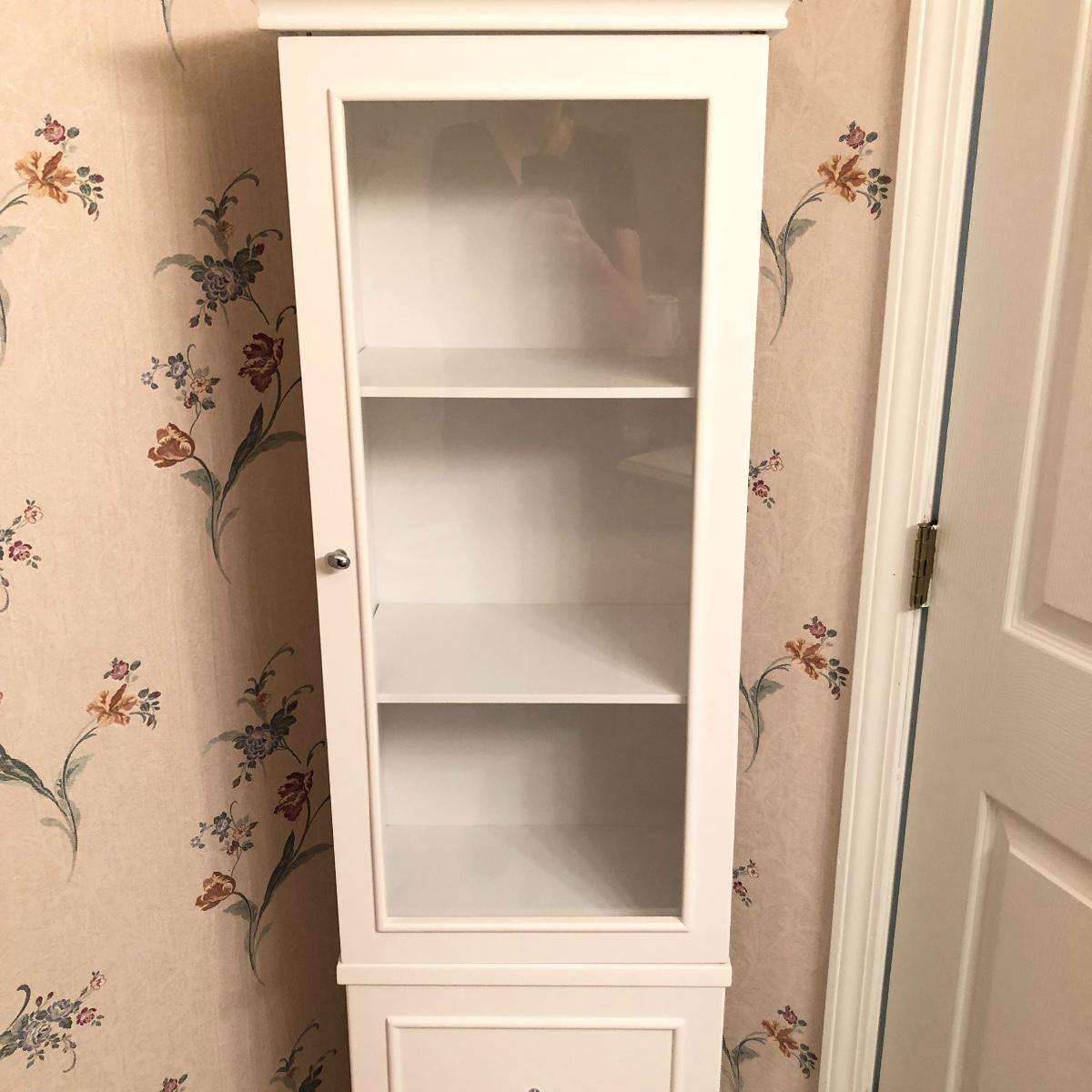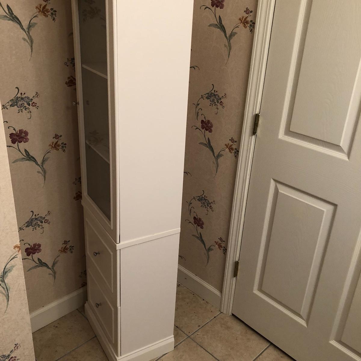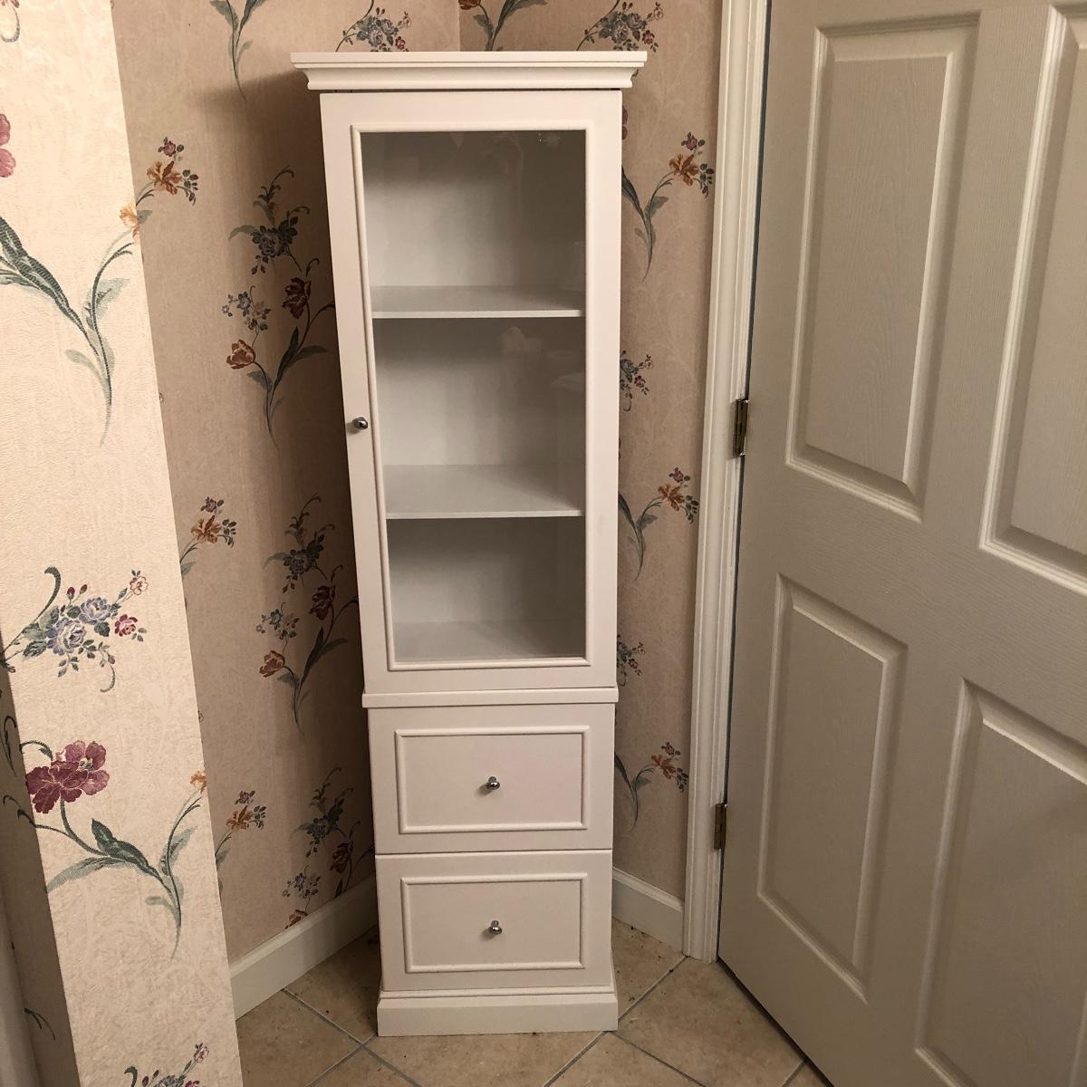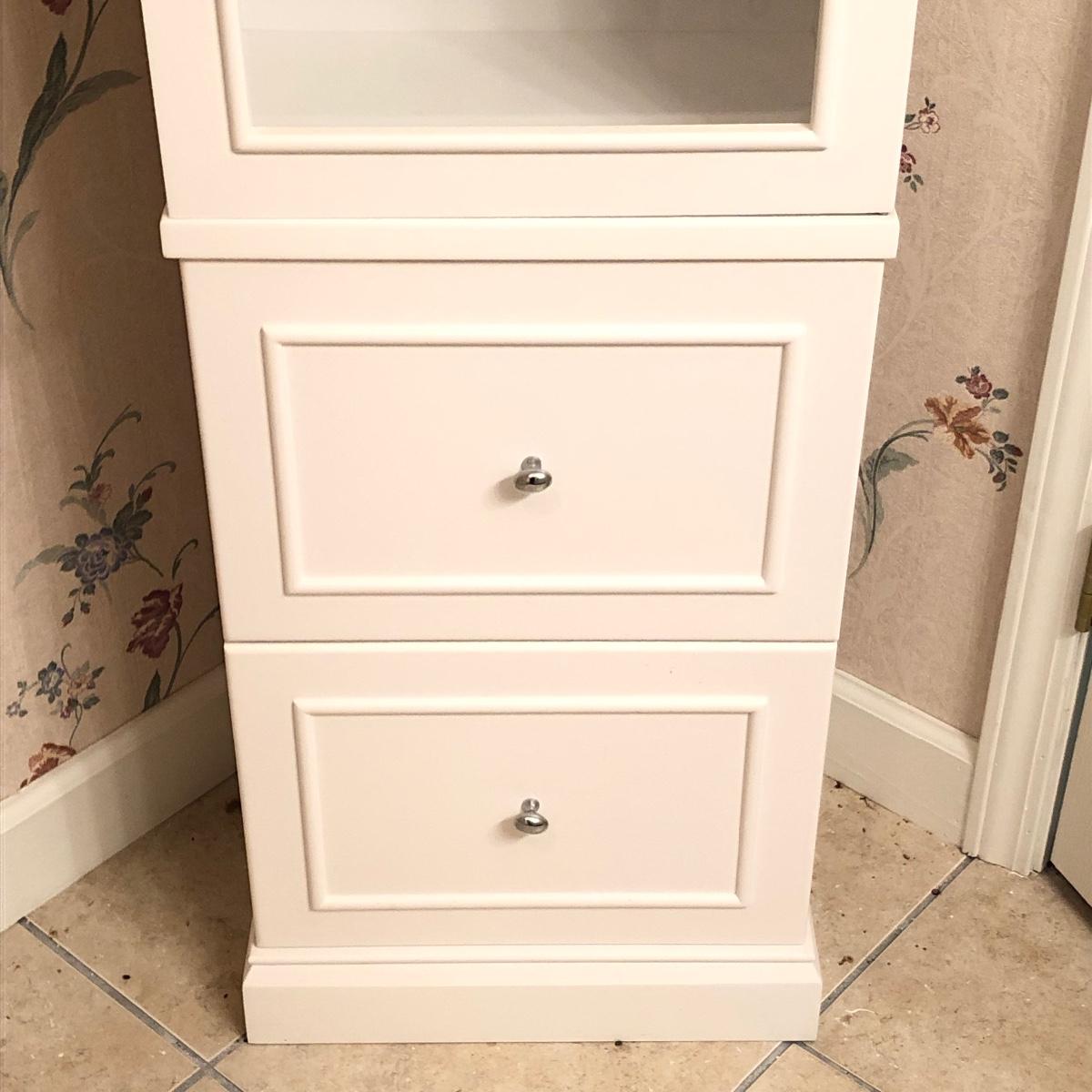 This attractive white cabinet packs a lot of storage in a relatively streamlined unit! The upper section has two tall shelves with a glass door and the lower section has two deep drawers making this perfect for bathroom or bedroom storage. The clean white look is accented by the chrome colored hardware. Item does look like it is in two sections but it is all one piece.