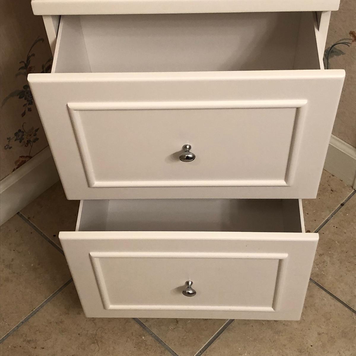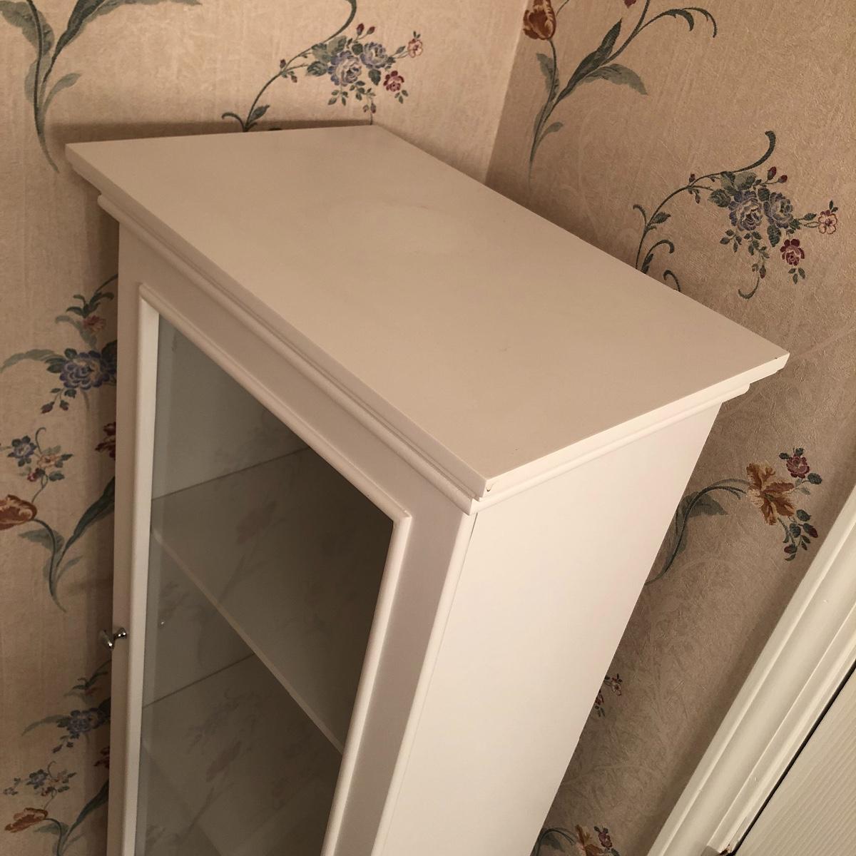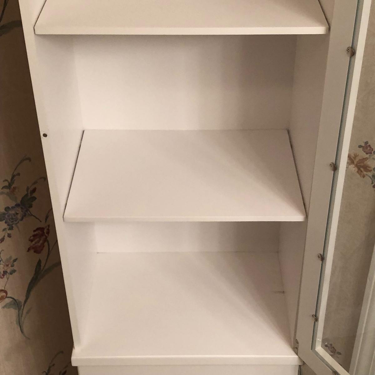 This attractive white cabinet packs a lot of storage in a relatively streamlined unit! The upper section has two tall shelves with a glass door and the lower section has two deep drawers making this perfect for bathroom or bedroom storage. The clean white look is accented by the chrome colored hardware. Item does look like it is in two sections but it is all one piece.