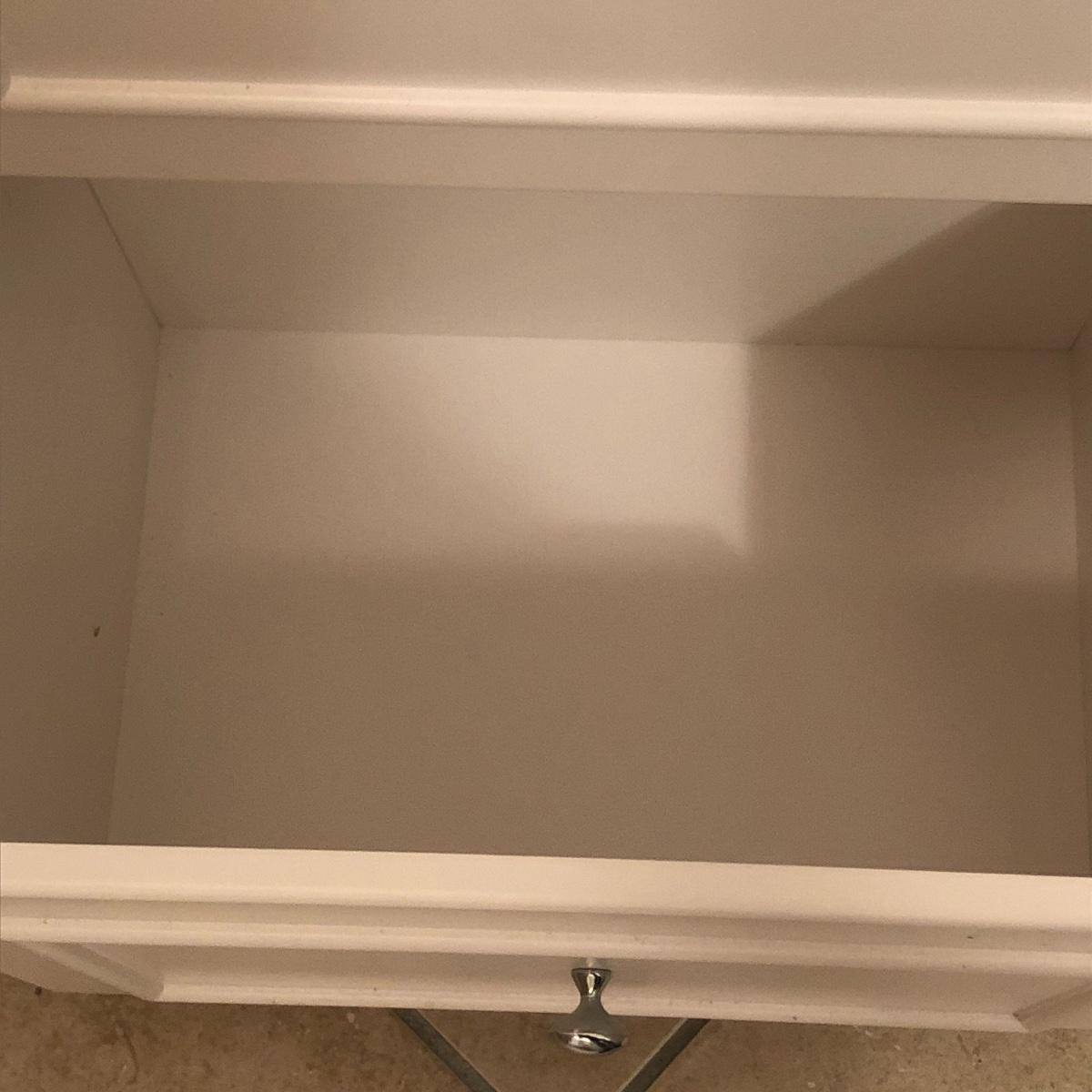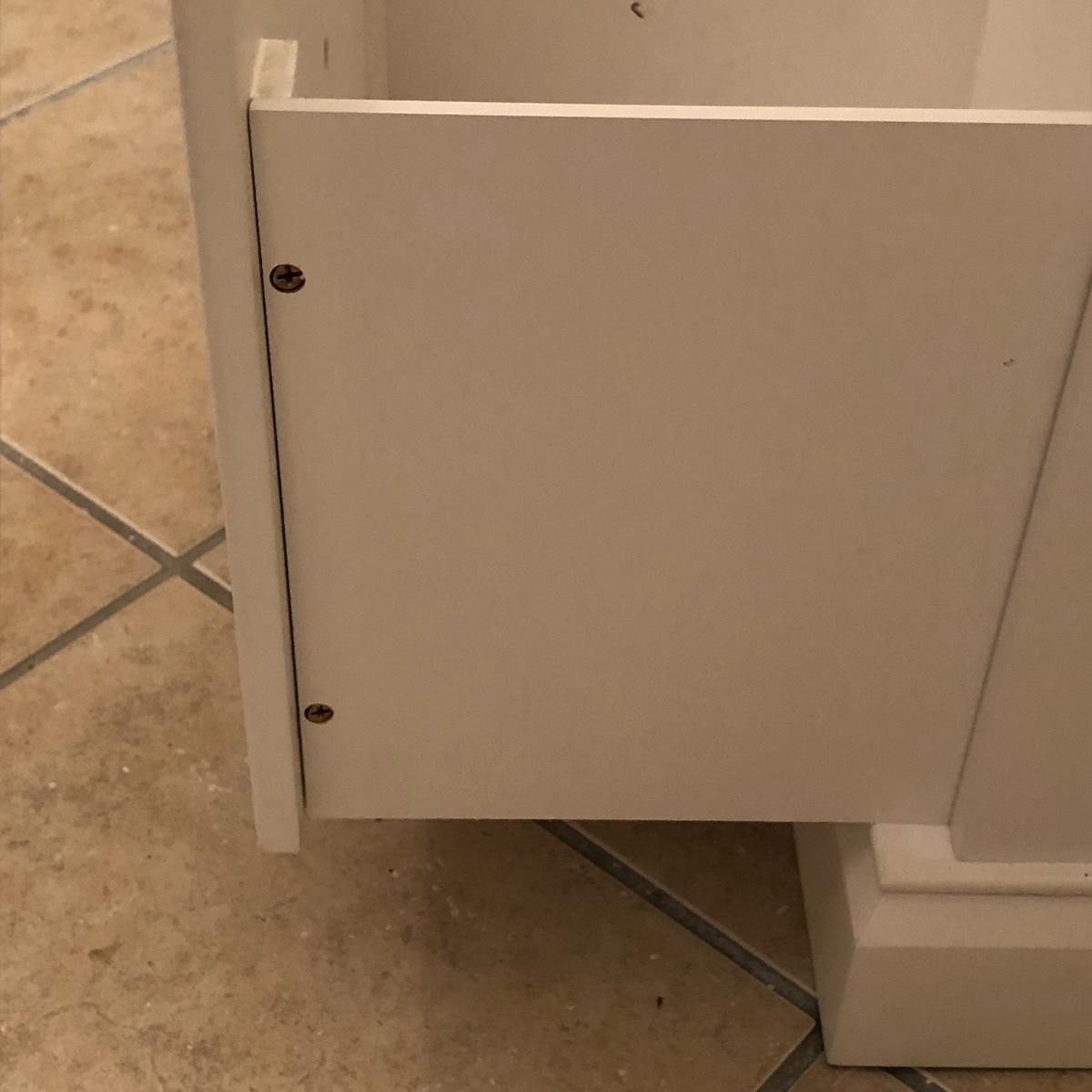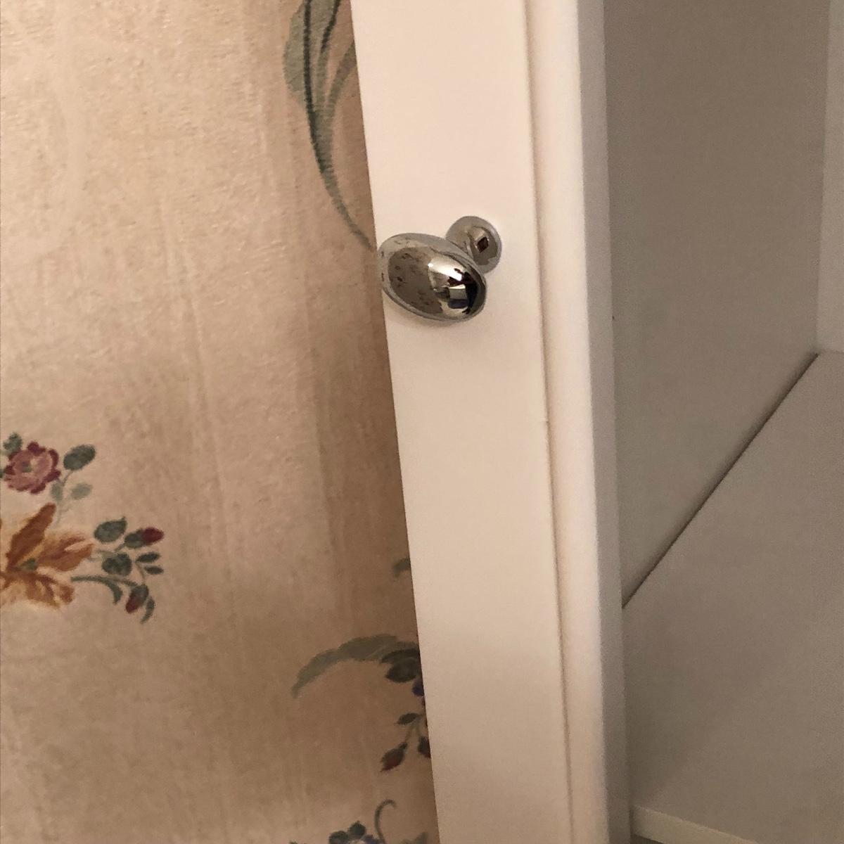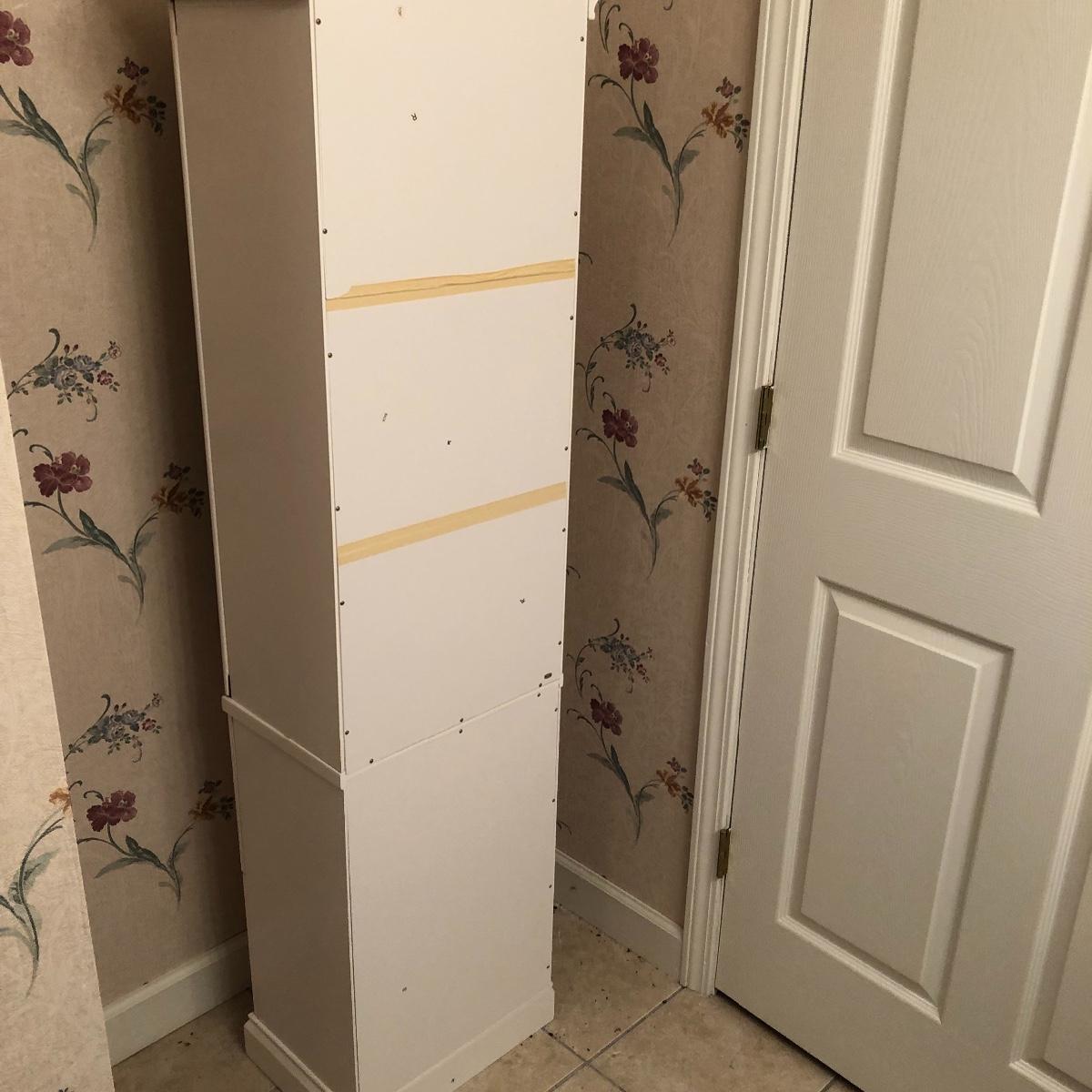 This attractive white cabinet packs a lot of storage in a relatively streamlined unit! The upper section has two tall shelves with a glass door and the lower section has two deep drawers making this perfect for bathroom or bedroom storage. The clean white look is accented by the chrome colored hardware. Item does look like it is in two sections but it is all one piece.