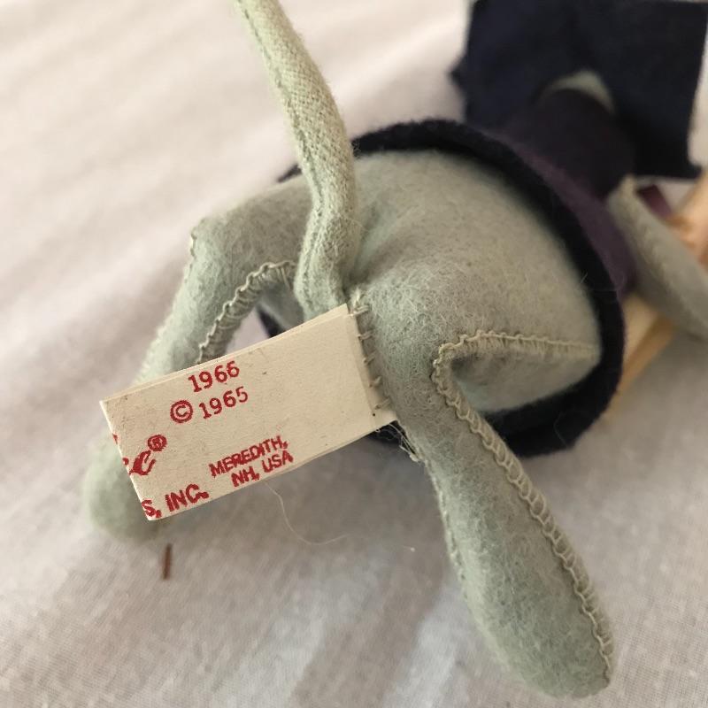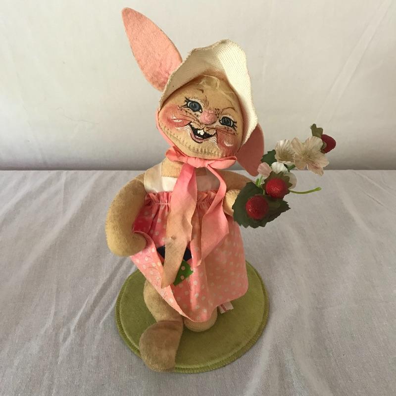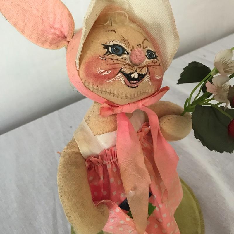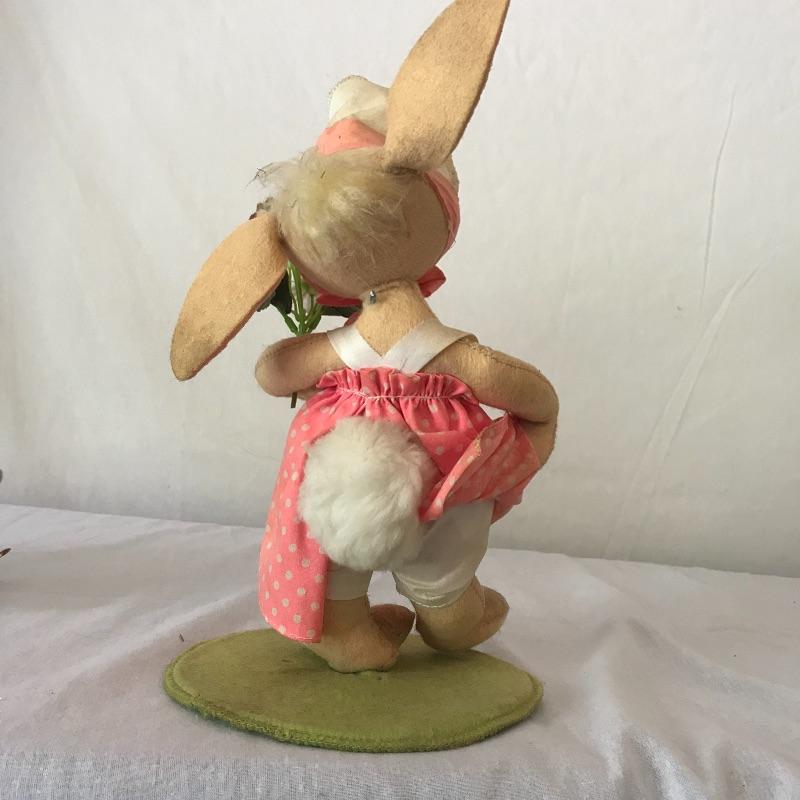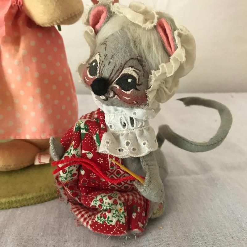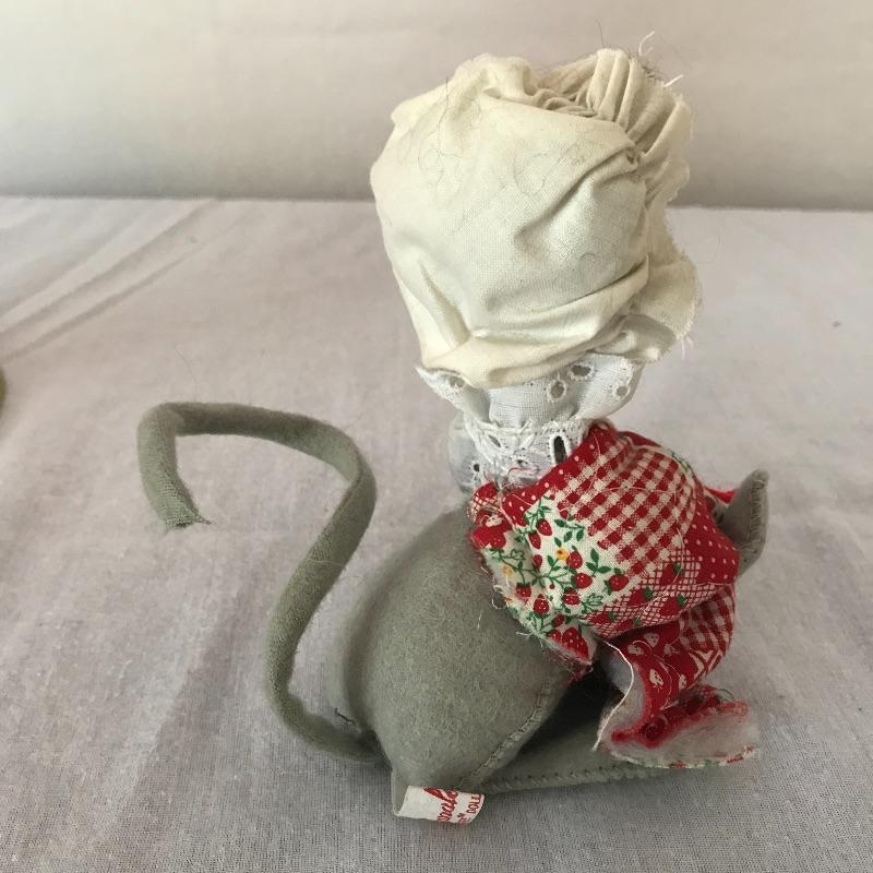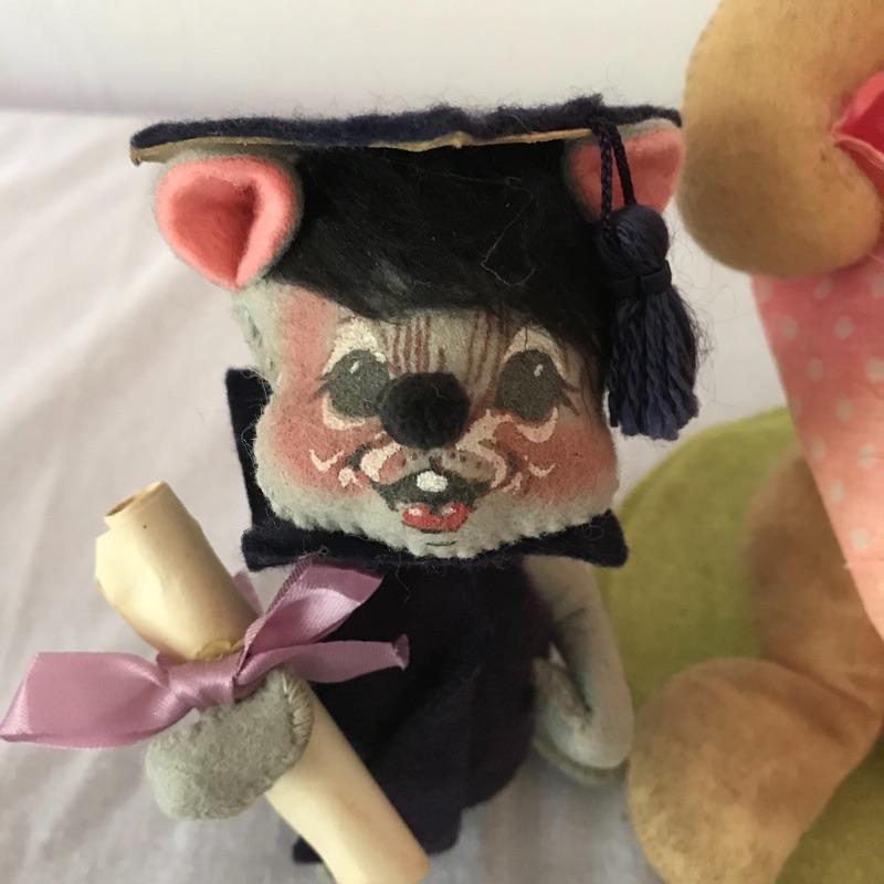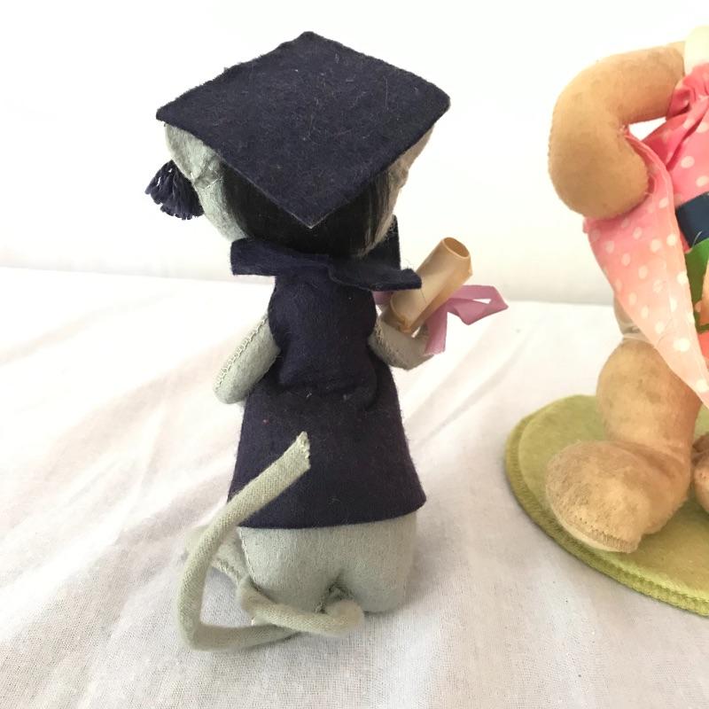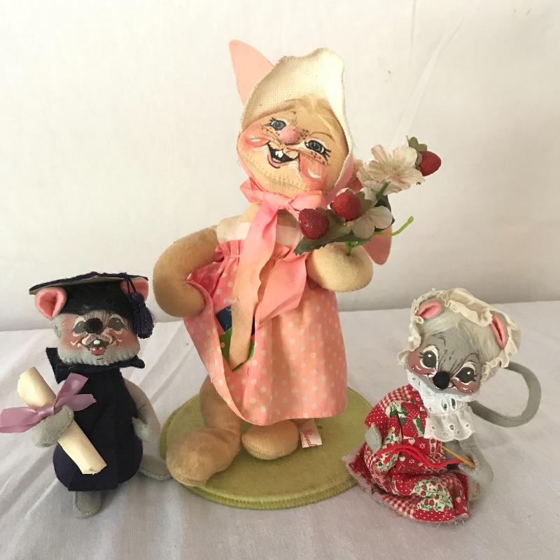 A precious collection of three sweet woodland animals. A 9” dancing bunny with an attached cloth stand; the stand has a metal frame and has poked a tiny hole near the base of the bunny’s neck. She shows some stains, but she’s in great condition for her age and should be able to be cleaned. Lot also includes an adorable set of mice, one is graduating and the other is sewing, standing 5” and 6” respectively. Shipping available.