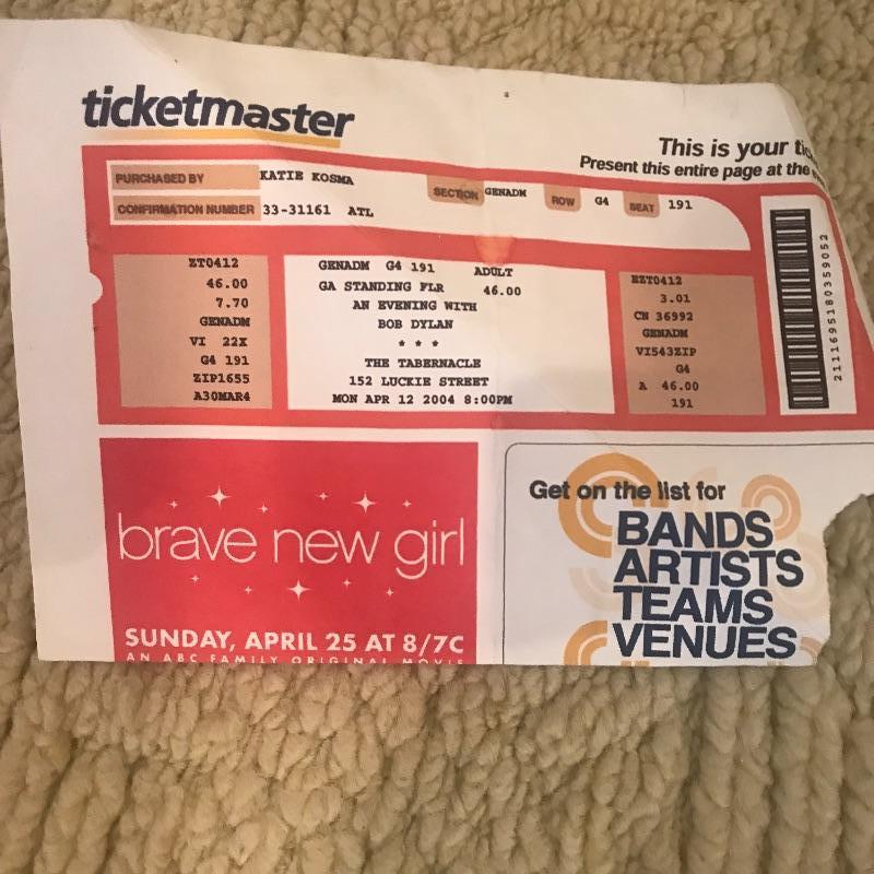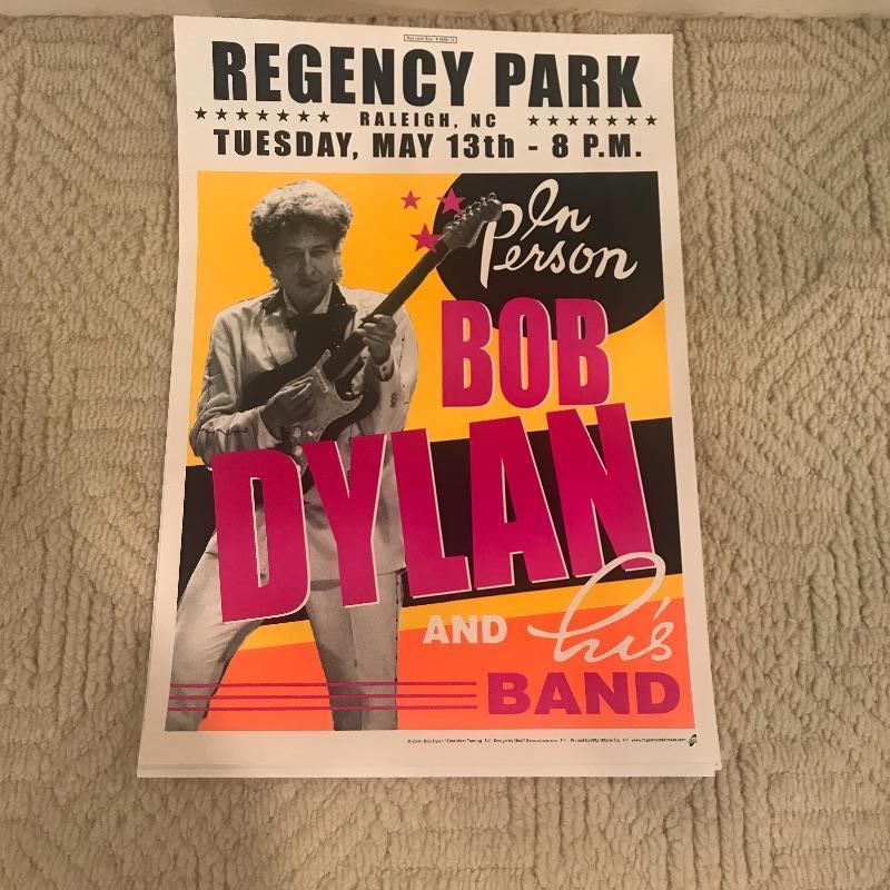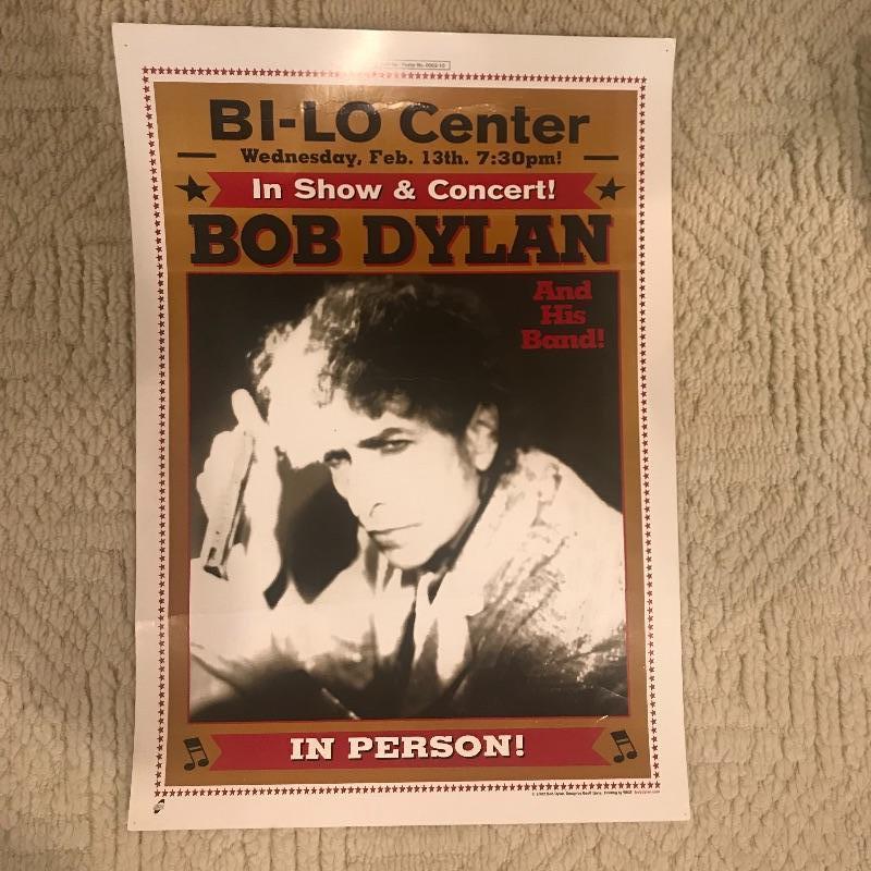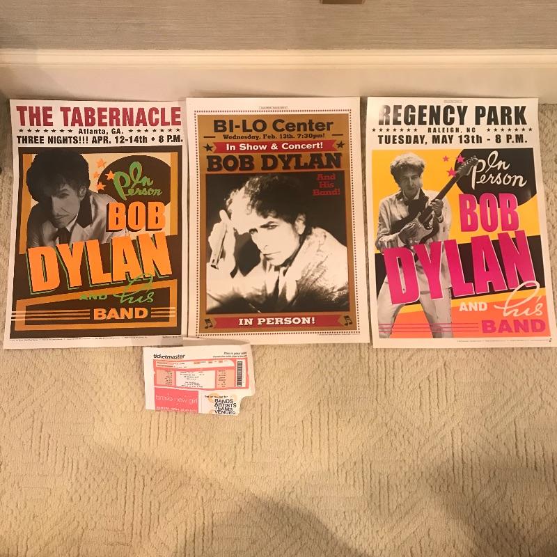 Bi-Lo Center, The Tabernacle and Regency Park hosted this music icon in 2004 for his “In Person” tour. These Bob Dylan Posters are in good condition but have been pinned on a wall. One concert ticket also included in the lot. Posters measures 14” x 20”. Shipping available.