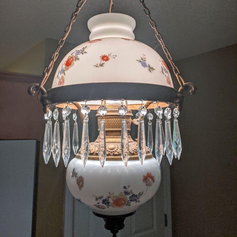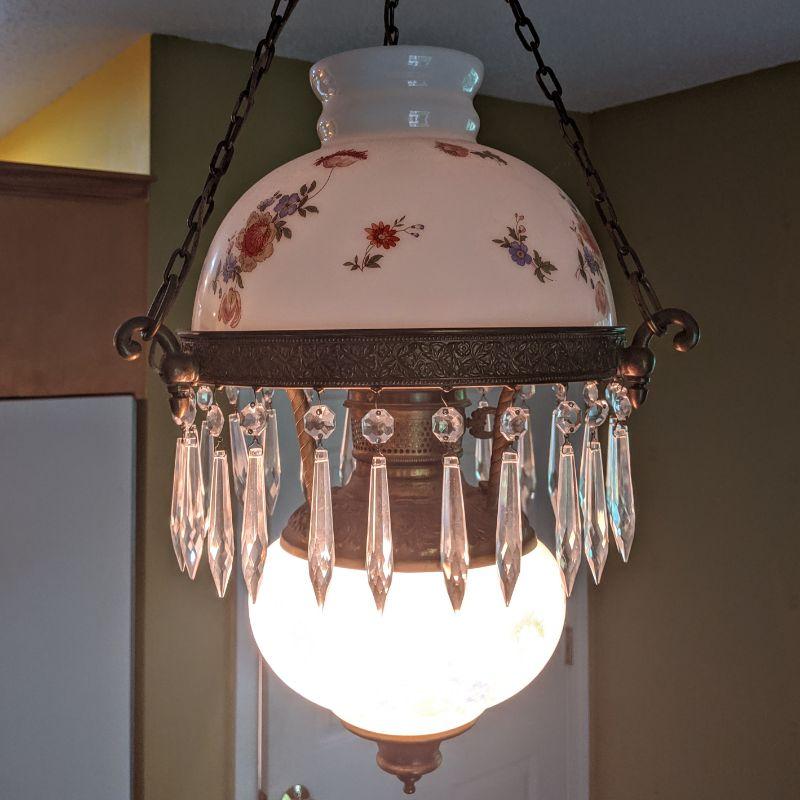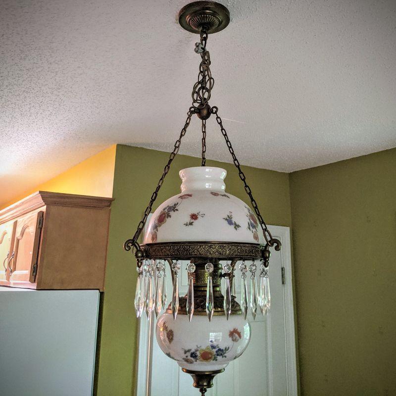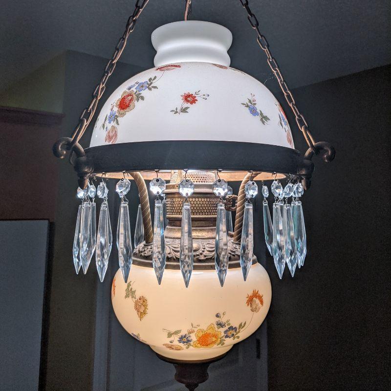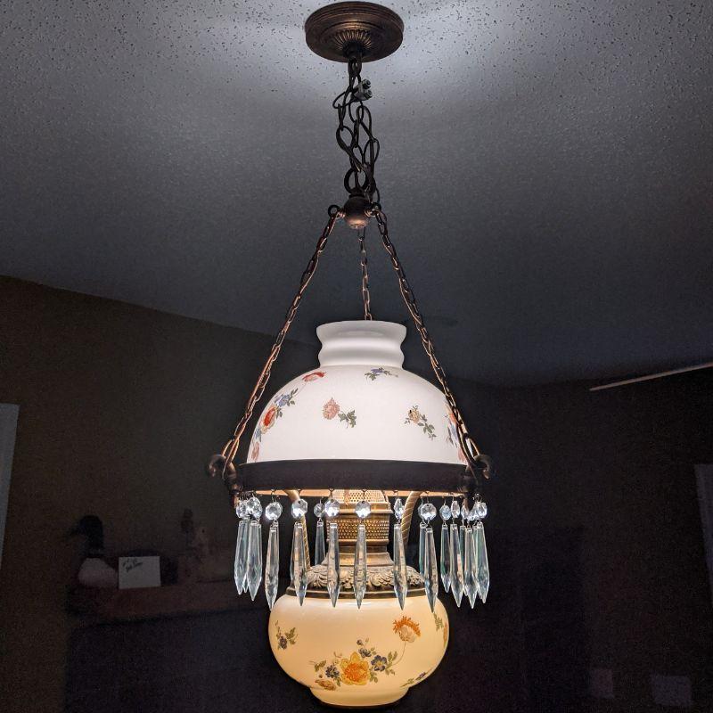 This working, two-tiered converted ceiling lamp has two bulbs that can be lit together or separately. The sweet floral pattern on the glass pieces and the dangling crystals give this lamp a vintage charm. The metal components have a nice aged finish. Currently it hangs 6" from the ceiling, but the chain is expandable by another 12". Note: the lamp will have to be uninstalled and the wires capped by the buyer.