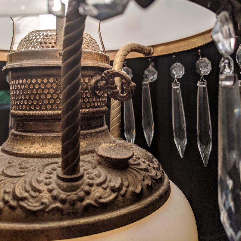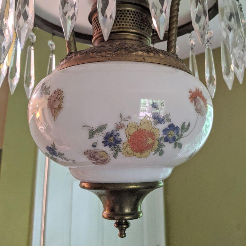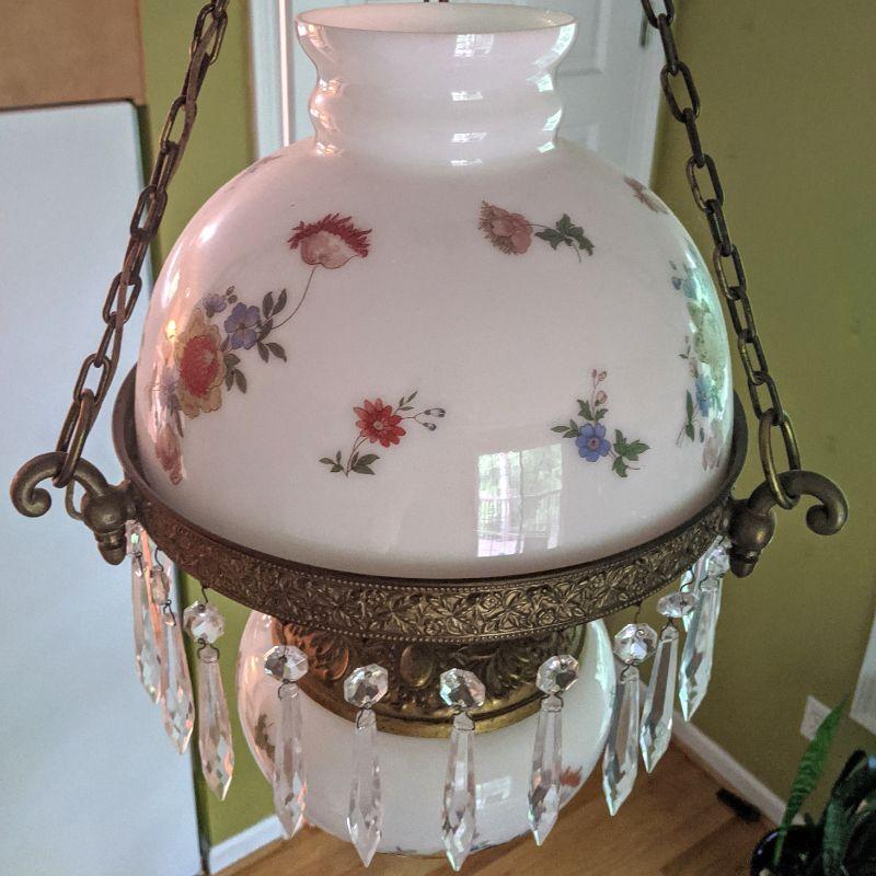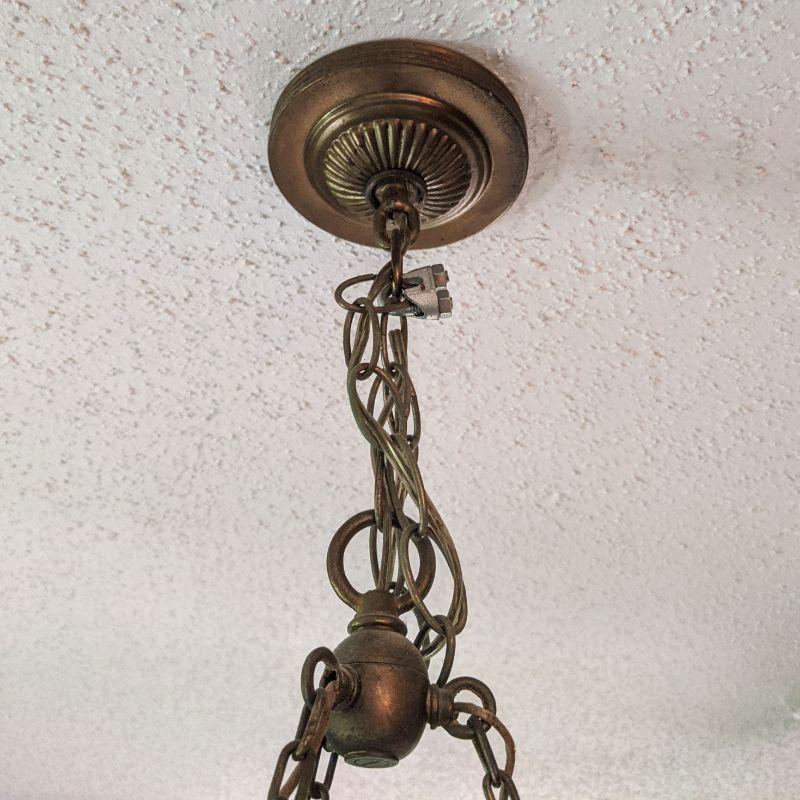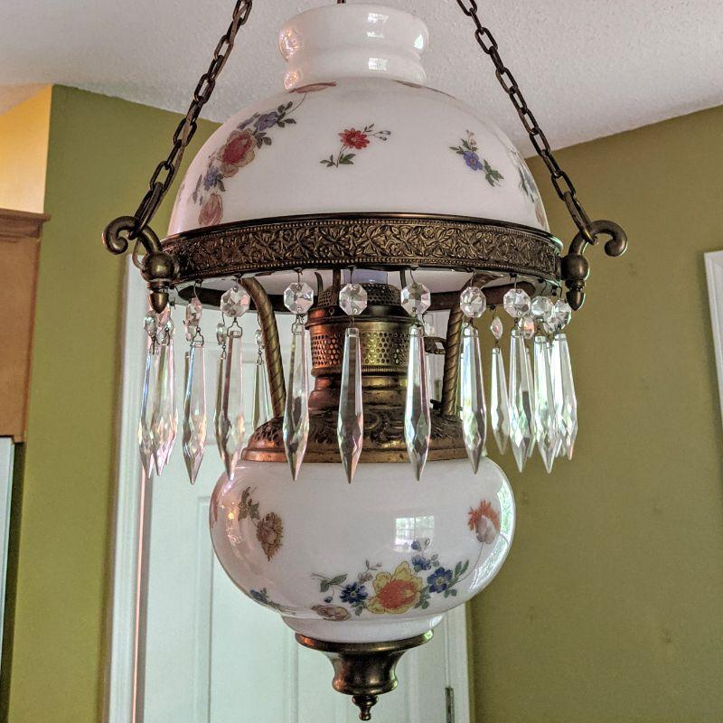 This working, two-tiered converted ceiling lamp has two bulbs that can be lit together or separately. The sweet floral pattern on the glass pieces and the dangling crystals give this lamp a vintage charm. The metal components have a nice aged finish. Currently it hangs 6" from the ceiling, but the chain is expandable by another 12". Note: the lamp will have to be uninstalled and the wires capped by the buyer.