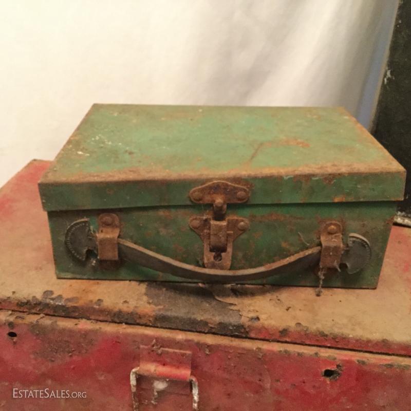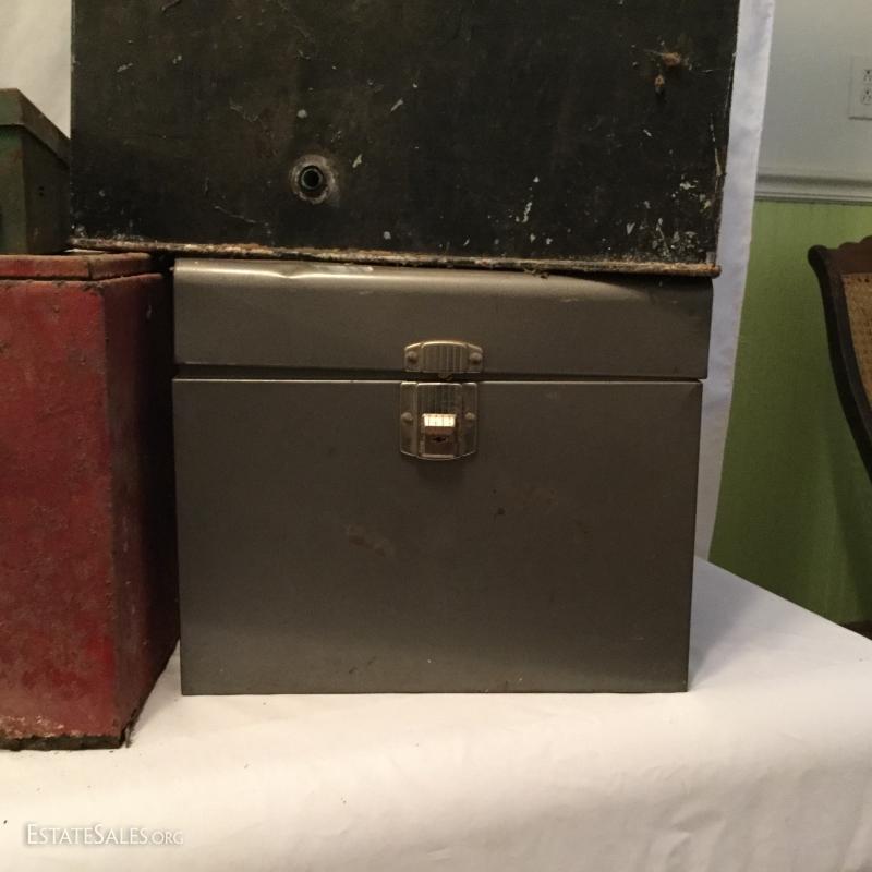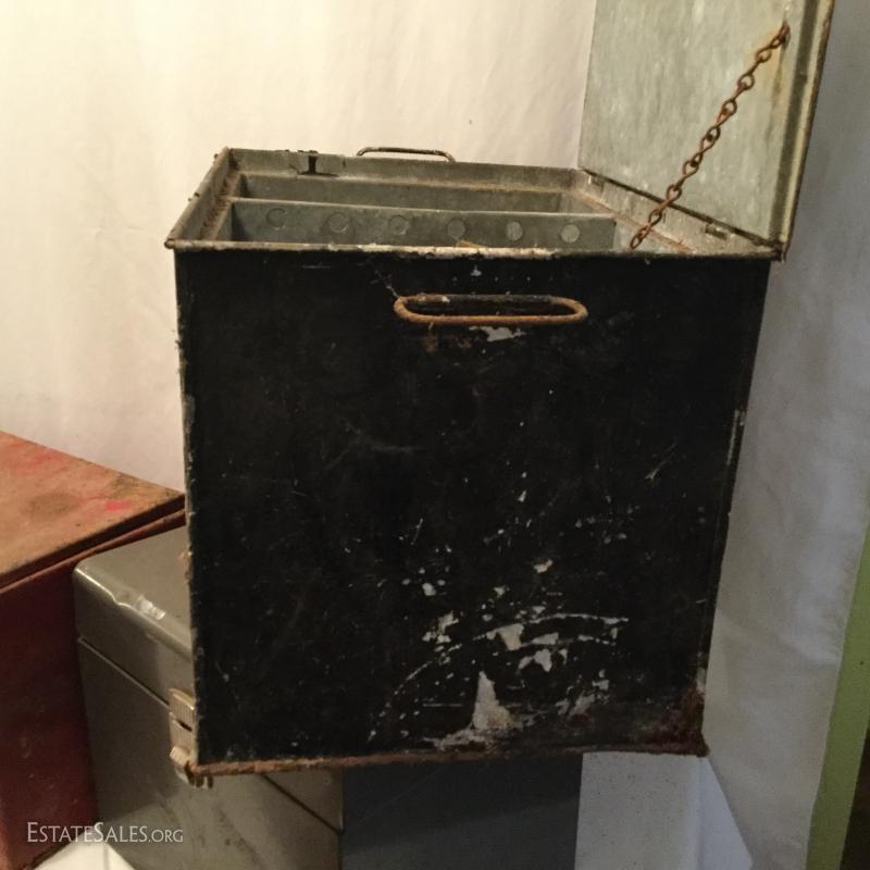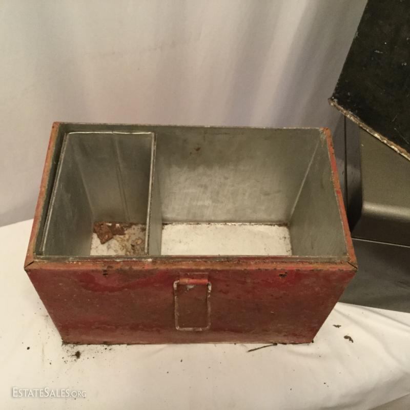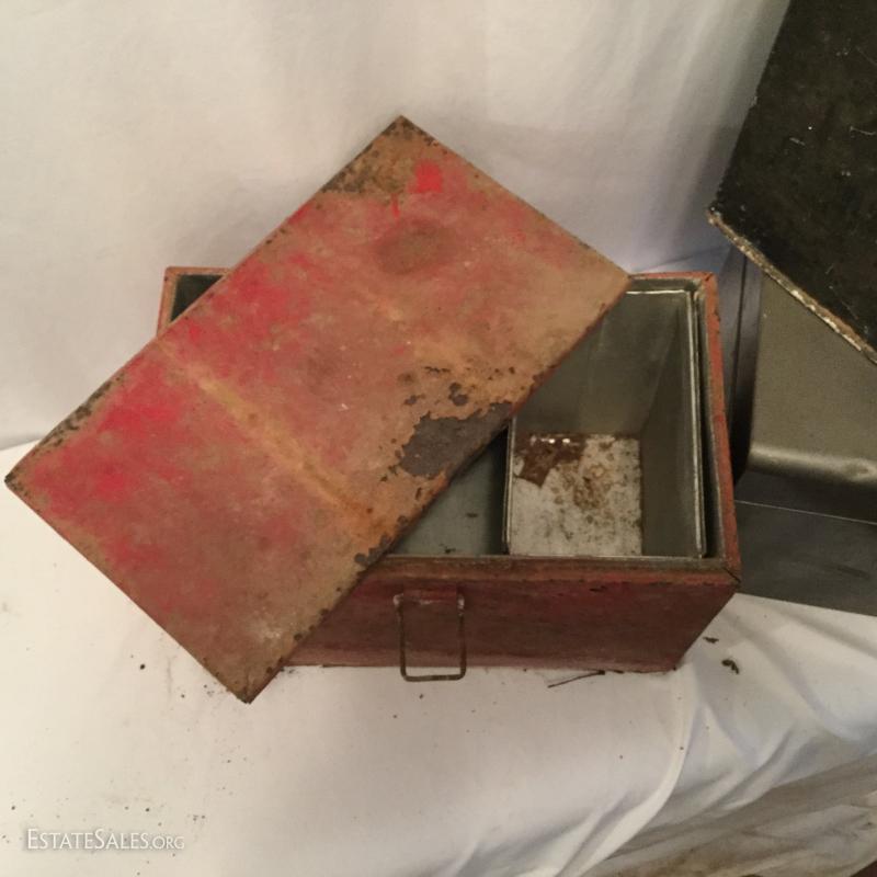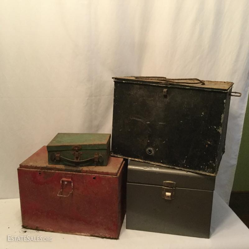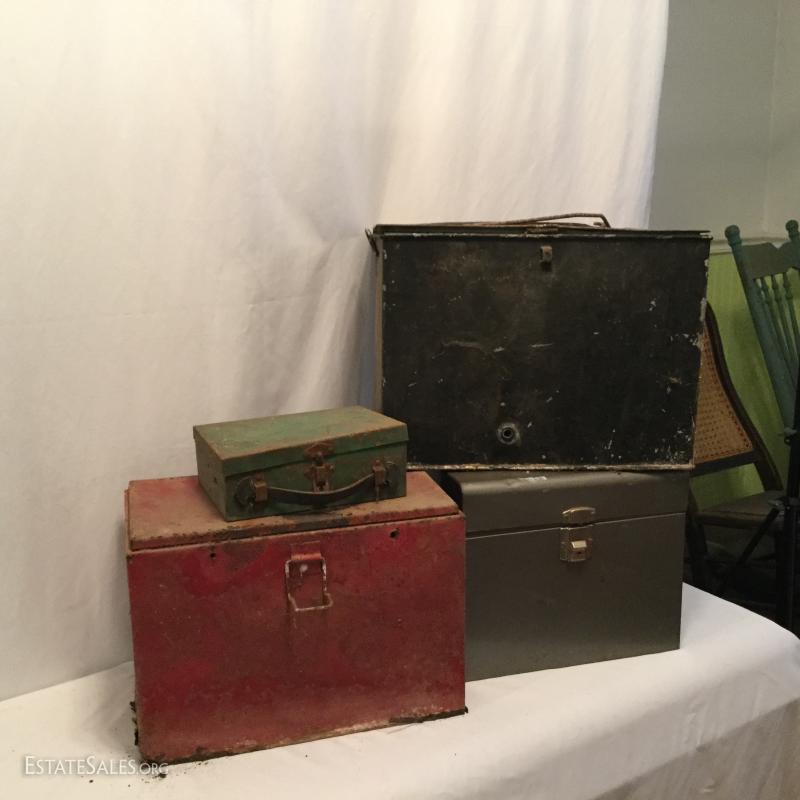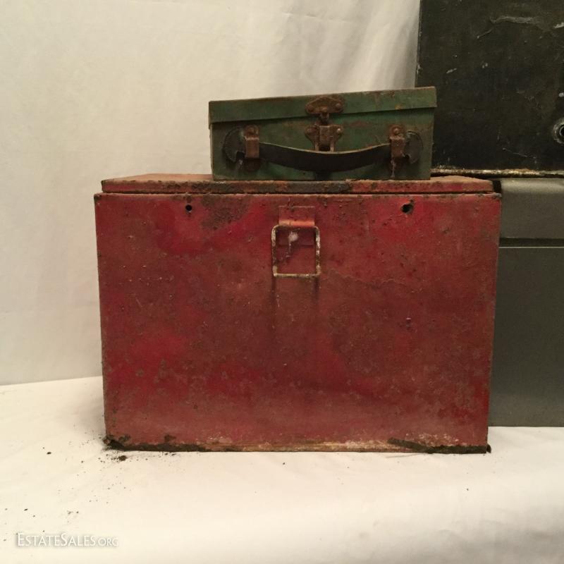 .Black and red metal boxes are old ice chests in somewhat rough shape. Grey one is a small file box. Black one measures 16.5"l x 12"w x 12h. Lot is available for local pick up only in Saluda, NC.