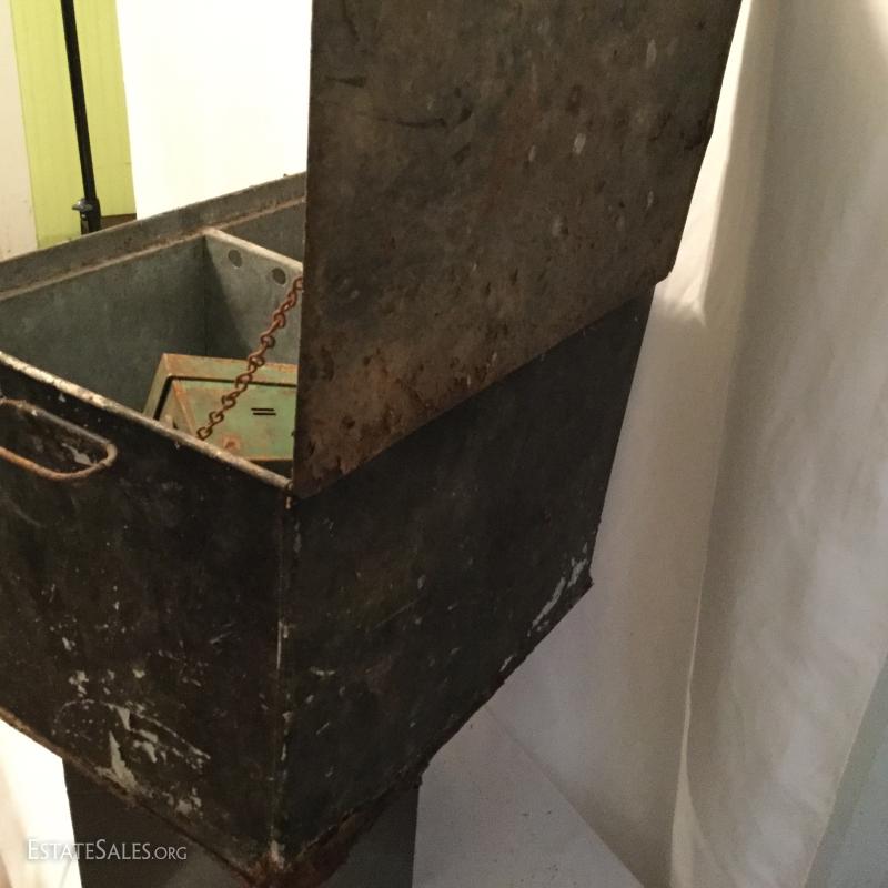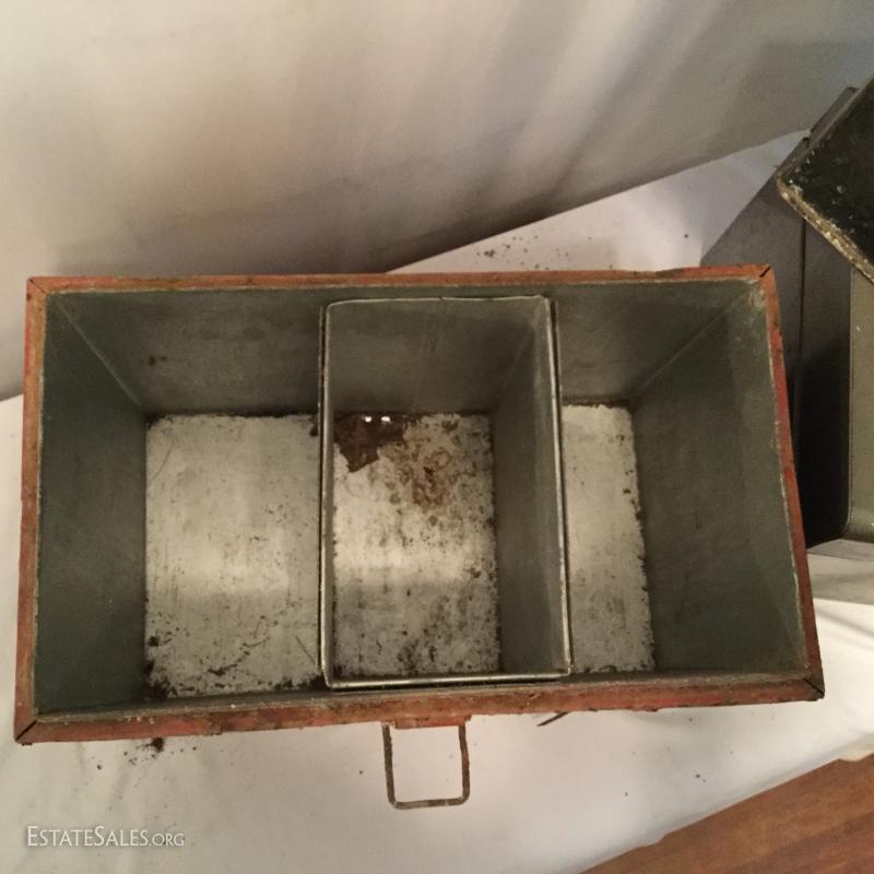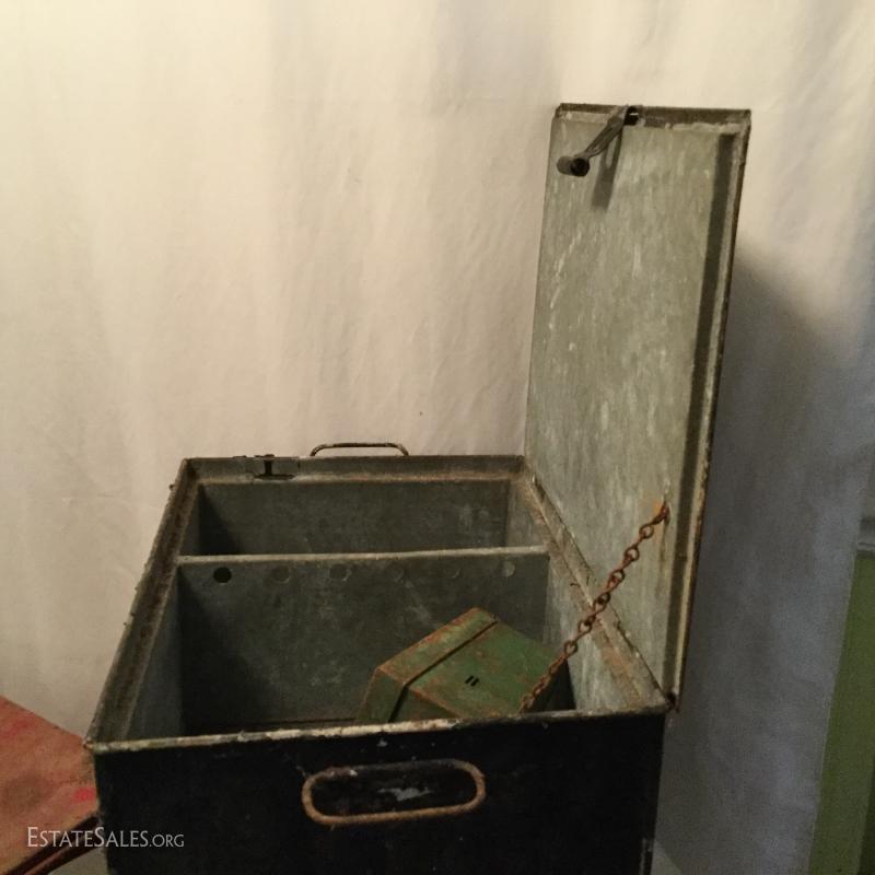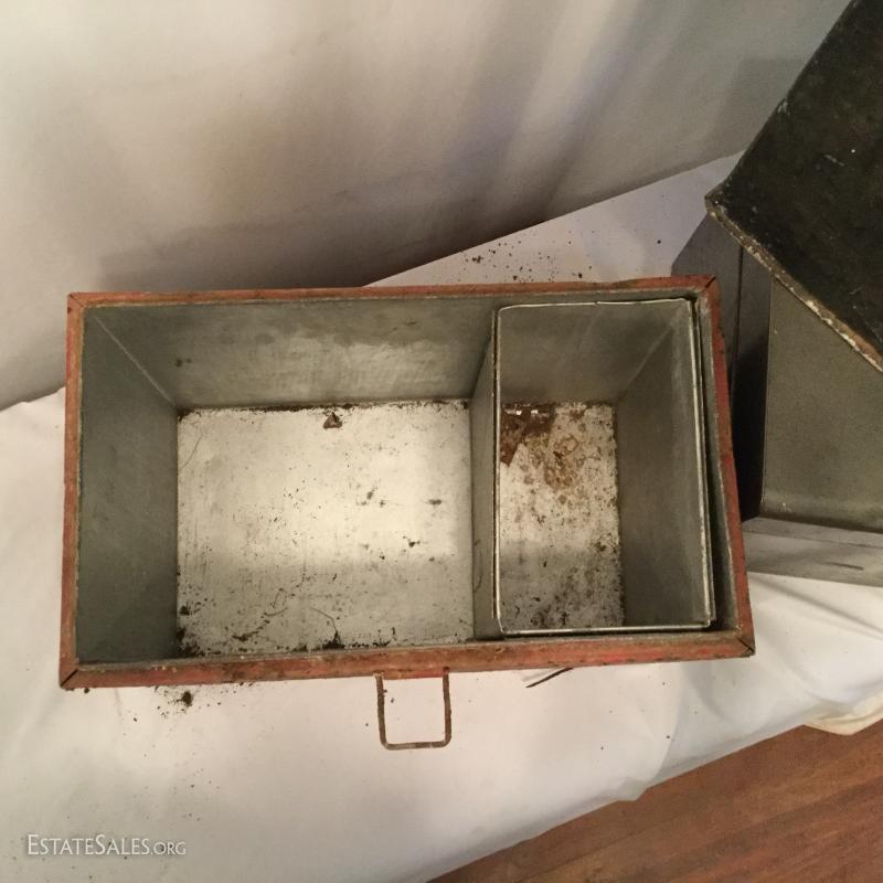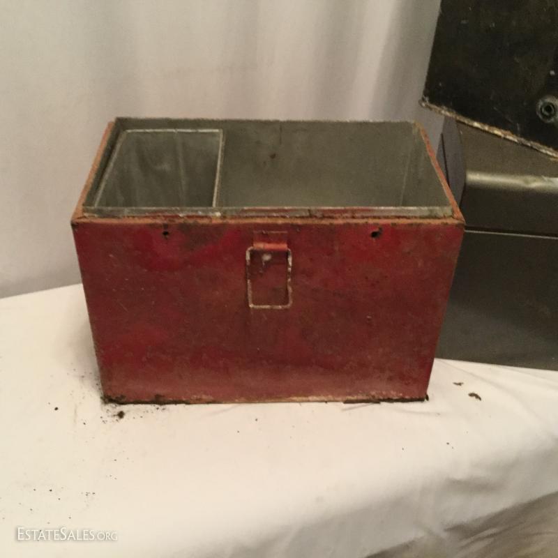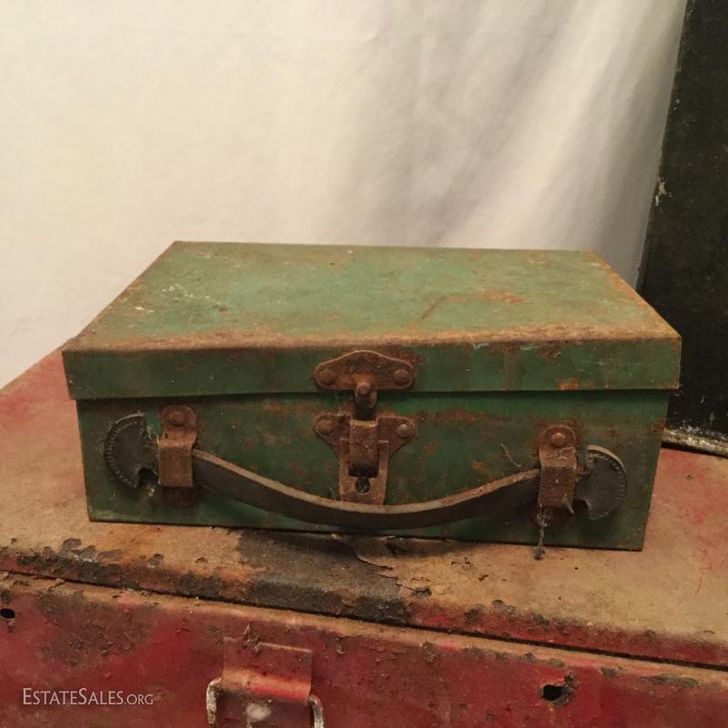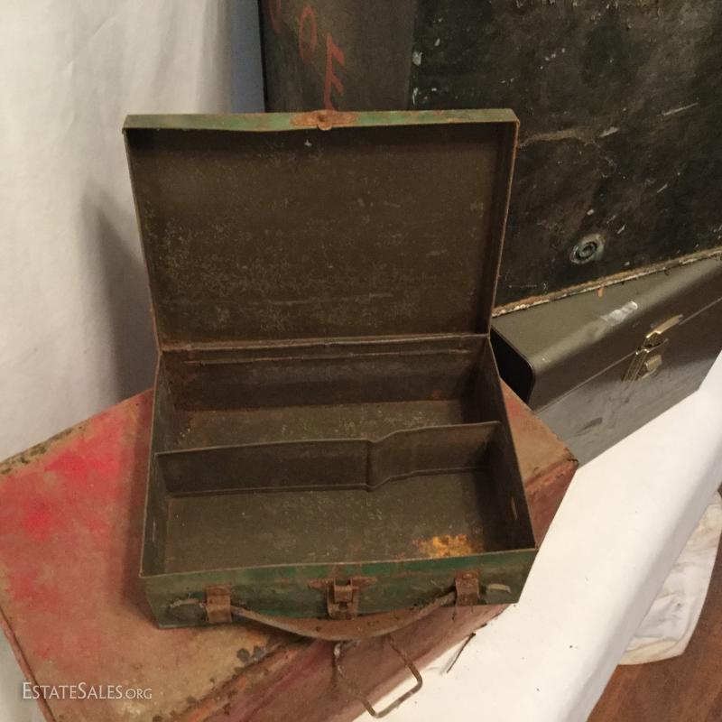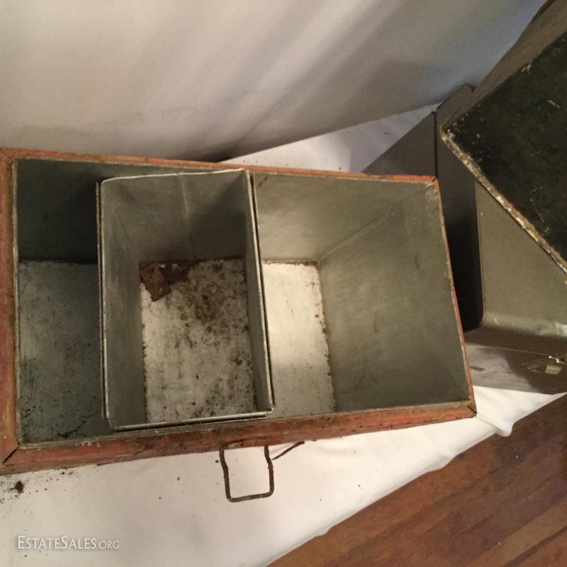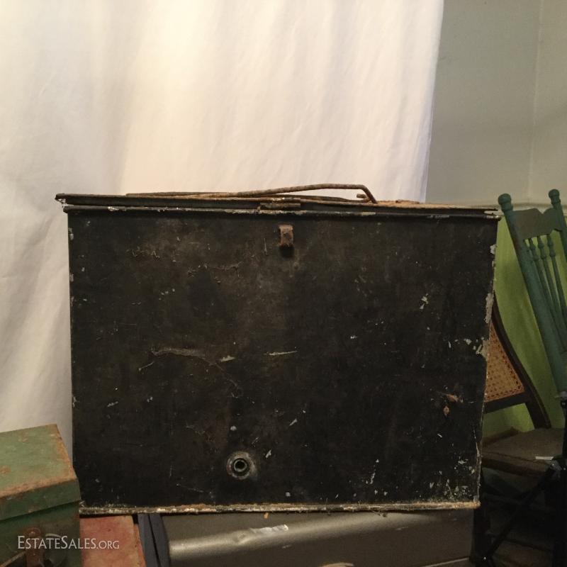 .Black and red metal boxes are old ice chests in somewhat rough shape. Grey one is a small file box. Black one measures 16.5"l x 12"w x 12h. Lot is available for local pick up only in Saluda, NC.