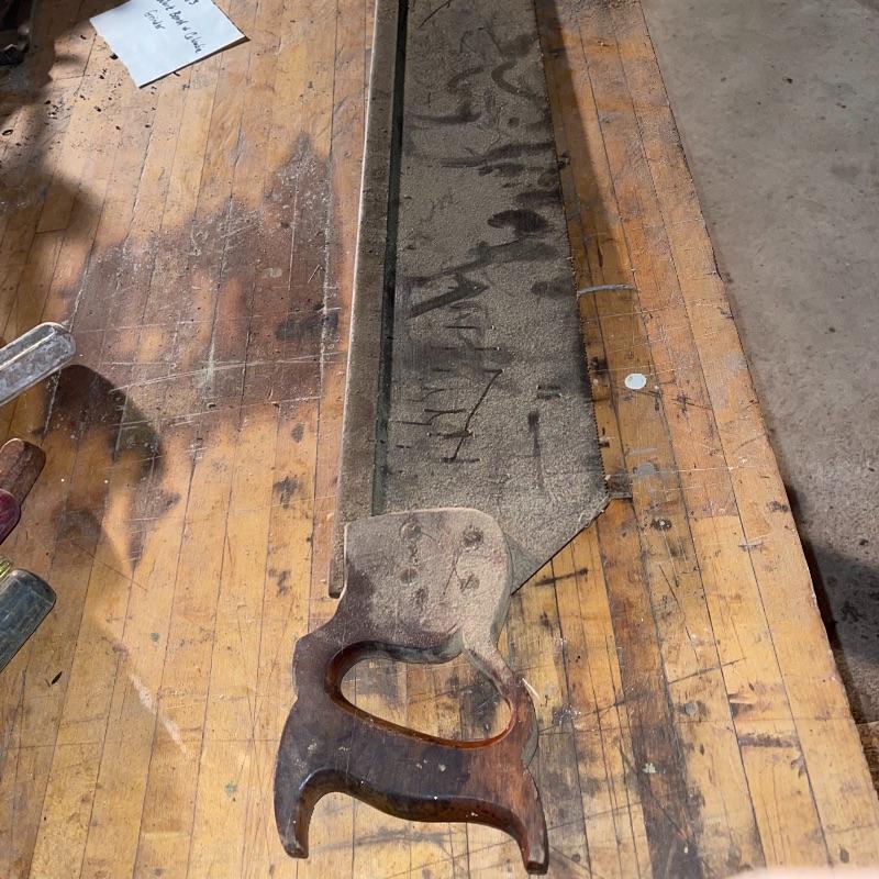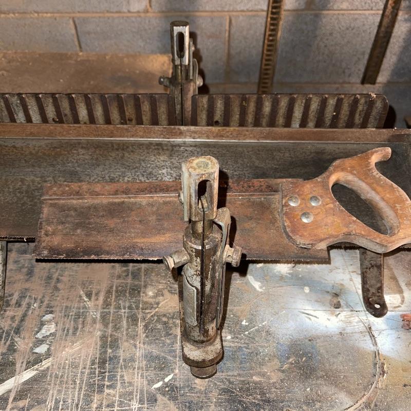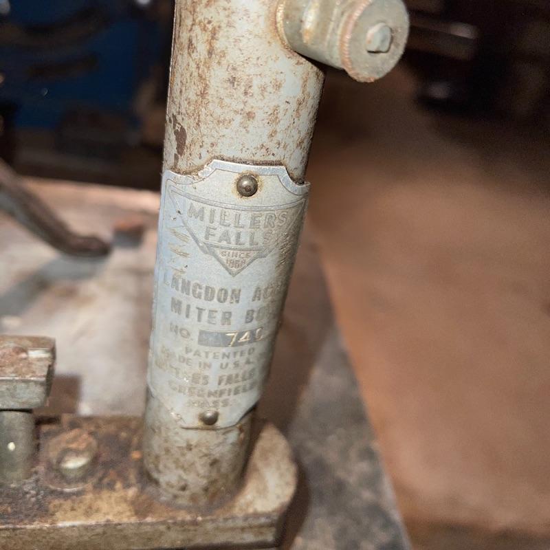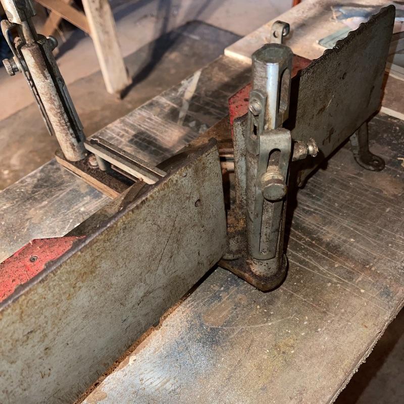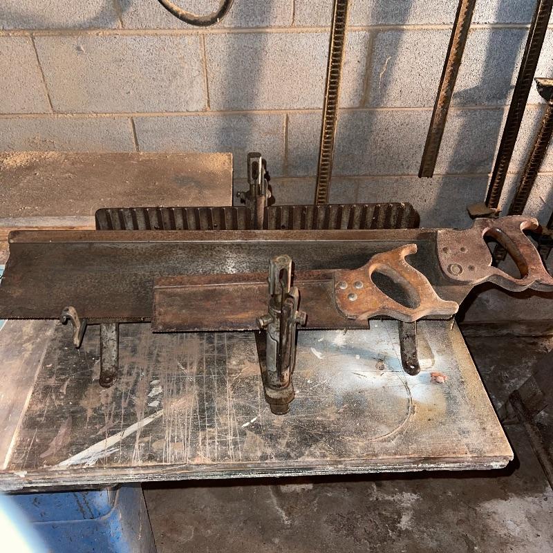 Vintage miter saws and box. Miller Falls, Langdon Acme brand. A bit rusty from age, both saws and box. Saws have wooden handles.