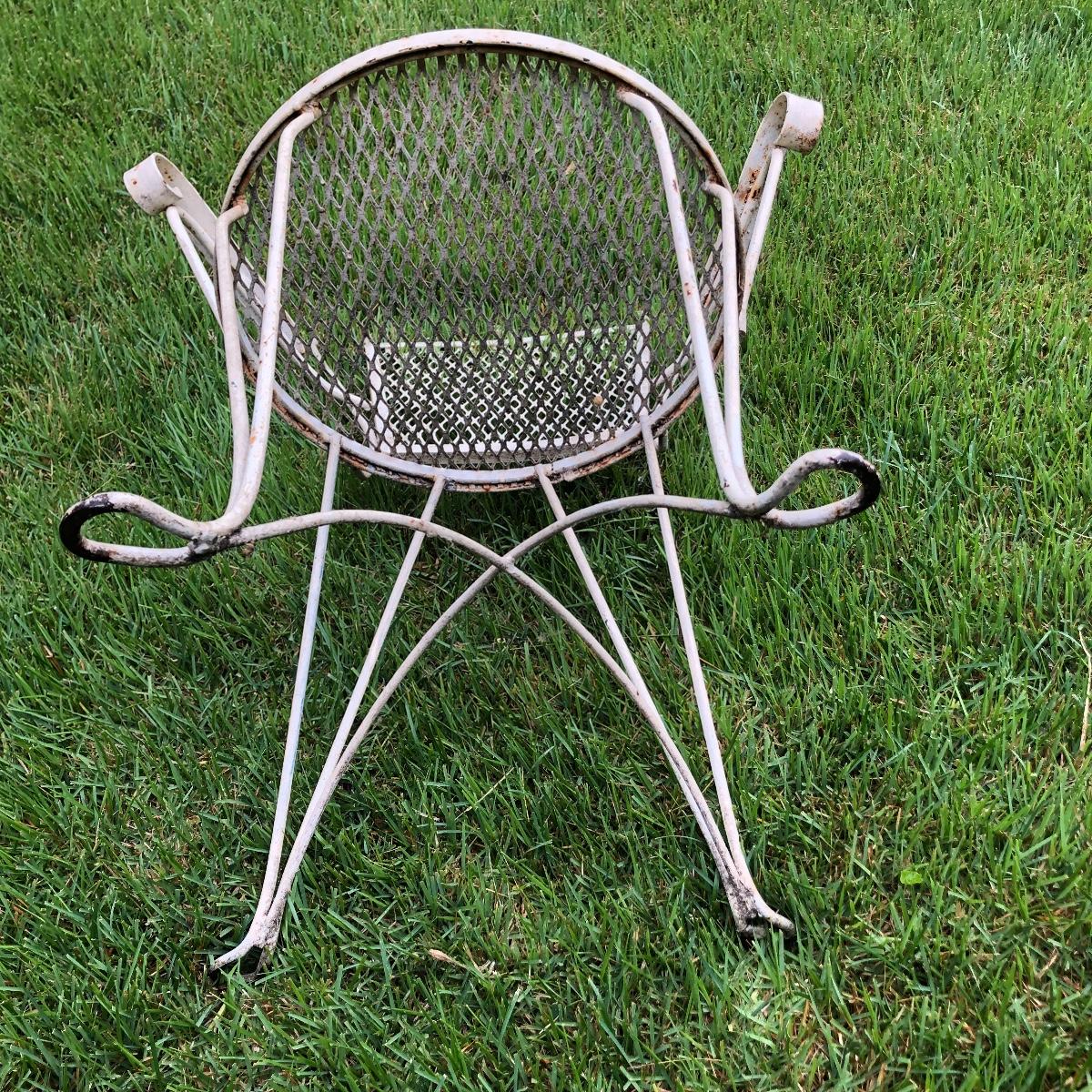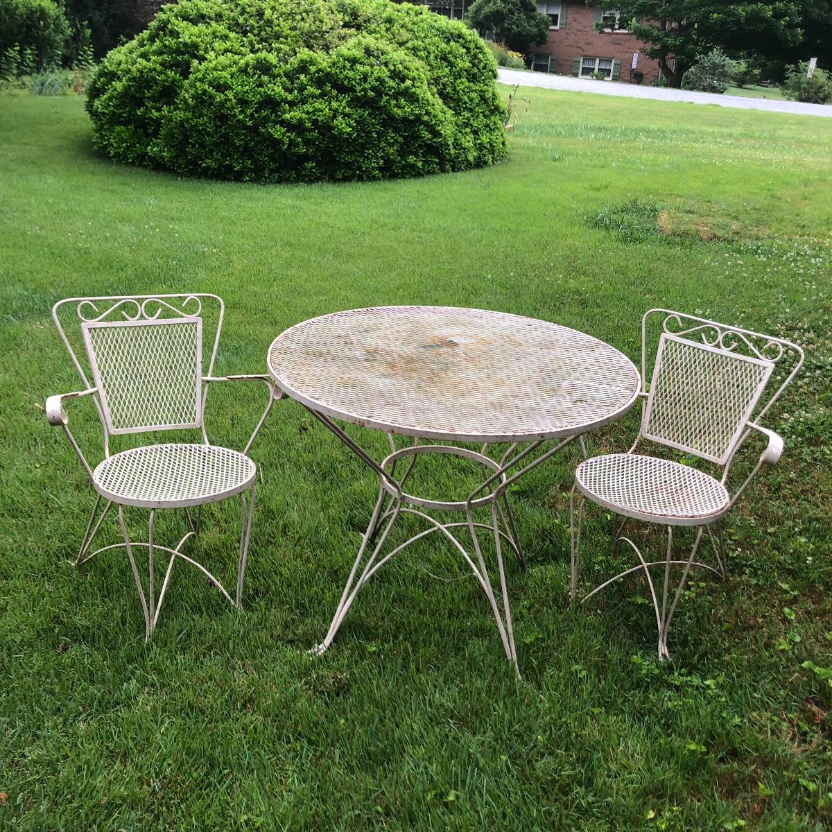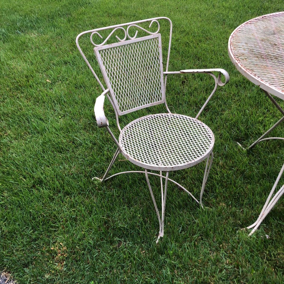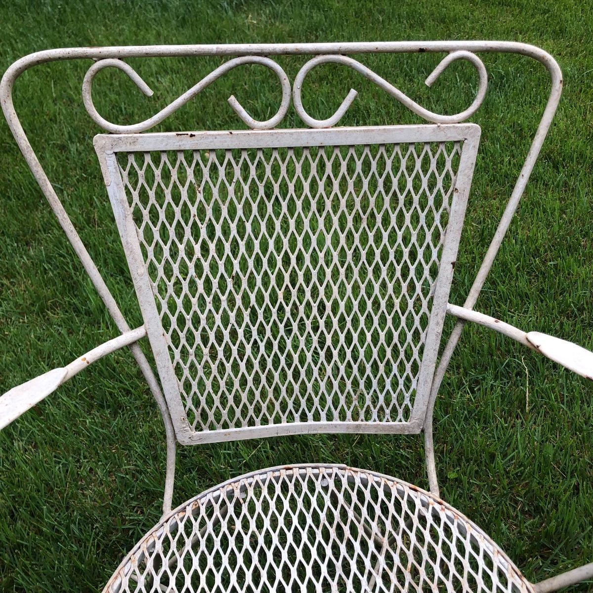 Built to last this vintage patio set is in great condition! Some minor surface rust and aged paint has these 3 pieces perfectly distressed for that shabby chic look or with a fresh coat of paint they will be restored to a newer look. The two matching chairs measure 23” wide x 20” deep x 28” tall with 16” seat height. Table measures 35” diameter x 28” tall.
