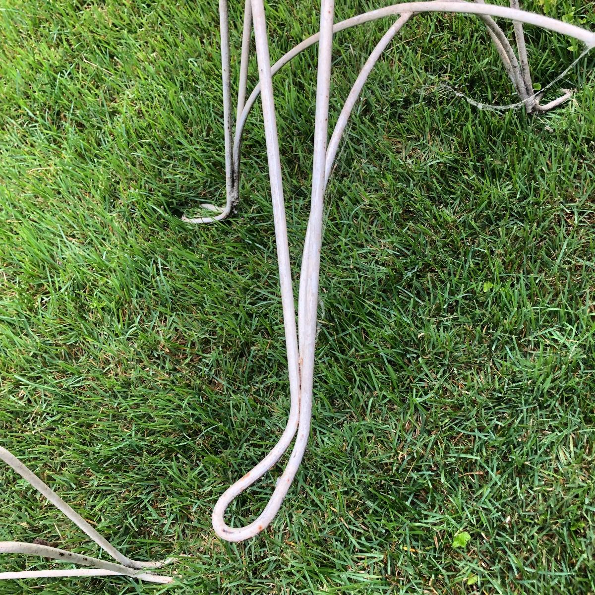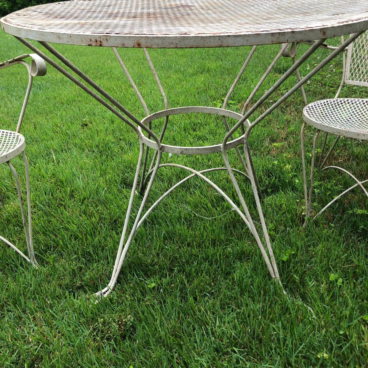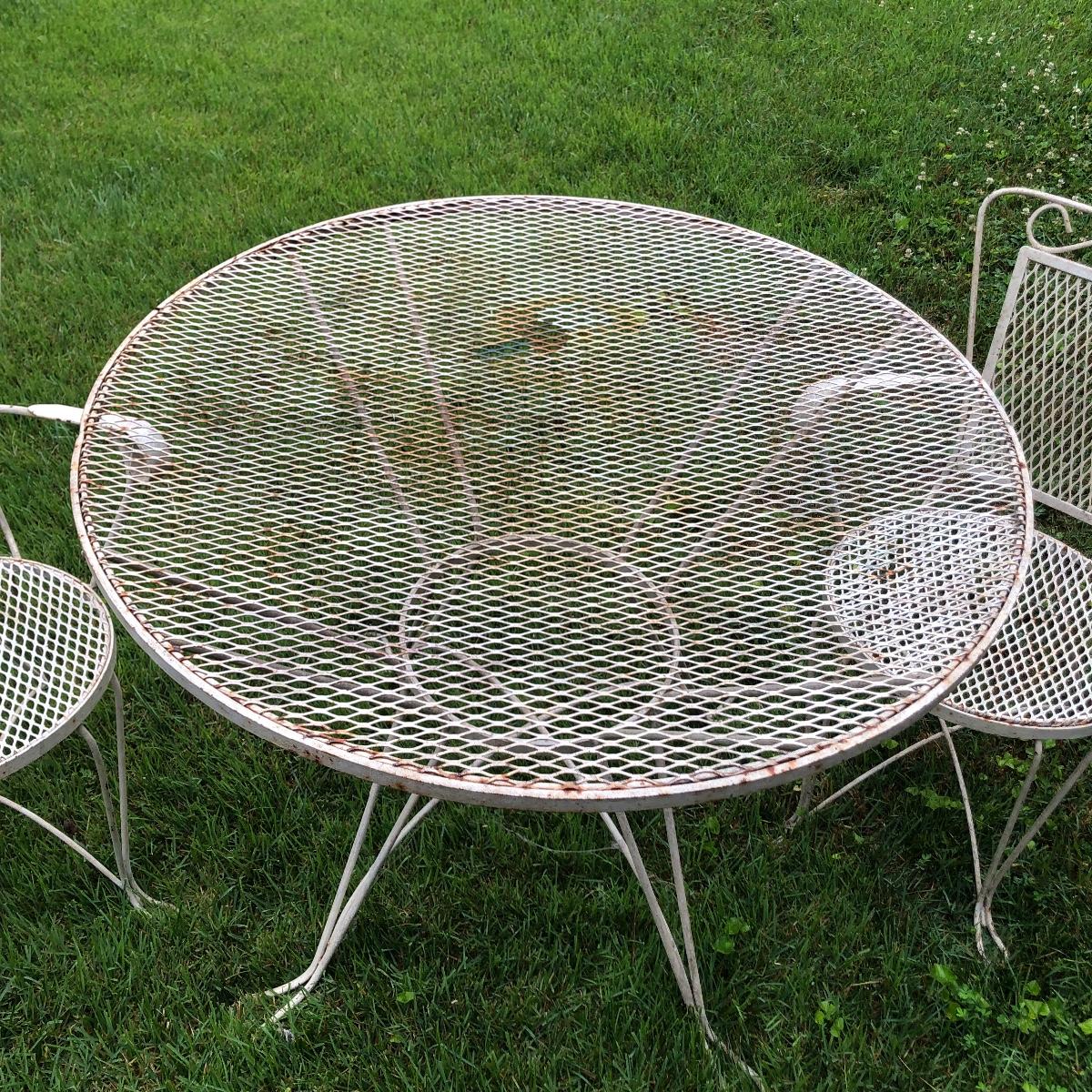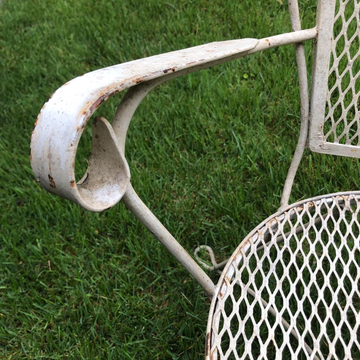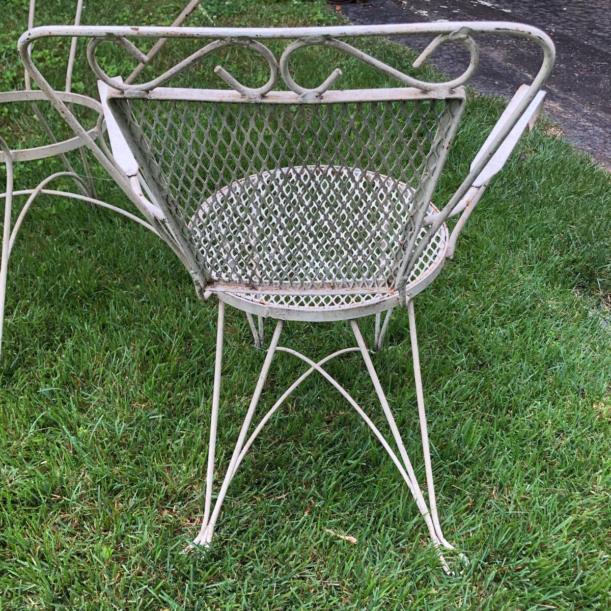 Built to last this vintage patio set is in great condition! Some minor surface rust and aged paint has these 3 pieces perfectly distressed for that shabby chic look or with a fresh coat of paint they will be restored to a newer look. The two matching chairs measure 23” wide x 20” deep x 28” tall with 16” seat height. Table measures 35” diameter x 28” tall.