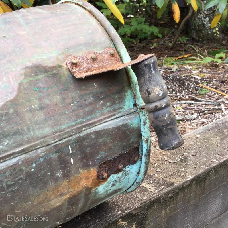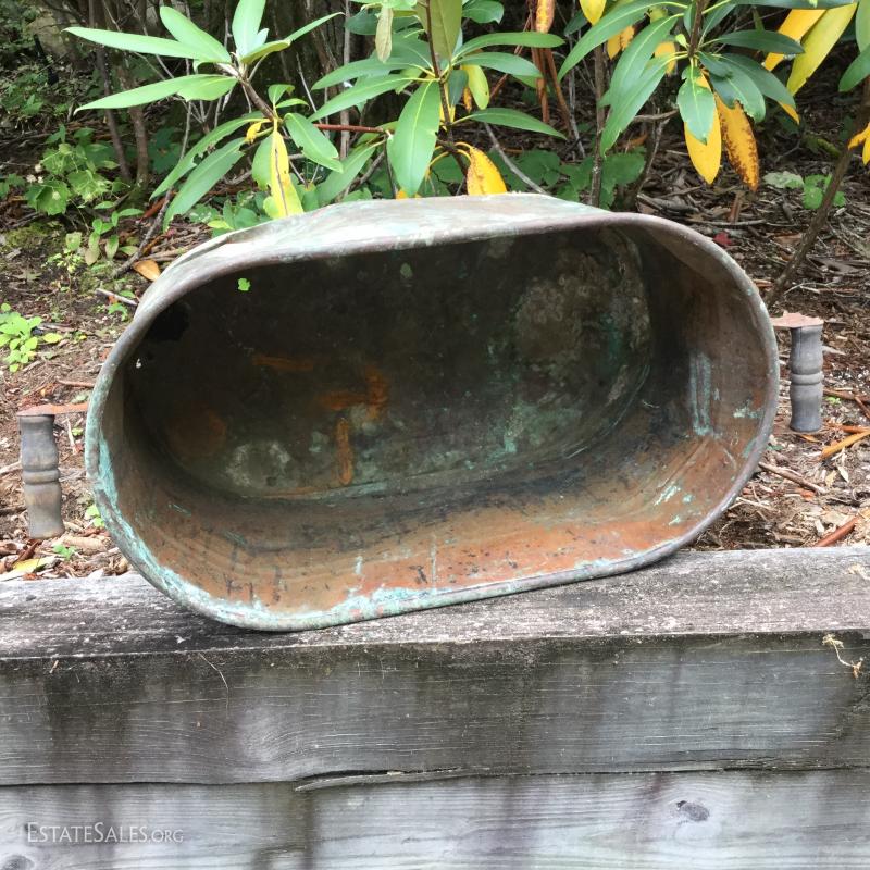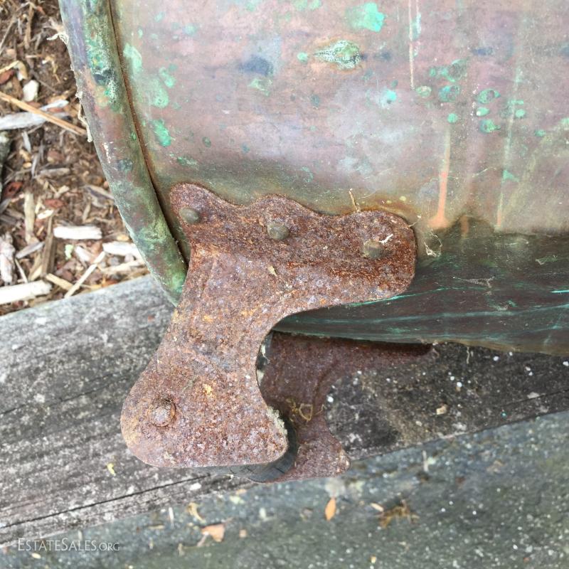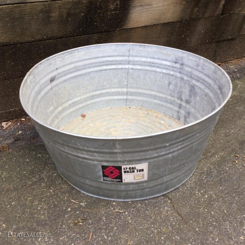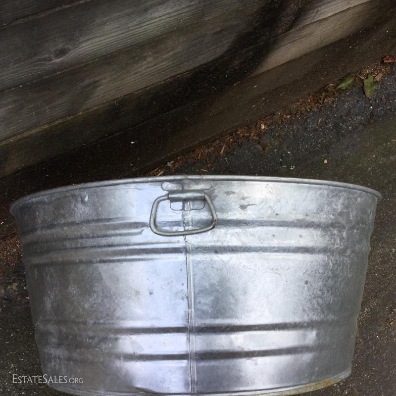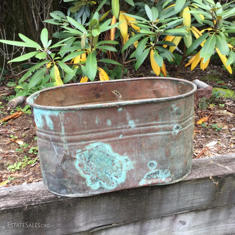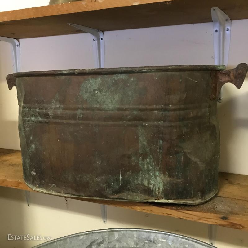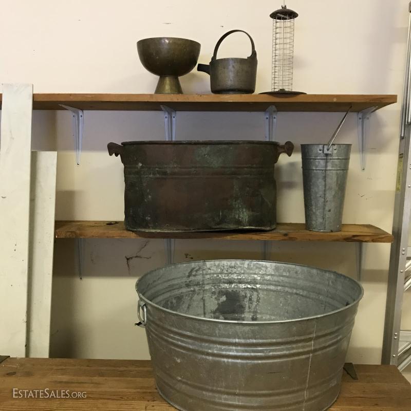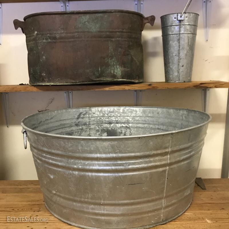 Nice large almost-new 27-gallon galvanized wash tub and nicely weathered and worn cooper tub in this lot. Cooper tub has dents, discoloration and broken handle that give it character. Also includes smaller bucket, bird feeder, and two brass pieces. See photos. No Shipping. Only local pick up in Flat Rock, NC.
