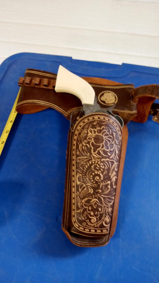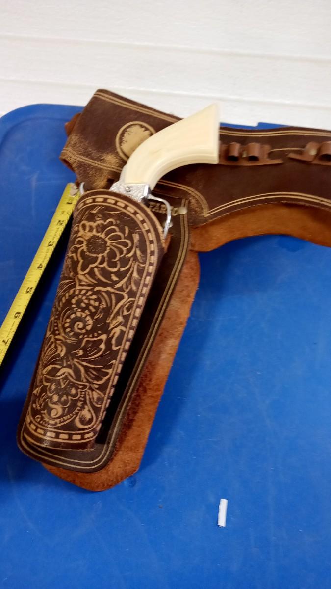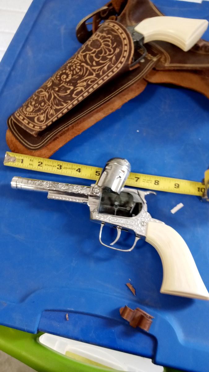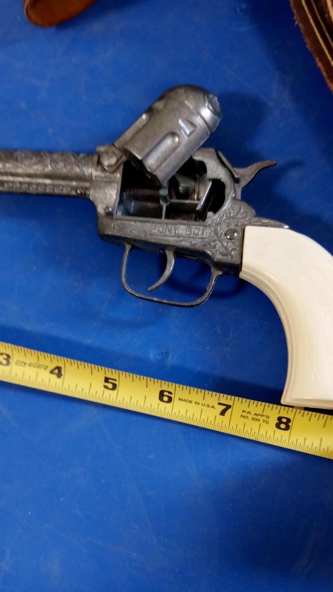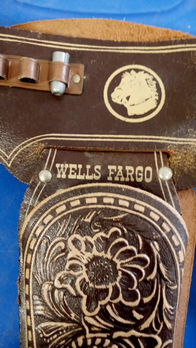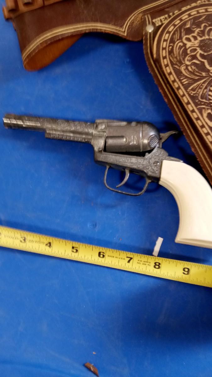 GUNS WORK BOTH ARE PONEY BOYS BUT DO NOT MATCH, HOLSTER MARKED WELLS FARGO BULLET CLIPS ON HOLSTER ARE BROKEN IN ONE SPOT BUT IN CLUDDED