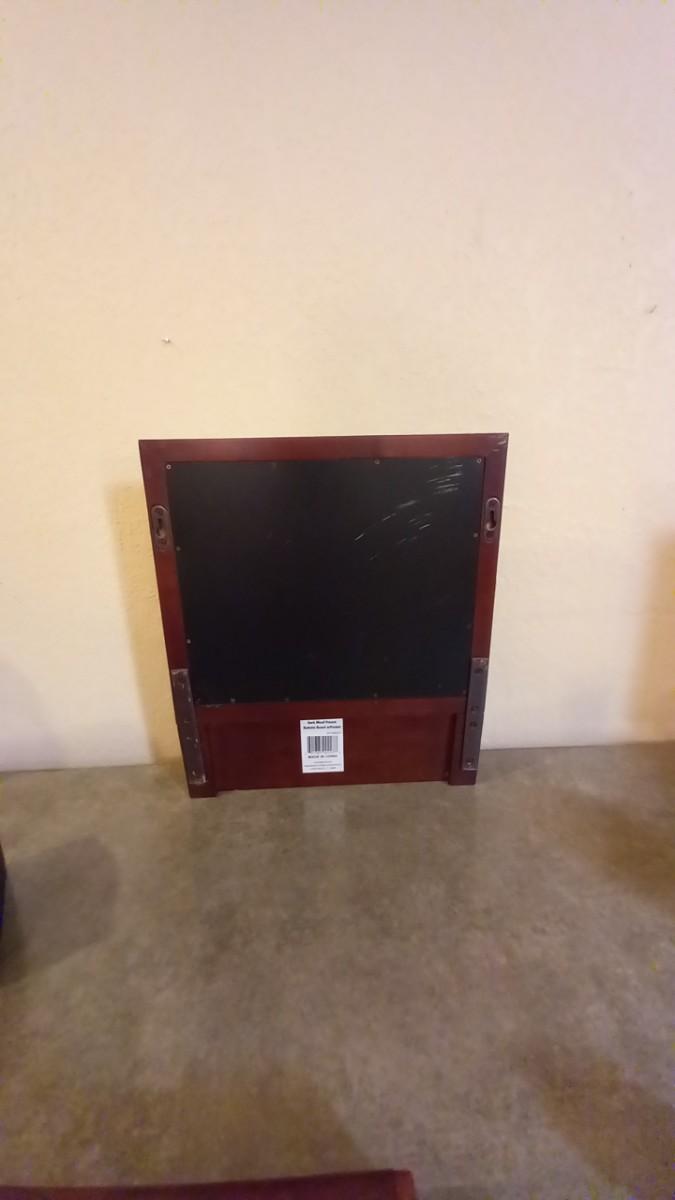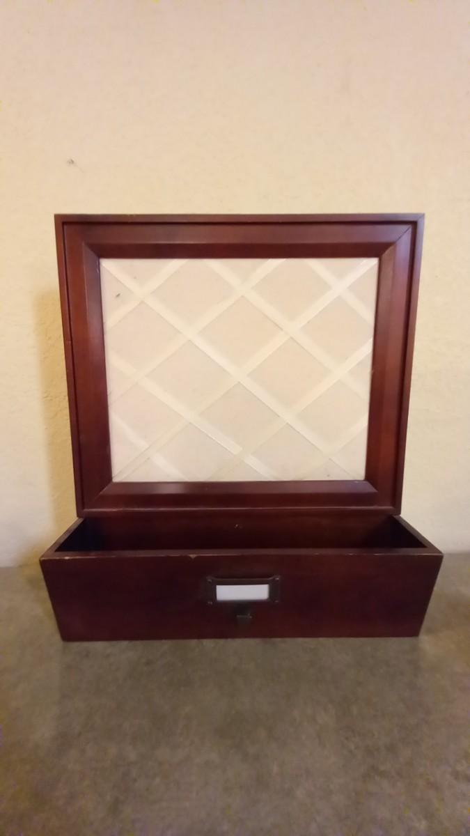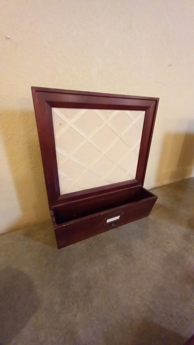 THE WALL HUNG ORGANIZER HOLDS PICTURES OR NOTES AND HAS A SPACE FOR MISC 14X16,