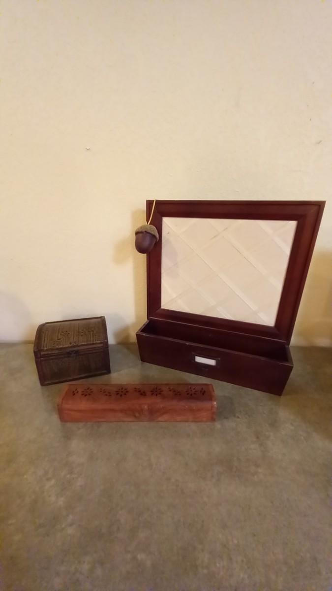 LOT 165  WOODEN INCENSE BOX, SQUARE BOX AND A WALL HUNG ORGANIZER (HD)