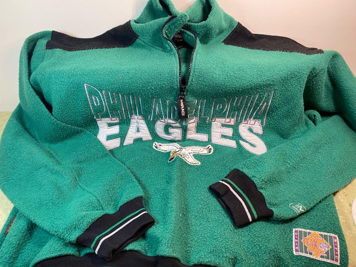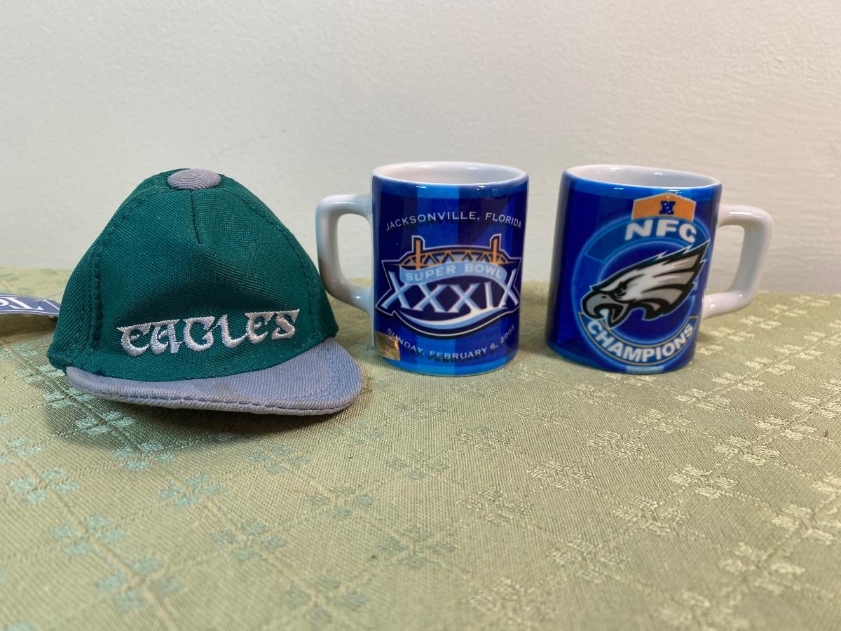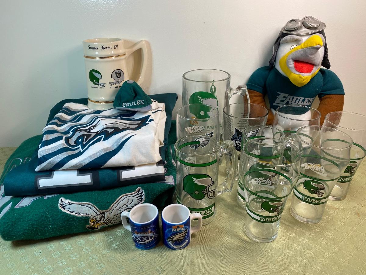 Lot 165: Phildelphia Eagles Collection Including Fleece Pullover, a NFl Players Jersey, a Starter T-Shirt, Cap, Plush Glasses and Mugs