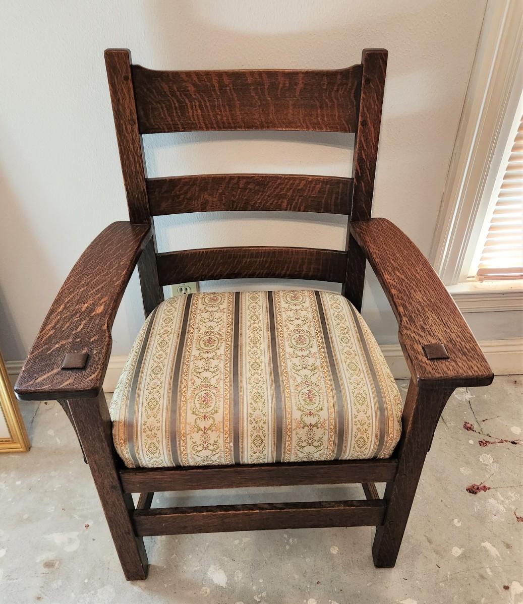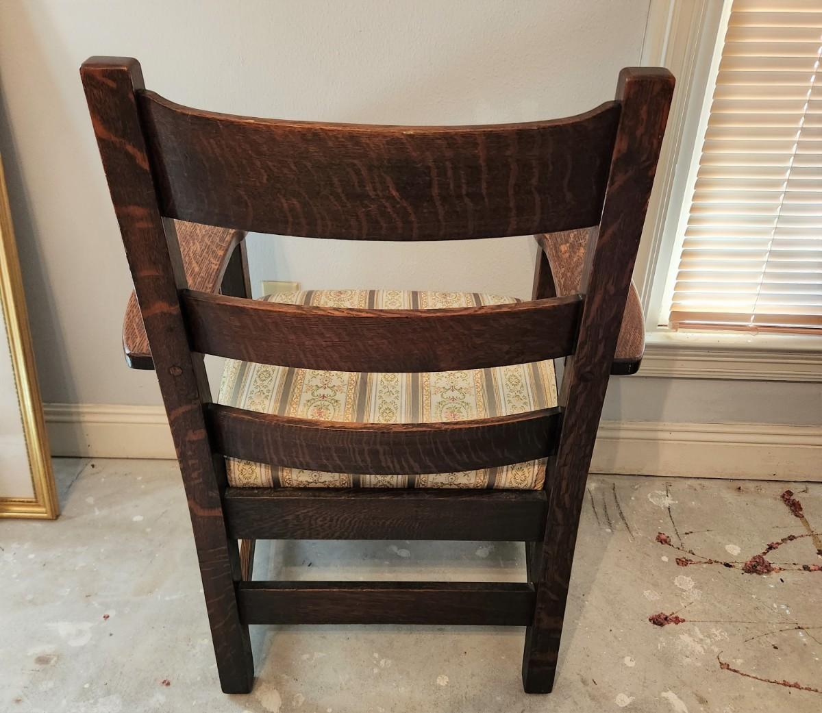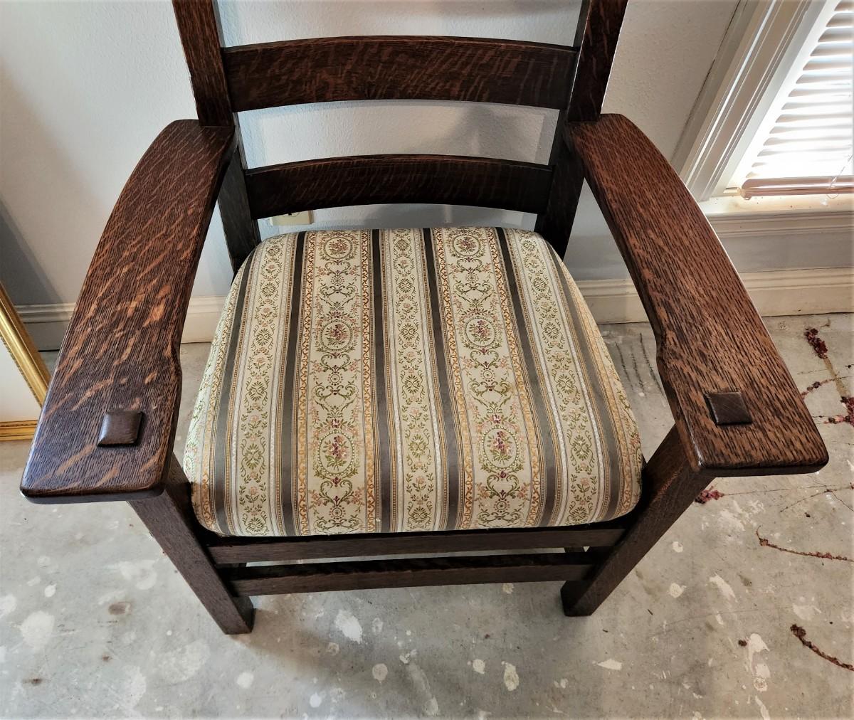 Solid oak - very heavy -Mission Style (no maker noted) armchair. Great condition - 22" deep, 27" across, 35" tall.