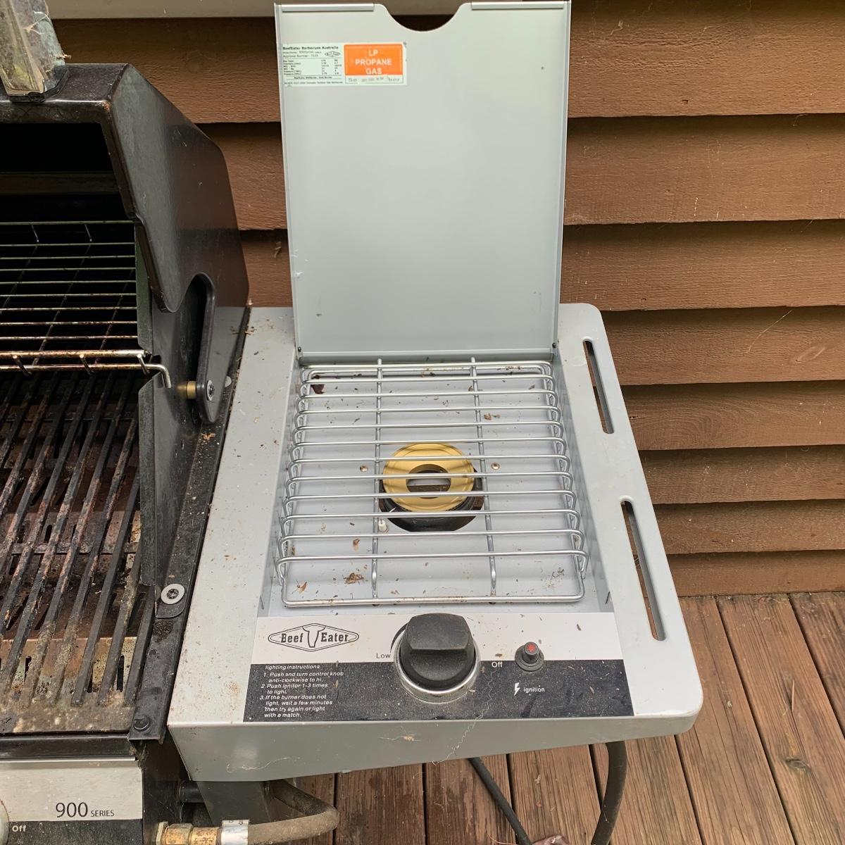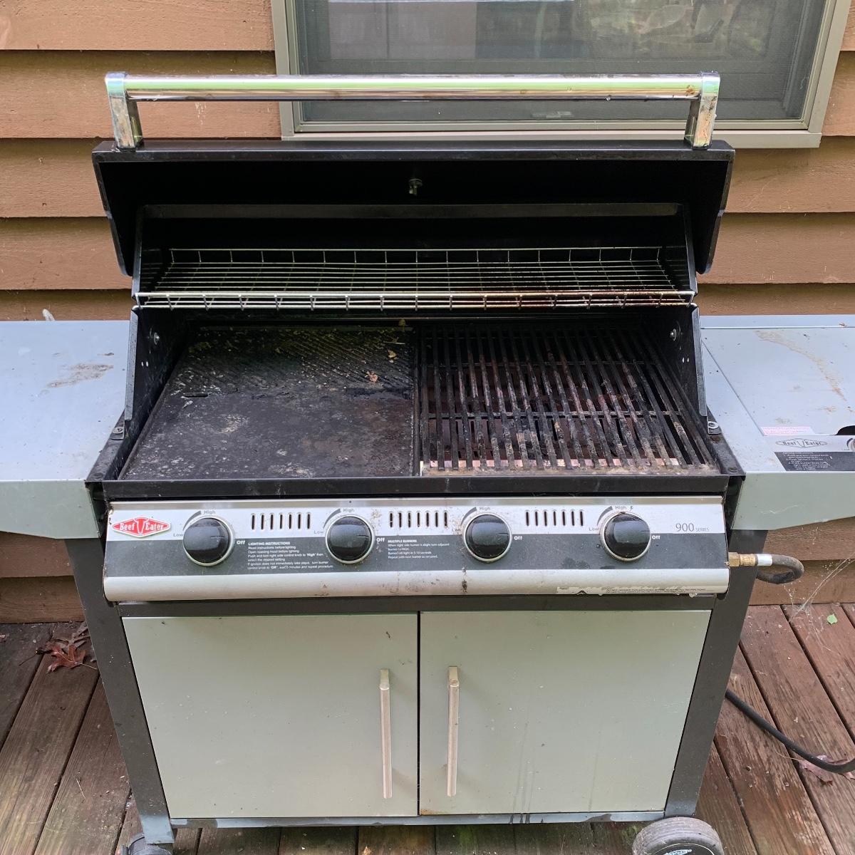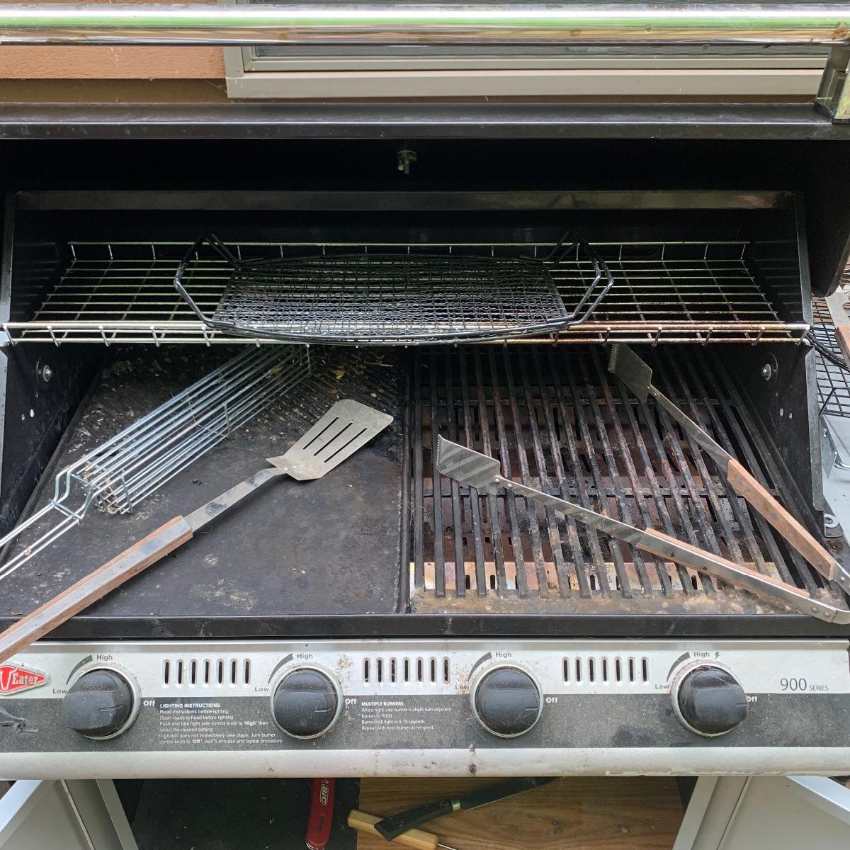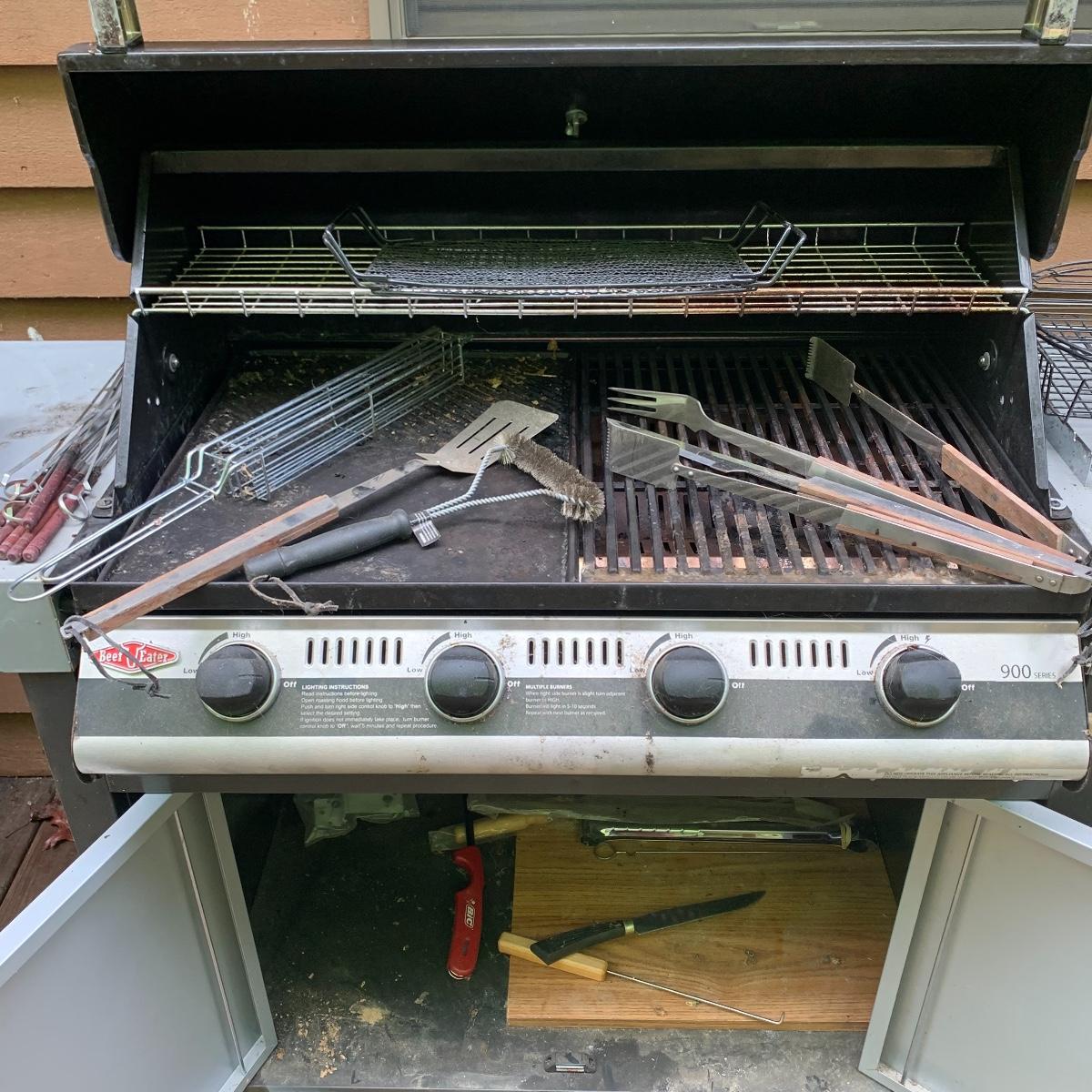 Feed the masses with this versatile Beef Eater gas grill. This is the 900 series and features a griddle, a grill, bun warming rack, food warming deck/ side grill, side table, and electric ignition. There is also ample storage found behind double doors under the grill top. This lot also features numerous grilling tools including spatulas, scrapers, several grill racks, metal kabob skewers, a bbq mop and more. There are also two bbq books by Steven Raichen full of great recipes. Local pickup only.
