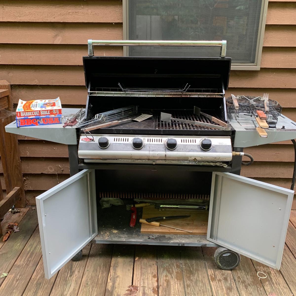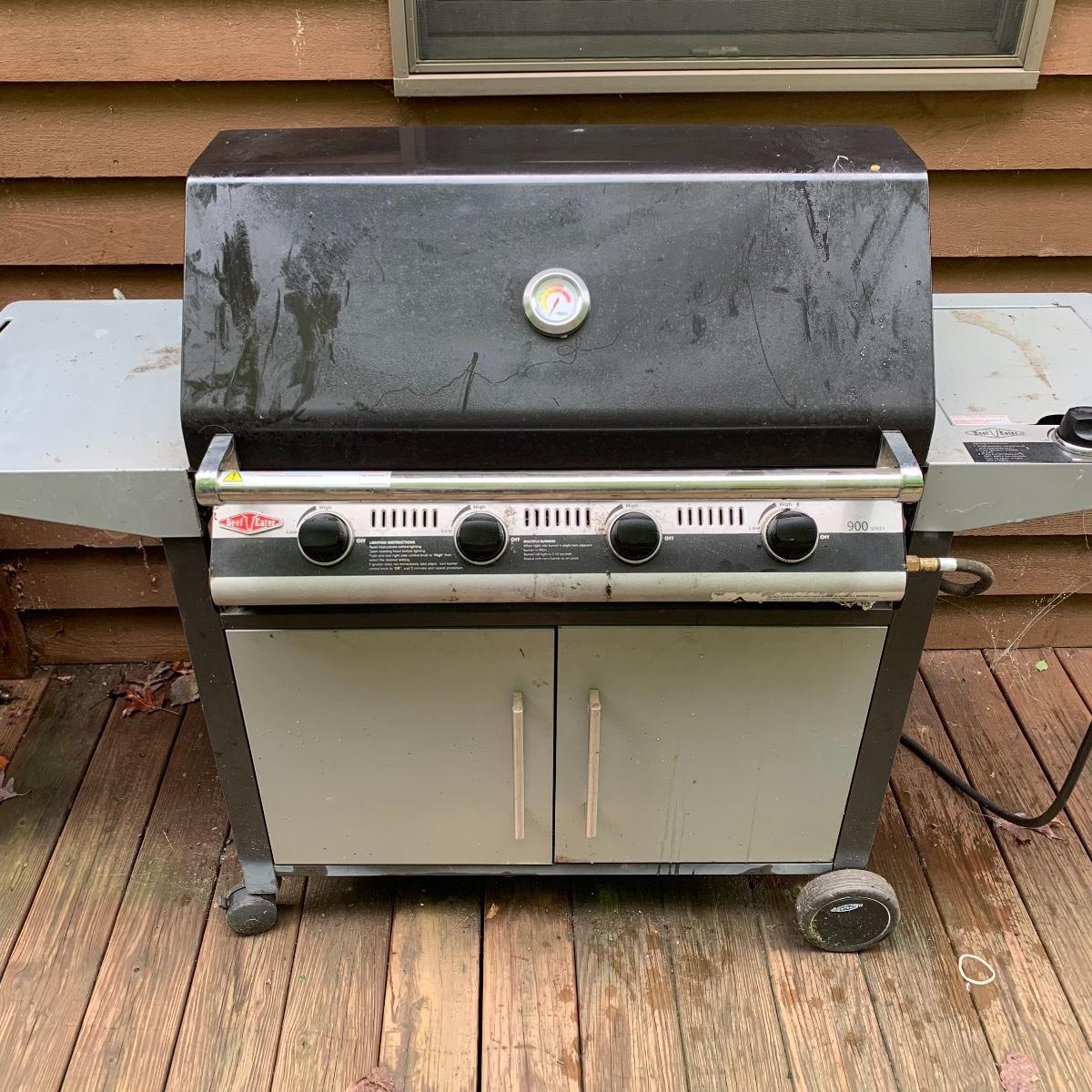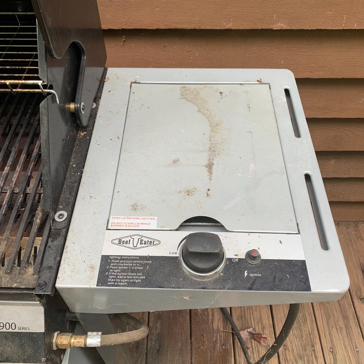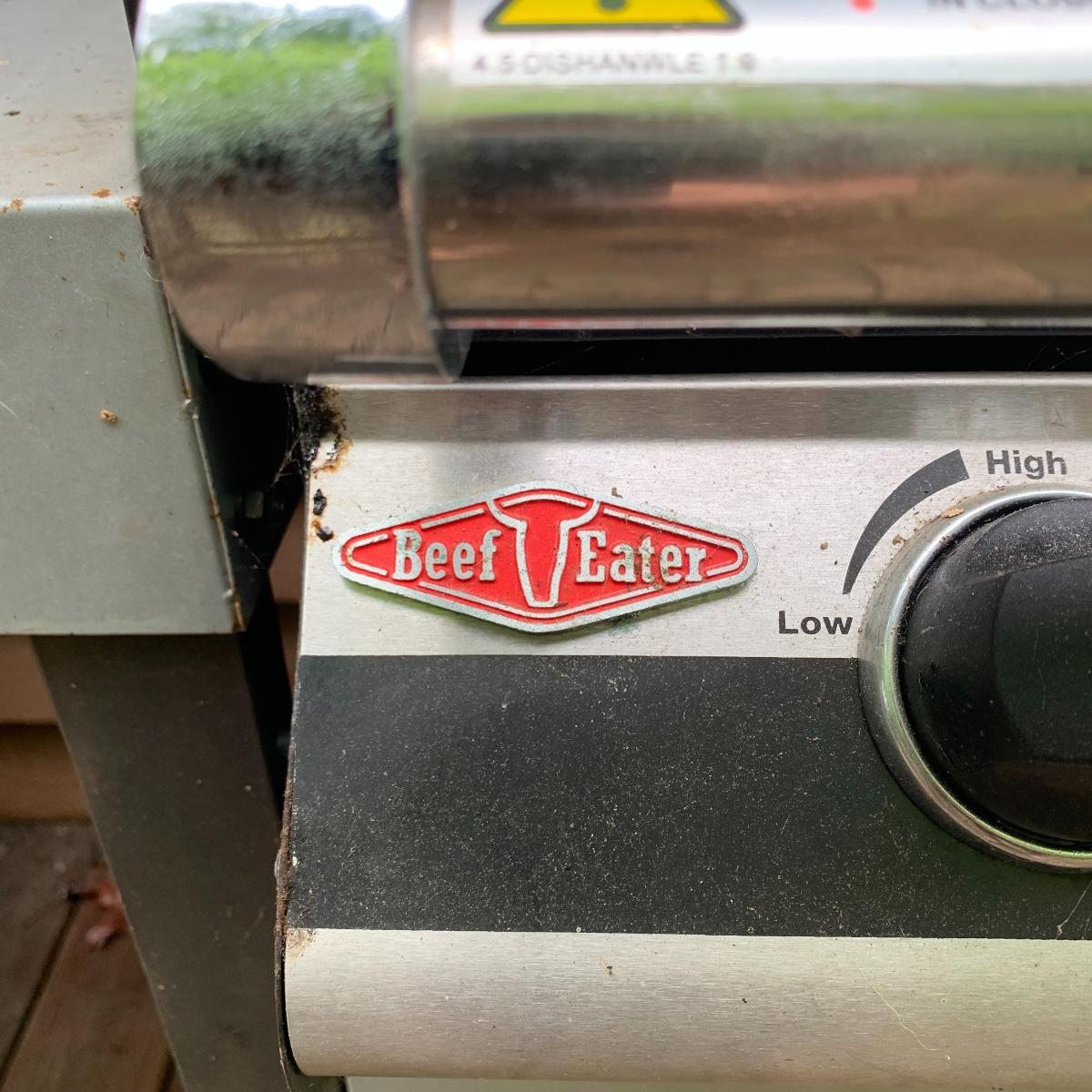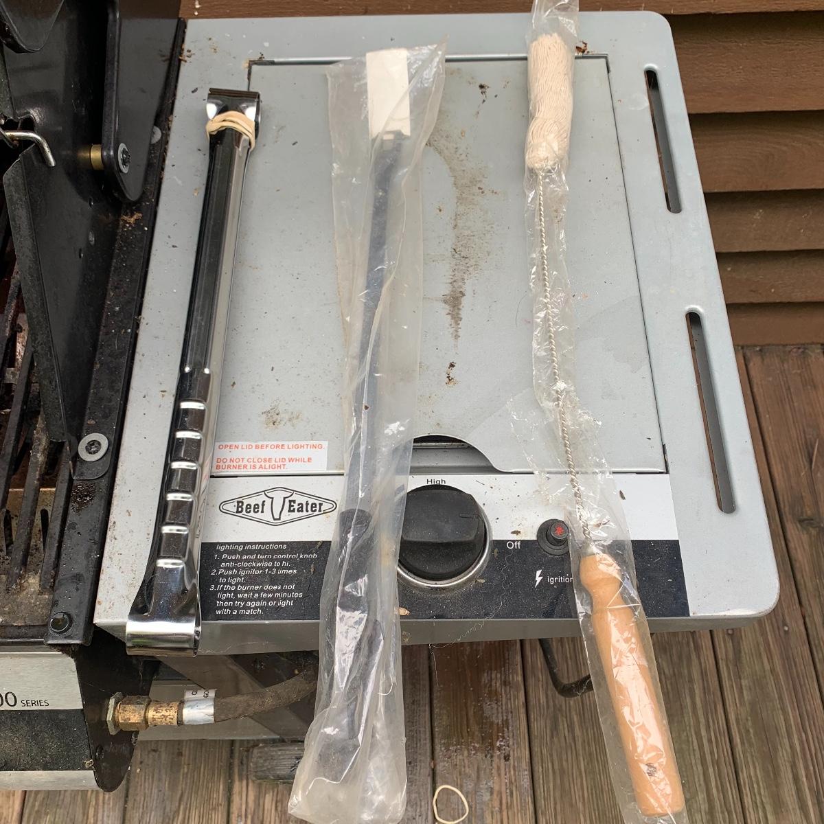 Feed the masses with this versatile Beef Eater gas grill. This is the 900 series and features a griddle, a grill, bun warming rack, food warming deck/ side grill, side table, and electric ignition. There is also ample storage found behind double doors under the grill top. This lot also features numerous grilling tools including spatulas, scrapers, several grill racks, metal kabob skewers, a bbq mop and more. There are also two bbq books by Steven Raichen full of great recipes. Local pickup only.
