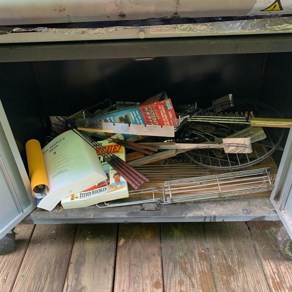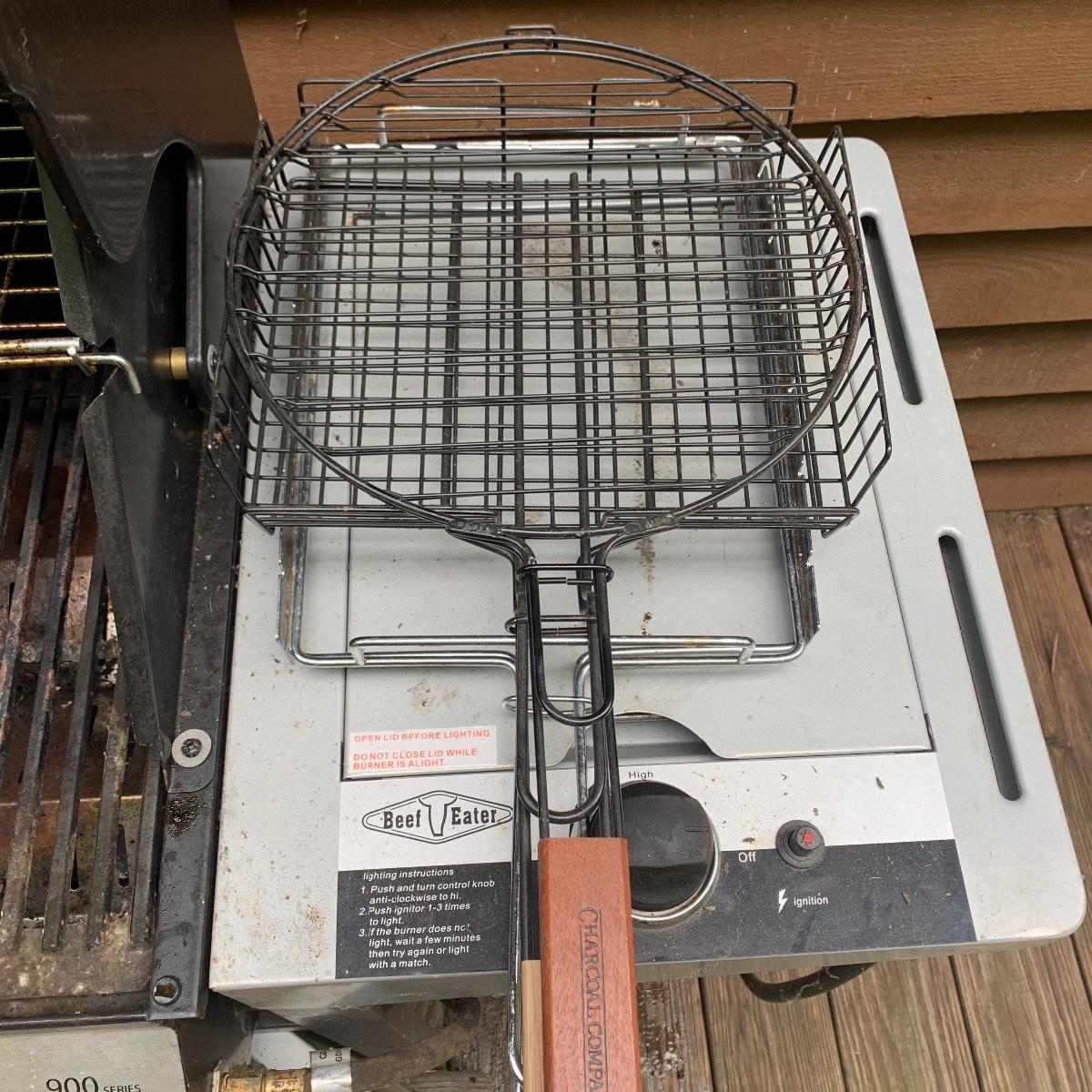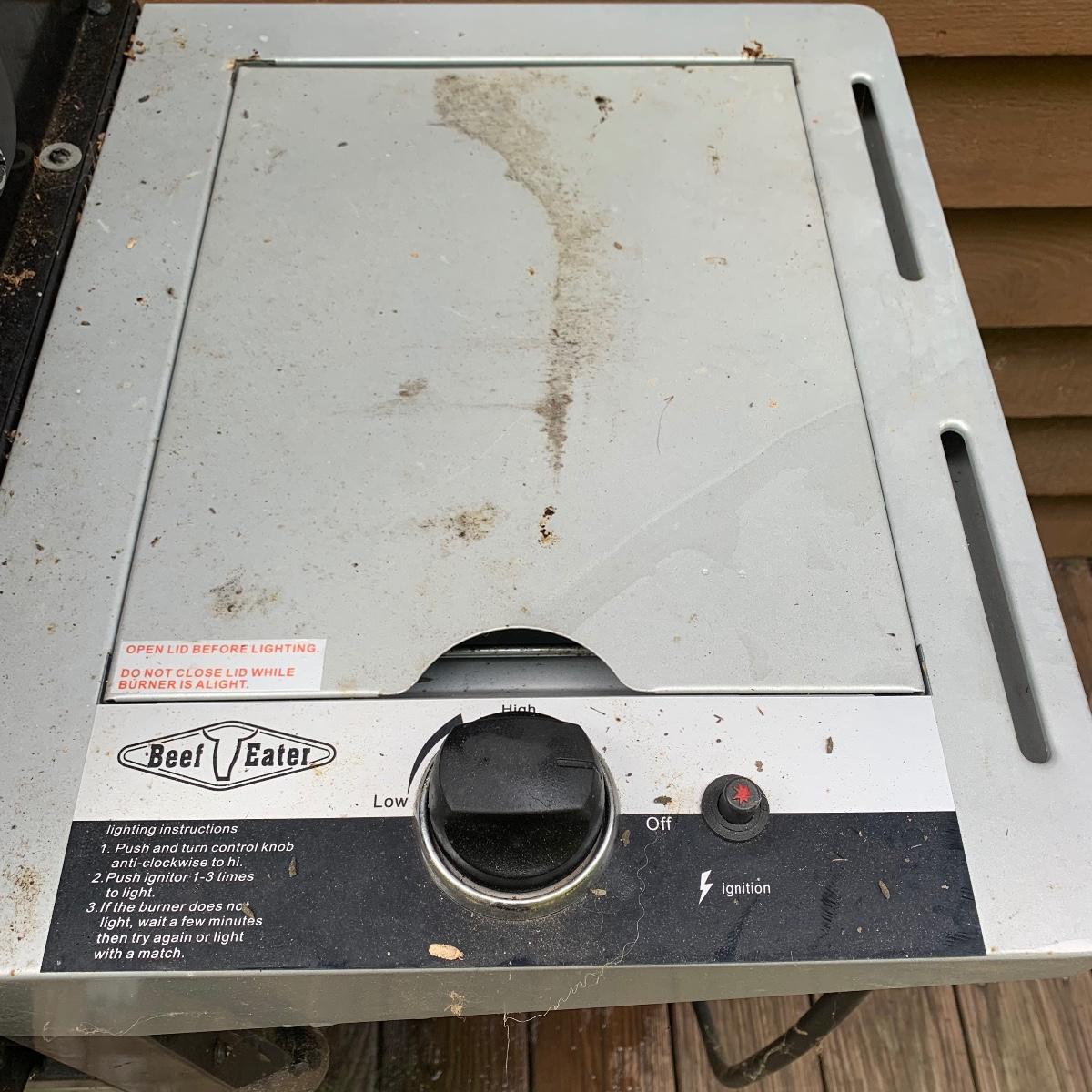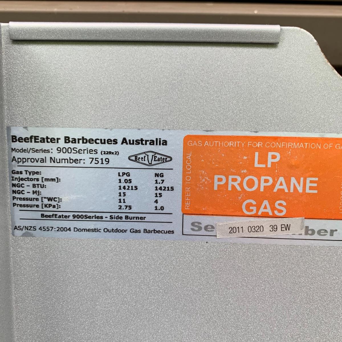 Feed the masses with this versatile Beef Eater gas grill. This is the 900 series and features a griddle, a grill, bun warming rack, food warming deck/ side grill, side table, and electric ignition. There is also ample storage found behind double doors under the grill top. This lot also features numerous grilling tools including spatulas, scrapers, several grill racks, metal kabob skewers, a bbq mop and more. There are also two bbq books by Steven Raichen full of great recipes. Local pickup only.