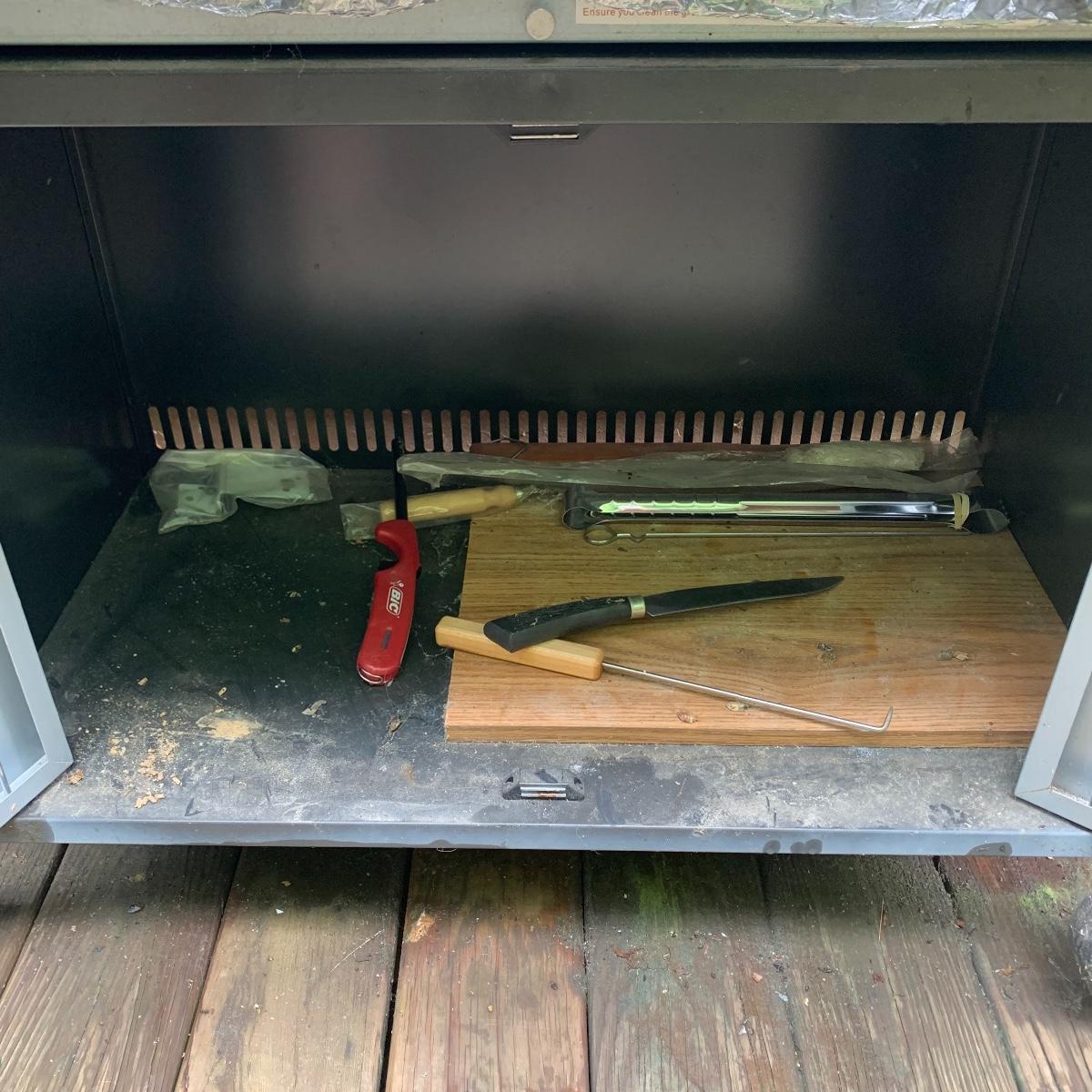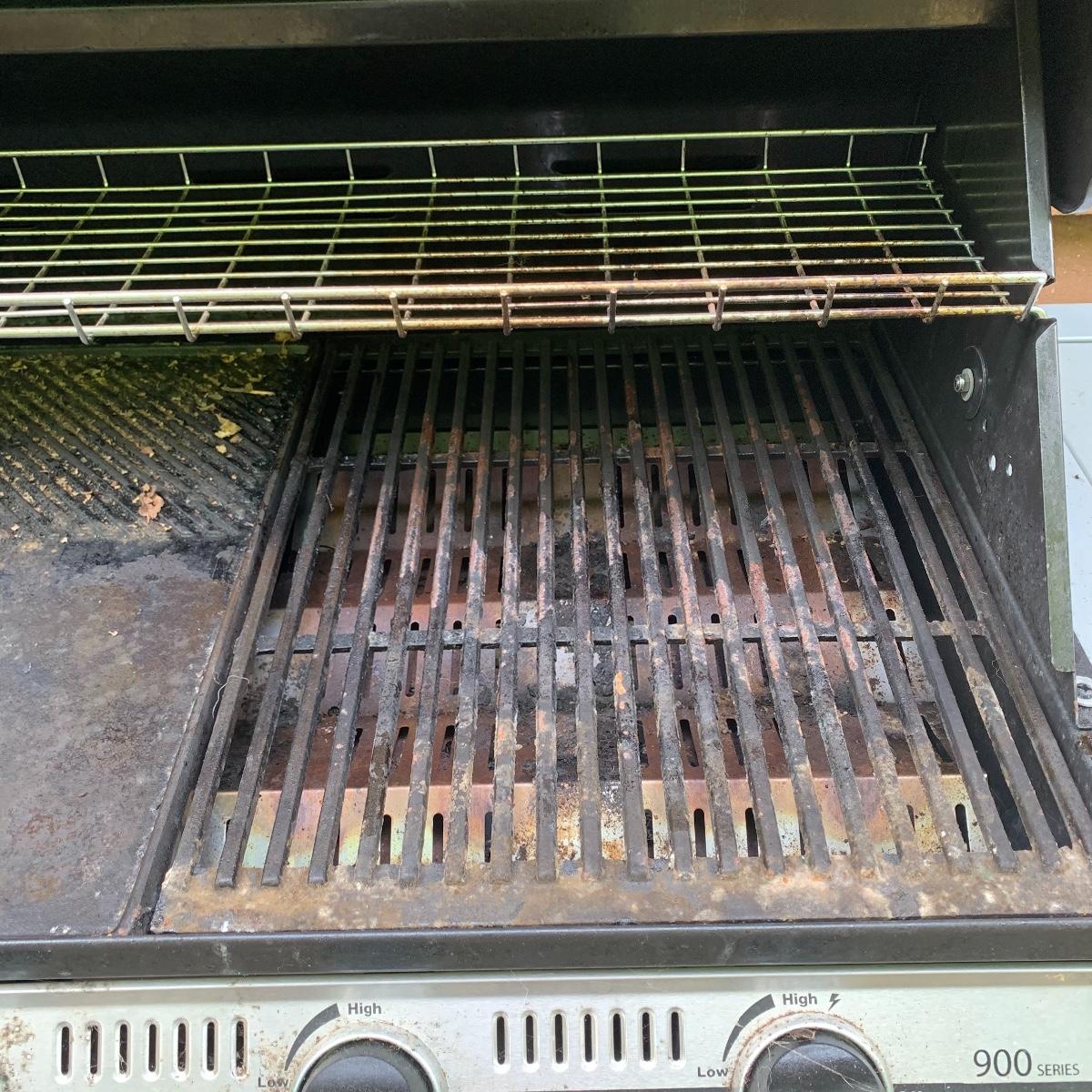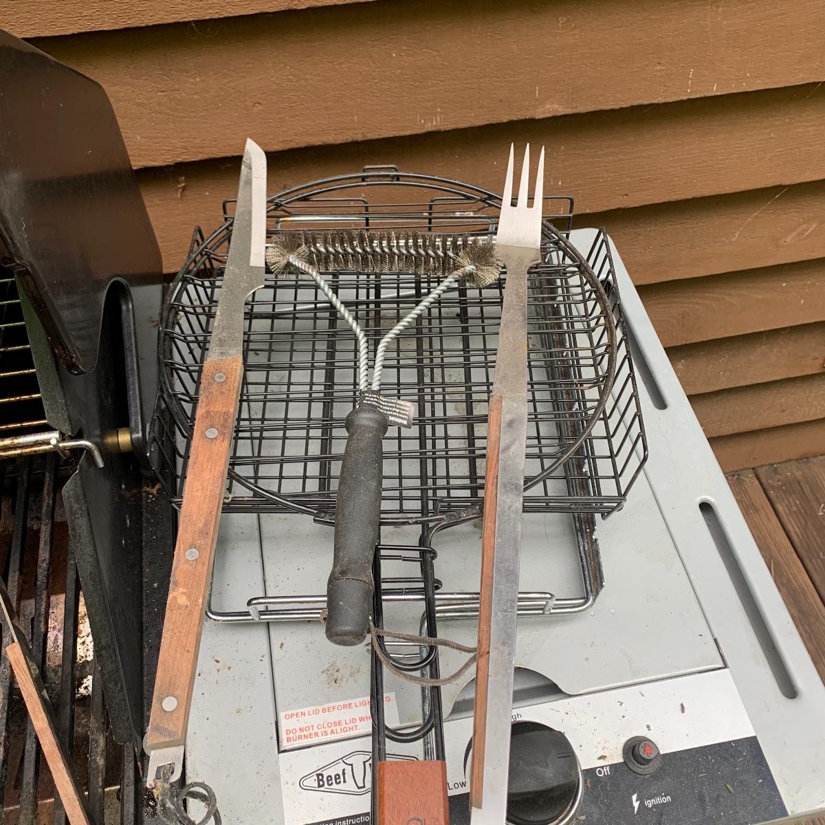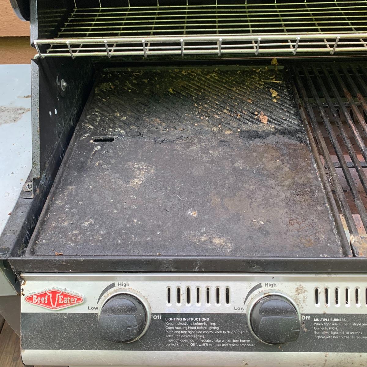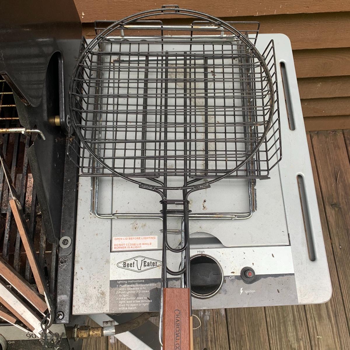 Feed the masses with this versatile Beef Eater gas grill. This is the 900 series and features a griddle, a grill, bun warming rack, food warming deck/ side grill, side table, and electric ignition. There is also ample storage found behind double doors under the grill top. This lot also features numerous grilling tools including spatulas, scrapers, several grill racks, metal kabob skewers, a bbq mop and more. There are also two bbq books by Steven Raichen full of great recipes. Local pickup only.
