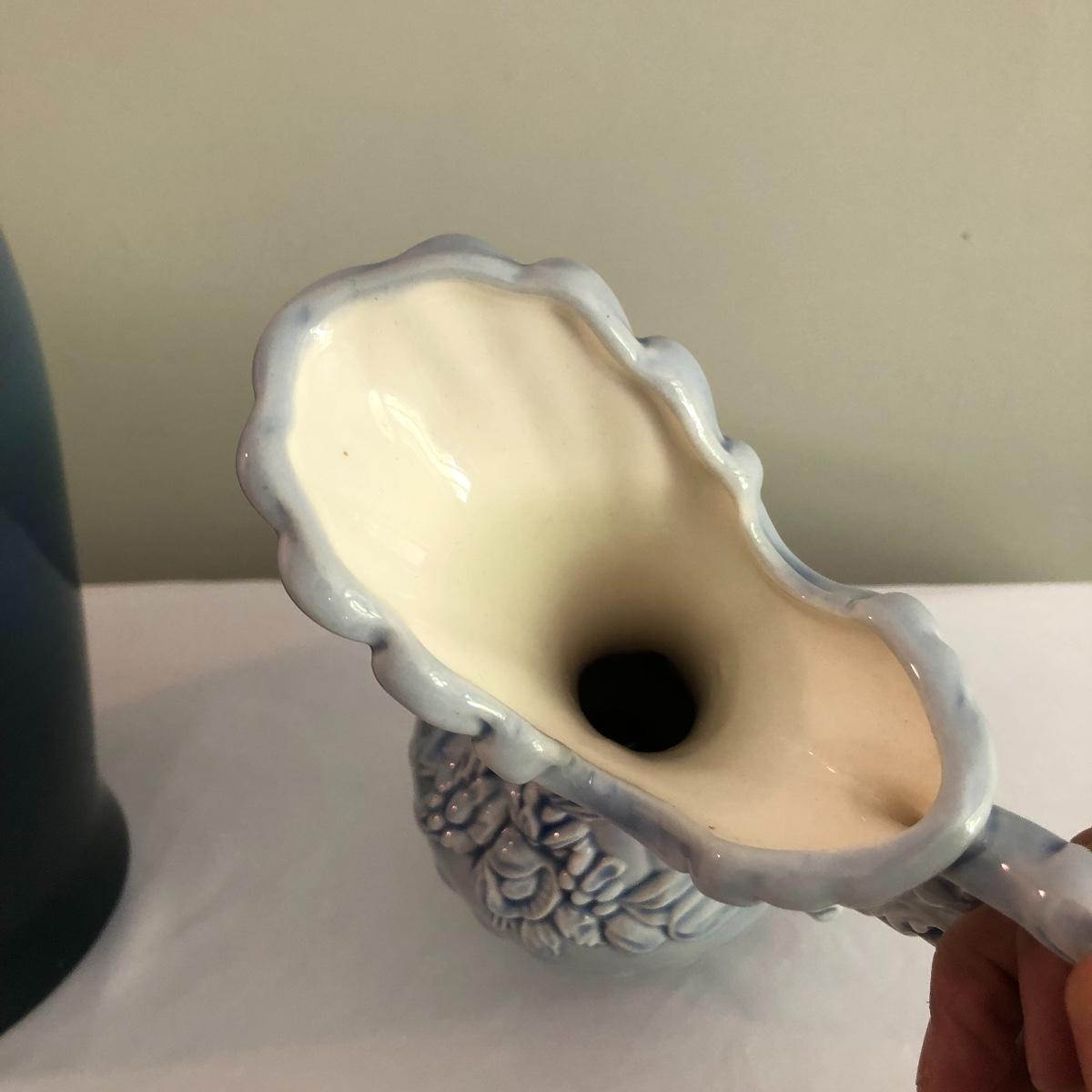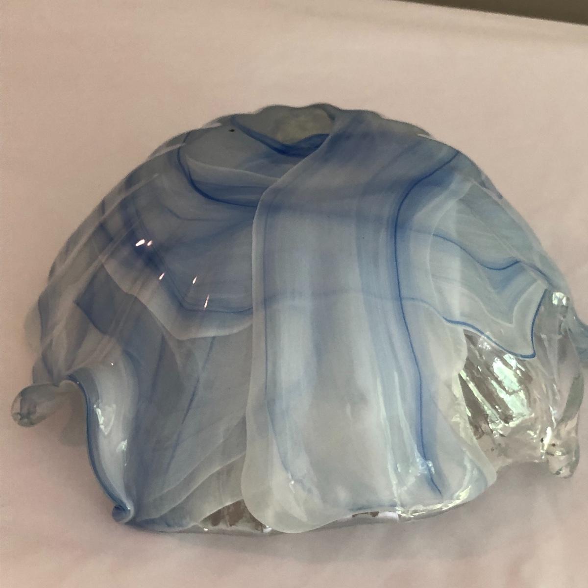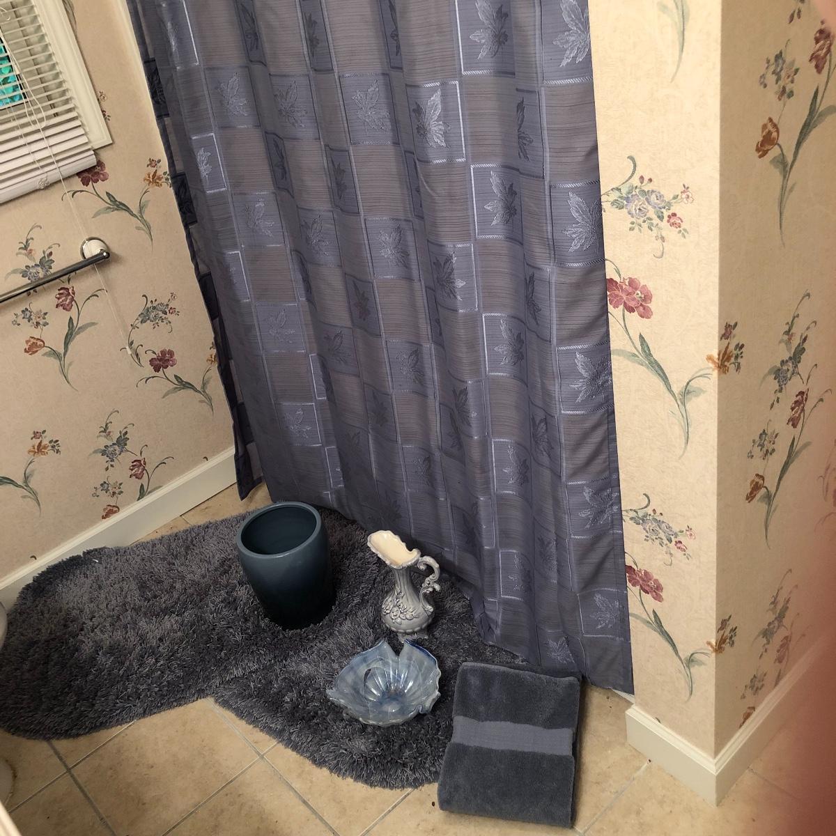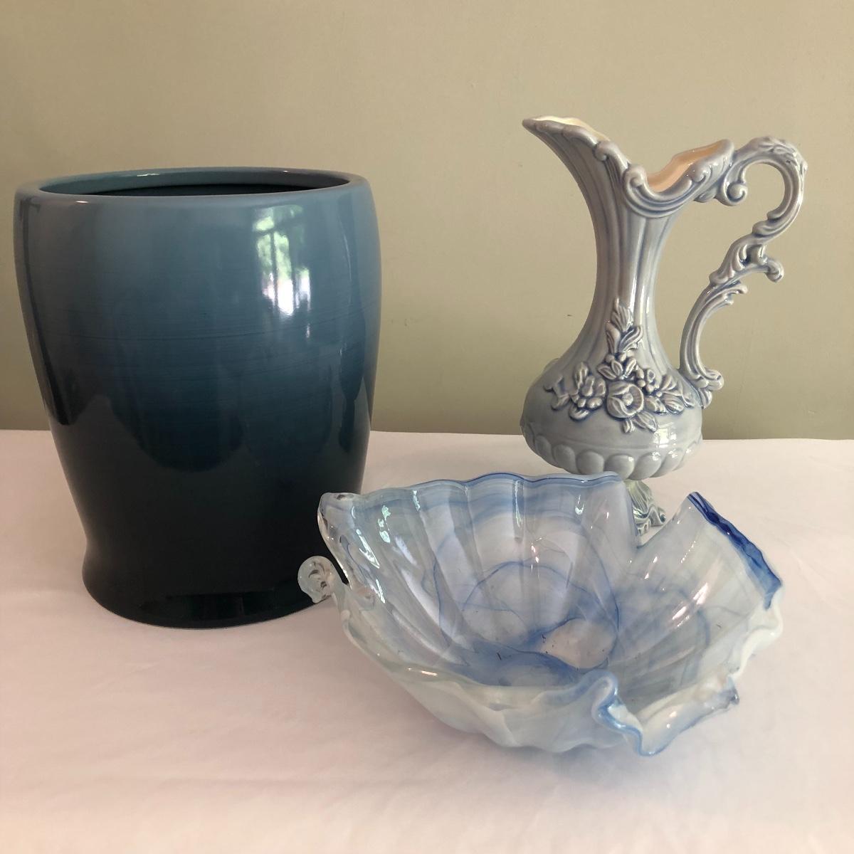 These bathroom essentials include 2 matching bath mats that measure 25” x 40”, 1 bath towel, a signed ornate ceramic pitcher, ceramic bin, shower curtain with hooks and glass bowl. All pieces perfectly compliment one another in this blue themed lot. The glass bowl in particular is very attractive with iridescent blue swirls throughout the glass, it measures 9.5” diameter x 3” tall.