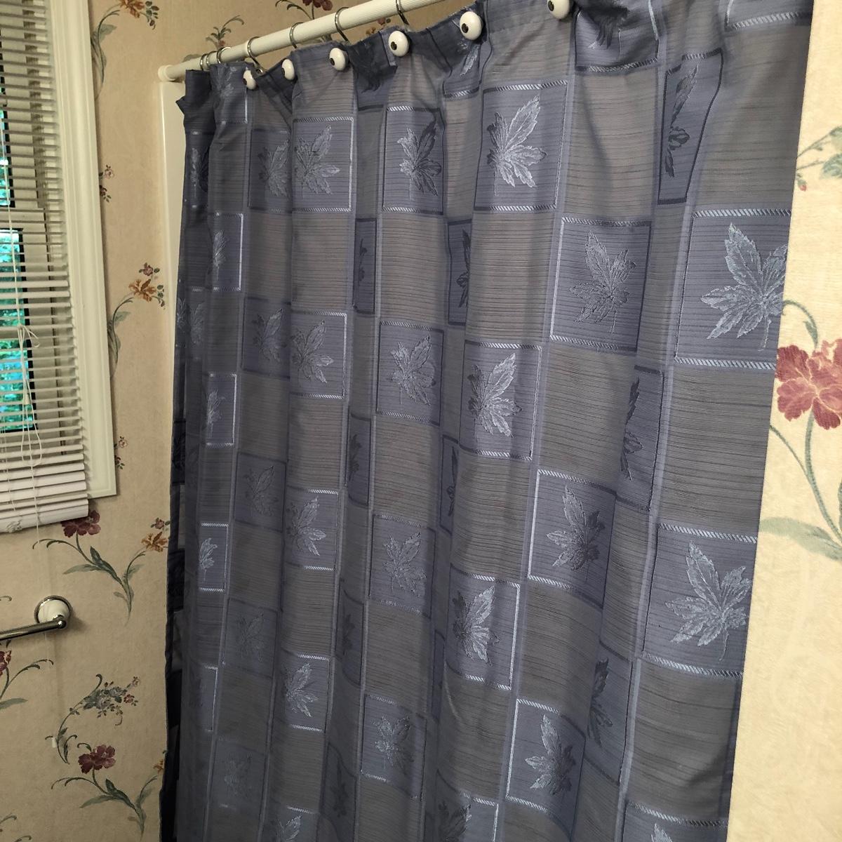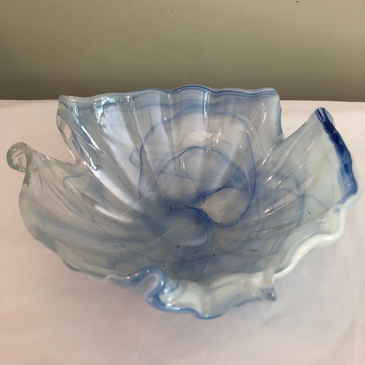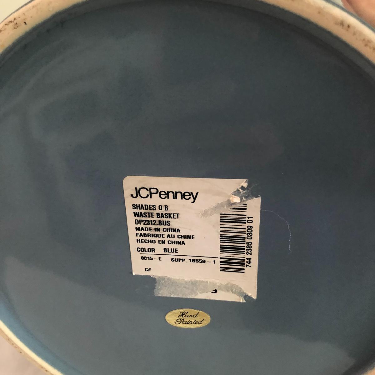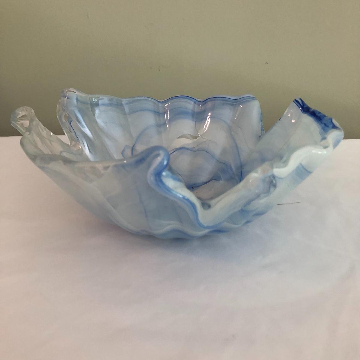 These bathroom essentials include 2 matching bath mats that measure 25” x 40”, 1 bath towel, a signed ornate ceramic pitcher, ceramic bin, shower curtain with hooks and glass bowl. All pieces perfectly compliment one another in this blue themed lot. The glass bowl in particular is very attractive with iridescent blue swirls throughout the glass, it measures 9.5” diameter x 3” tall.