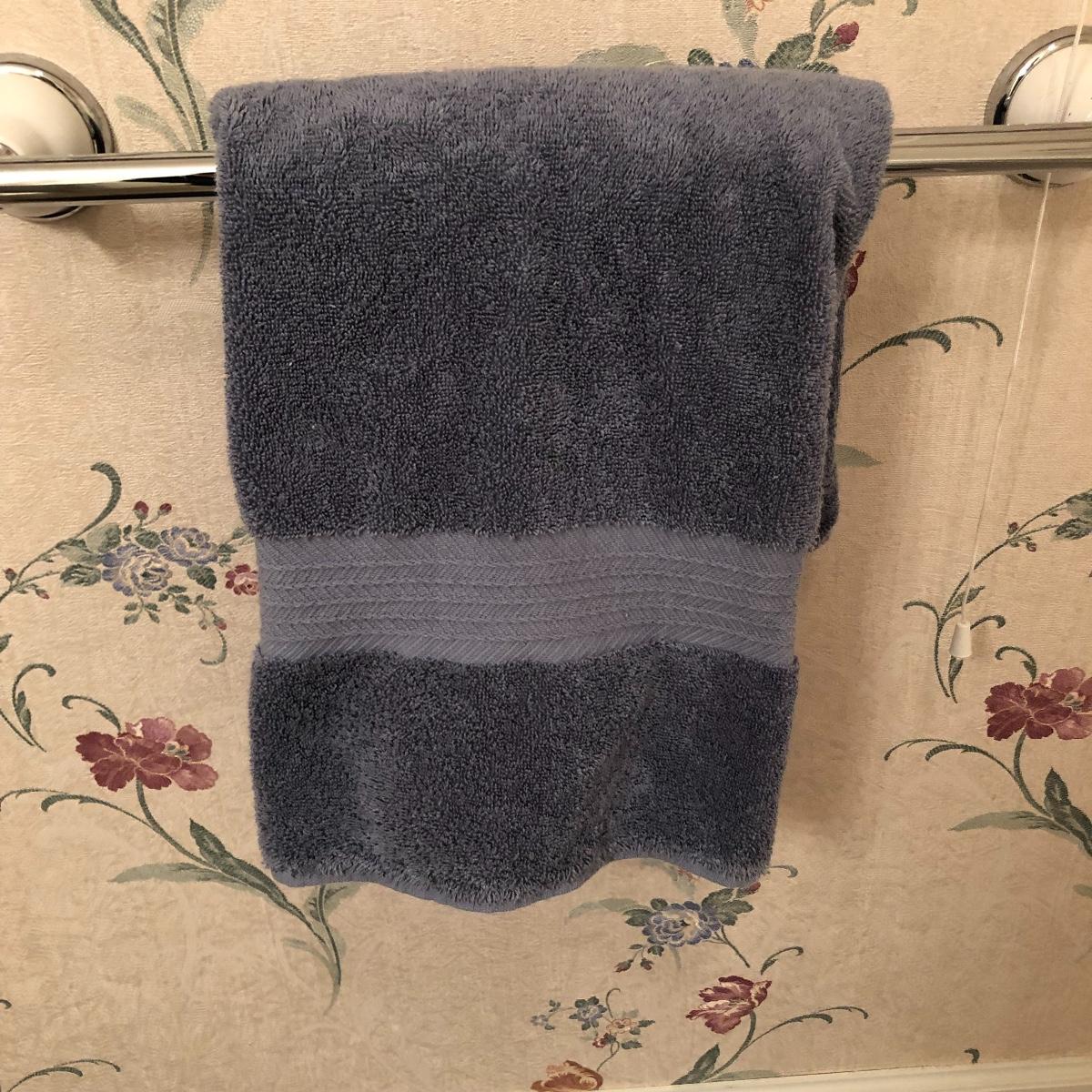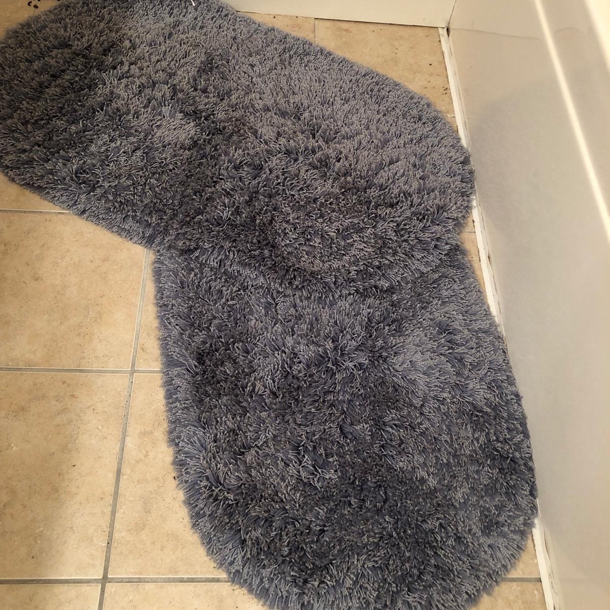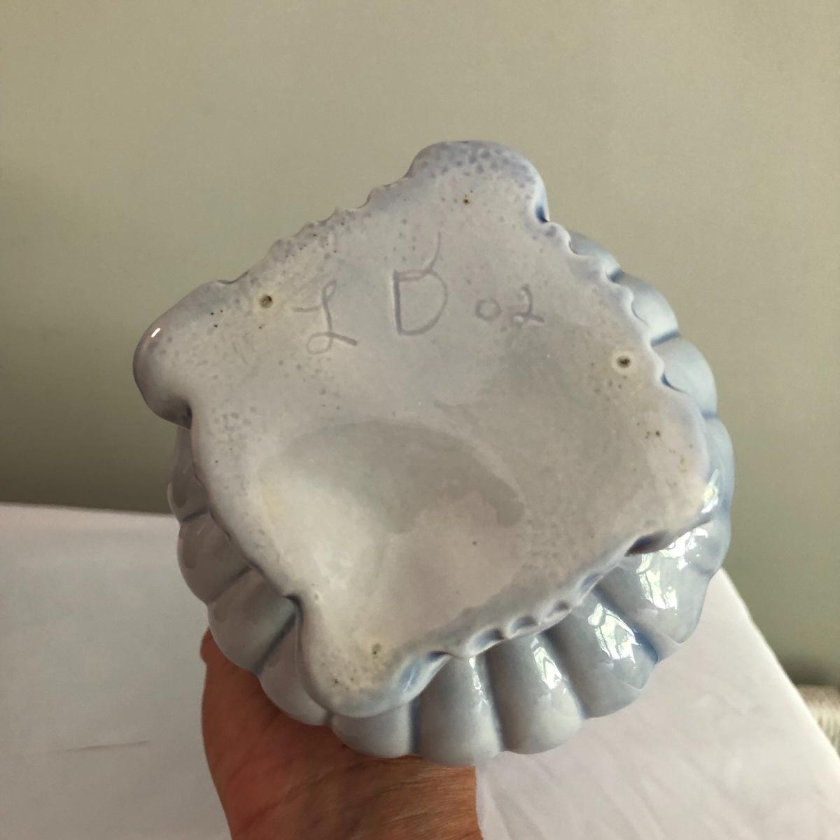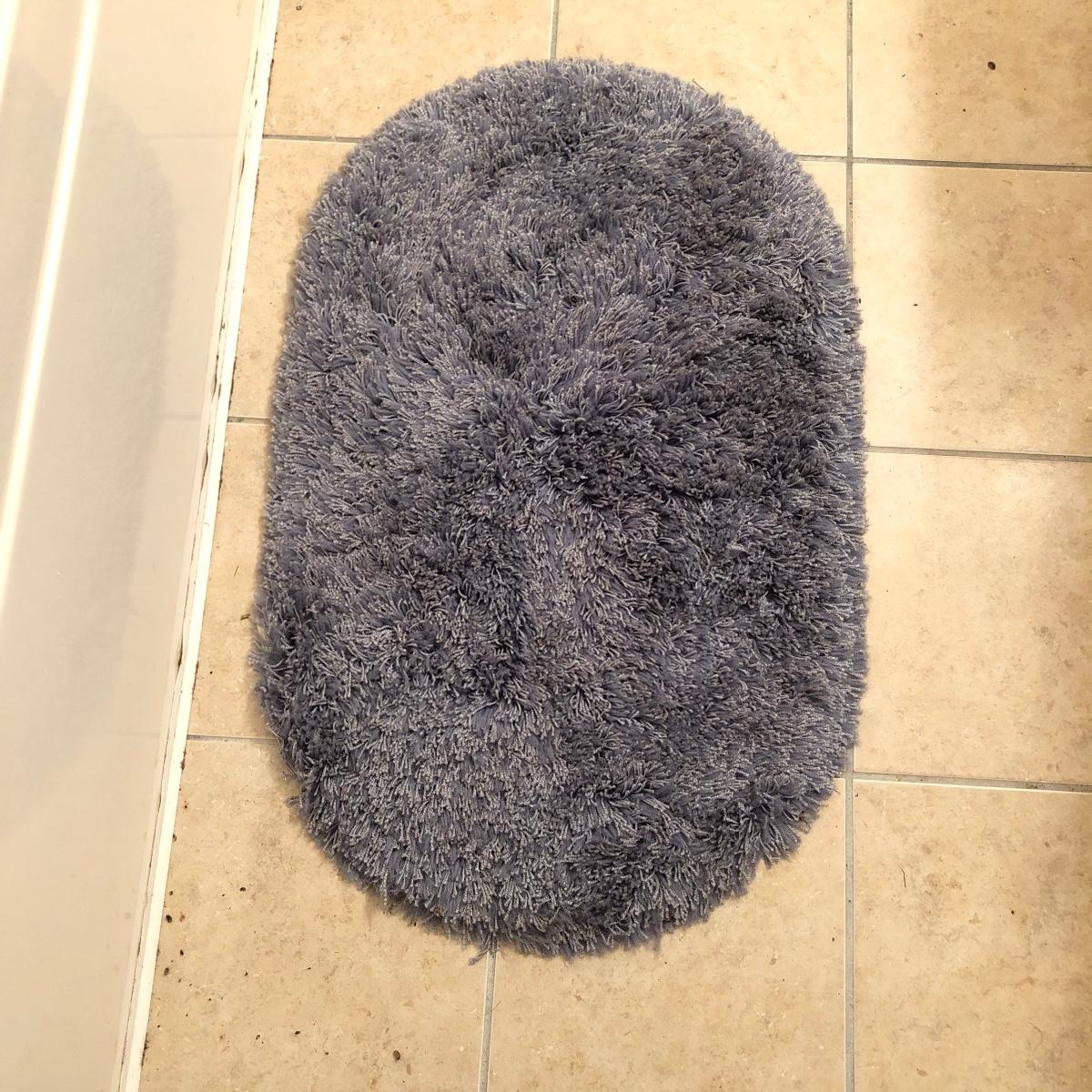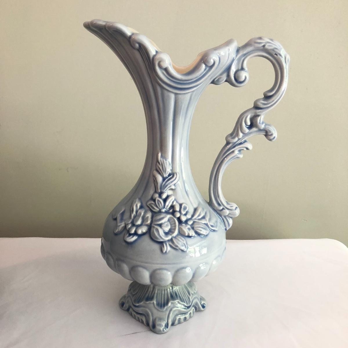 These bathroom essentials include 2 matching bath mats that measure 25” x 40”, 1 bath towel, a signed ornate ceramic pitcher, ceramic bin, shower curtain with hooks and glass bowl. All pieces perfectly compliment one another in this blue themed lot. The glass bowl in particular is very attractive with iridescent blue swirls throughout the glass, it measures 9.5” diameter x 3” tall.