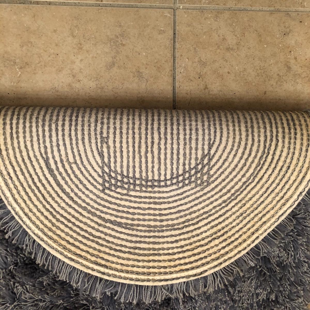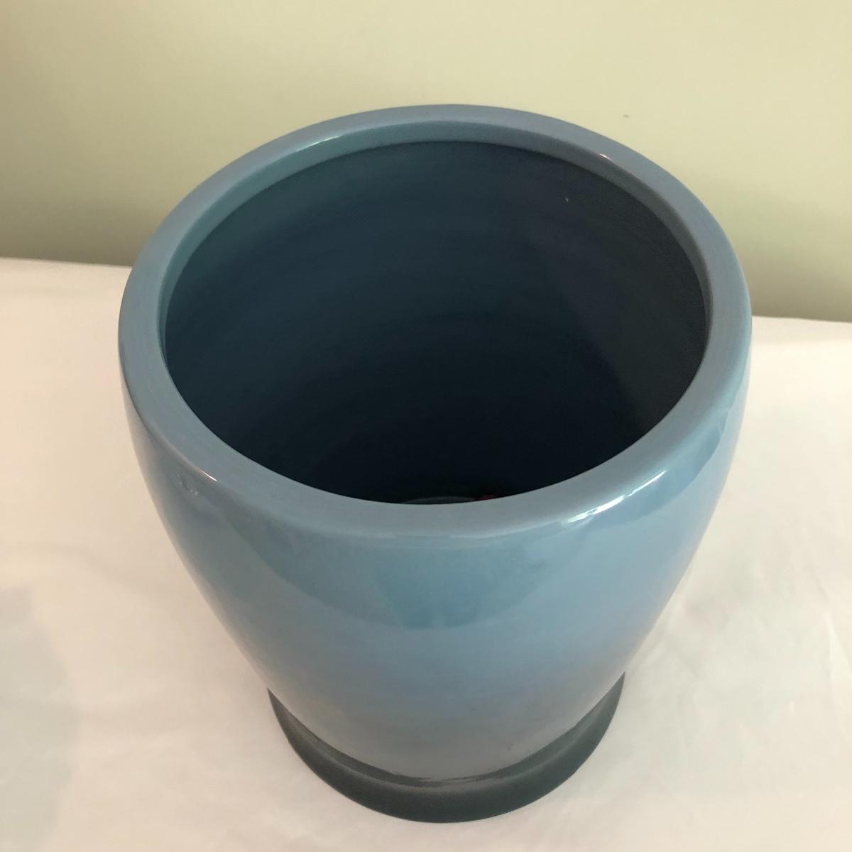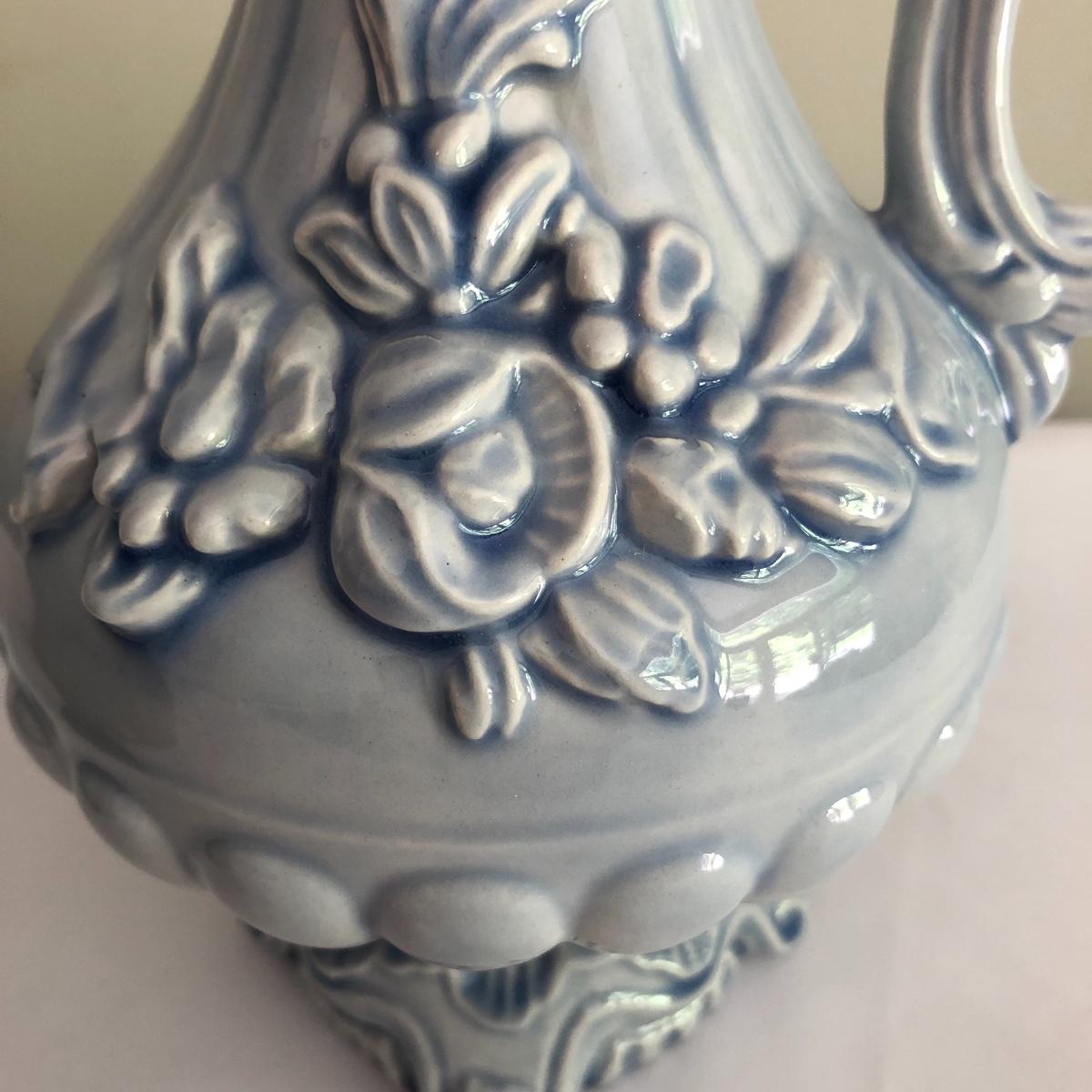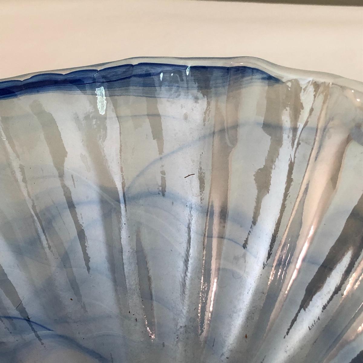 These bathroom essentials include 2 matching bath mats that measure 25” x 40”, 1 bath towel, a signed ornate ceramic pitcher, ceramic bin, shower curtain with hooks and glass bowl. All pieces perfectly compliment one another in this blue themed lot. The glass bowl in particular is very attractive with iridescent blue swirls throughout the glass, it measures 9.5” diameter x 3” tall.
