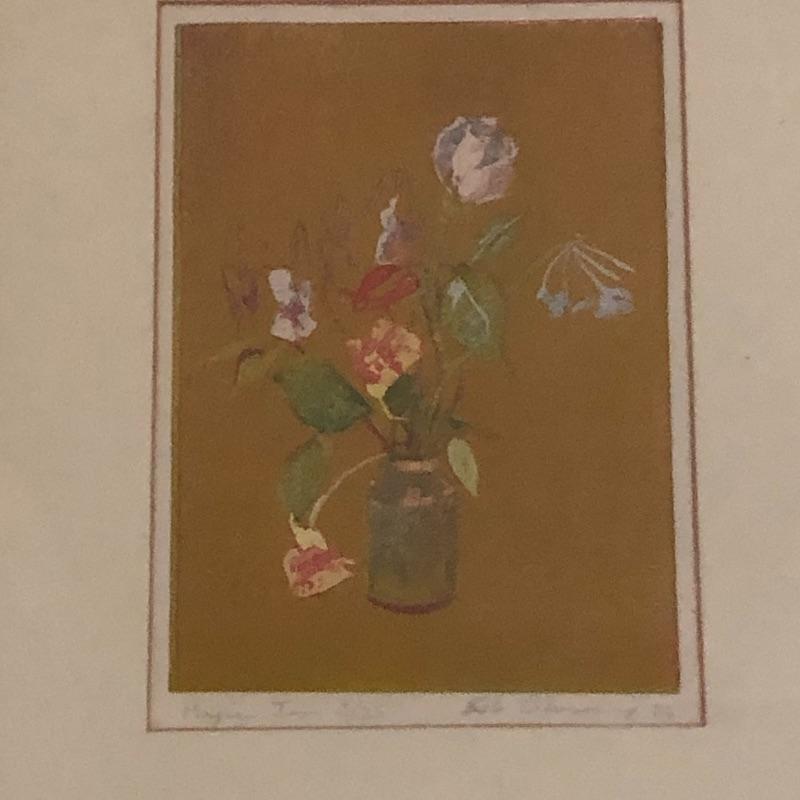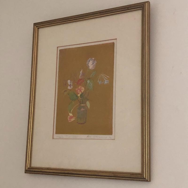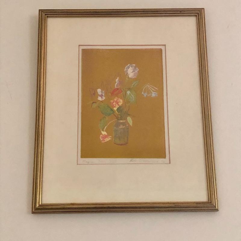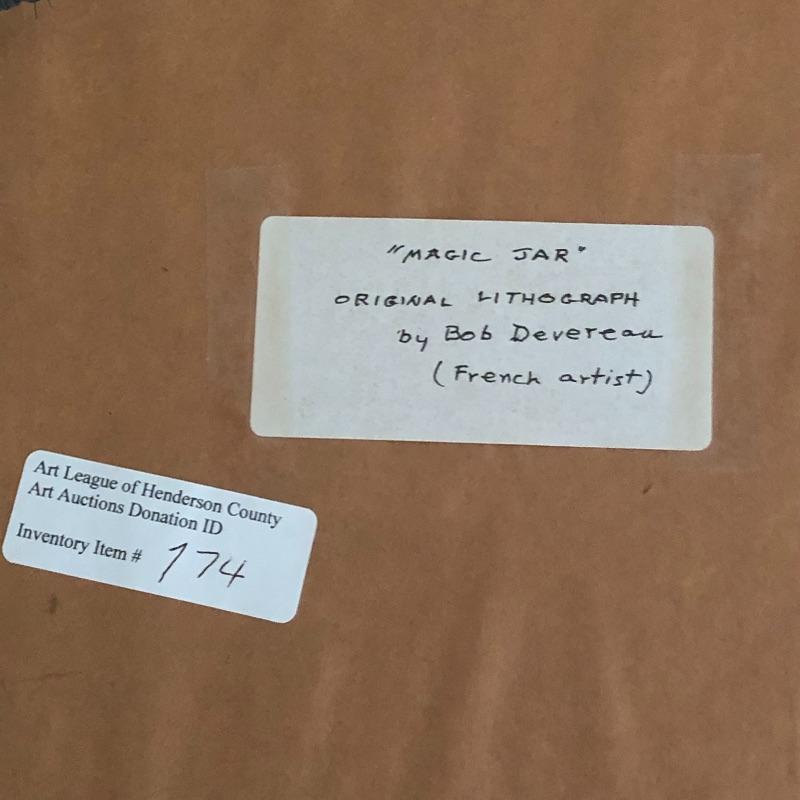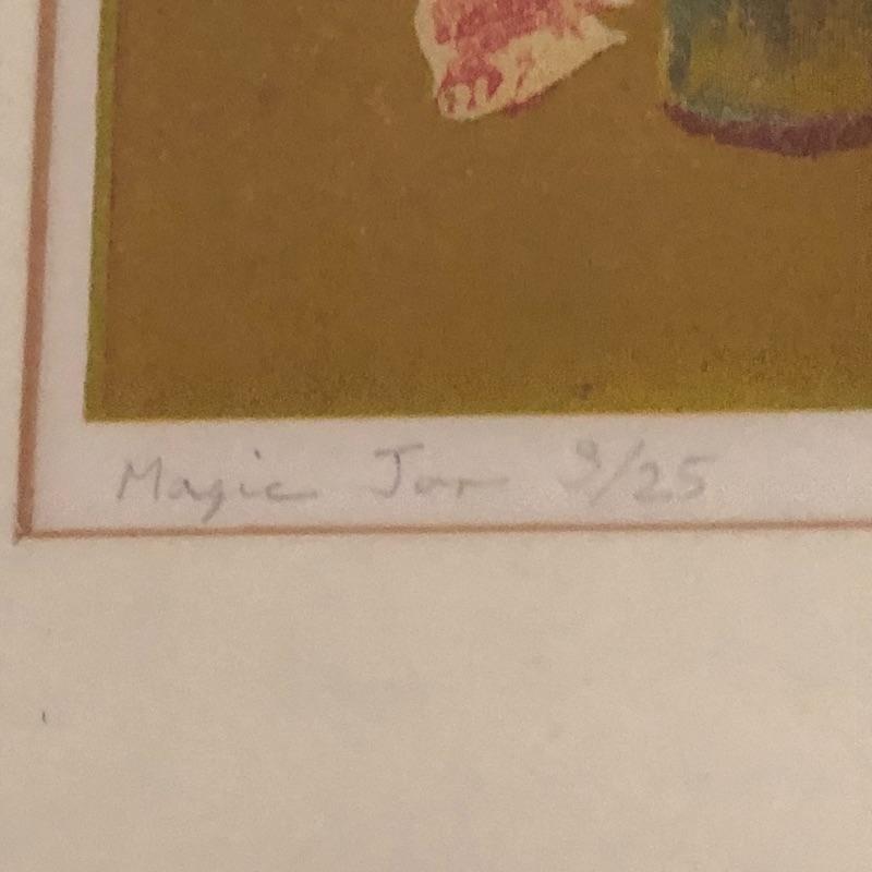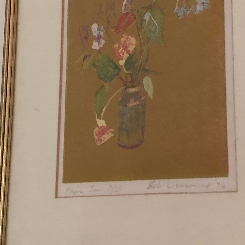 This piece by Bob Devereau is titled Magic Jam and numbered 3/25. This abstract vase of flowers lithograph is matted and mounted in a gold frame that perfectly compliments this lovely piece of art. It is pencil signed and under glass. You'll see some stickers on the back that appear to be from another auction.